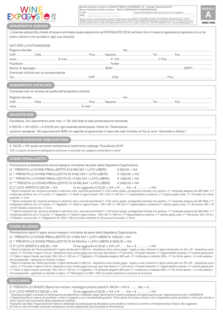 Bonifico bancario a favore di AREZZO FIERE E CONGRESSI Srl - Causale "ExpoGusto2016" Banca Valdichiana filiale di Arezzo - IBAN: IT46D0848914100000000370003 Il legale rappresentante della Ditta (timbro e firma leggibile) Luogo: _____________________________ Data: _____________________________ ANAGRAFICA AZIENDA Saranno prese in considerazione soltanto le "Domande di Ammissione" compilate e firmate conformemente alle prescrizioni, cui sia allegata ricevuta dell’avvenuto versamento degli importi (vedi Art.4 del regolamento generale e successivo art.15). Le Domande devono essere spedite presso la sede dell’organizzazione(vedi Art.2) o inviate a mezzo Fax +39 0575-383028 E-mail: [email protected] MODULO A AREA VINO L’Azienda sottoscritta chiede di essere ammessa quale espositrice ad EXPOGUSTO 2016 nell’Area Vino in base al regolamento generale di cui ha preso visione e che accetta in ogni sua clausola. DATI PER LA FATTURAZIONE: Ragione Sociale............................................................................................................. Via .................................................................................................... . CAP...................... Città ........................................................ Prov. ......... Nazione .......................................... Tel .................... Fax ..................................... . www.................................................. E-mail ................................................... P. IVA ............................................. C.Fisc....................................................... Facebook ....................................................................................................... Twitter ............................................................................................................... Banca di appoggio .................................................................................. IBAN .................................................................................... SWIFT........................ Eventuale indirizzo per la corrispondenza Via ........................................................................................ CAP ................... Città ......................................................... Prov. ............................................. ANAGRAFICA CATALOGO Compilare solo se diversa da quella dell’anagrafica azienda Ragione Sociale............................................................................................................. Via .................................................................................................... . CAP...................... Città ........................................................ Prov. ......... Nazione .......................................... Tel .................... Fax ..................................... . www.............................................................................. E-mail .................................................................................................................................................. INCONTRI B2B Facoltativa, fino esaurimento posti max. n° 30, farà fede la data presentazione domanda: € 200,00 + IVA (22%) = € 244,00 per ogni azienda partecipante. Nome Az. Partecipante..................................................................................................... . (saranno assegnati 4/6 appuntamenti B2B con agende programmate in base alle reali richieste al fine di unire “domanda e offerta”) QUOTA ISCRIZIONE OBBLIGATORIA € 150,00 + IVA quota iscrizione comprensiva inserimento catalogo “ExpoGusto 2016” N.B. La quota iscrizione è obbligatoria anche per le aziende che vogliano condividere lo stand STAND PREALLESTITI Prenotazione preallestimento senza impegno vincolante da parte della Segreteria Organizzativa: * PRENOTA LO STAND PREALLESTITO DI 6 MQ 3X2 1 LATO LIBERO € 850,00 + IVA ** PRENOTA LO STAND PREALLESTITO DI 9 MQ 3X3 1 LATO LIBERO € 1050,00 + IVA ** PRENOTA LO STAND PREALLESTITO DI 12 MQ 4X3 1 LATO LIBERO € 1350,00 + IVA *** PRENOTA LO STAND PREALLESTITO DI 24 MQ 6x4 1 LATO LIBERO € 2400,00 + IVA 2° LATO APERTO € 200,00 + IVA kw aggiuntivi € 25,00 + IVA x N°....... Kw = € ............. + IVA * Stand composto da: struttura portante in alluminio nero, pannelli perimetrali h. 2.50 colore grigio, portagrafica frontale con grafica, n°1 lampada alogena da 300 Watt, n°1 multipresa elettrica con n°3 uscite, n°1 Sgabello, n°1 Desk in legno lineare 100 x 50 x h 100 cm, n°1 Appendiabiti a sistema, n°1 cestino getta carte, n°1 Frontale con nome azienda, n° 3 kw. ** Stand composto da: struttura portante in alluminio nero, pannelli perimetrali h. 2.50 colore grigio, portagrafica frontale con grafica, n°1 lampada alogena da 300 Watt, n°1 multipresa elettrica con n°3 uscite, n°1 Sgabello, n°1 Desk in legno lineare 100 x 50 x h 100 cm,n°1 Appendiabiti a sistema,n°1 cestino getta carte, n°1 Scrivania 135 x 70 cm,N°3 Sedia a scocca blu, n° 3 kw. *** Stand composto da: struttura portante in alluminio nero, pannelli perimetrali h. 2.50 colore grigio, portagrafica frontale con grafica, n°1 lampada alogena da 300 Watt, n°1 multipresa elettrica con n°3 uscite, n°1 Sgabello, n°1 Desk in legno lineare 100 x 50 x h 100 cm, n°1 Appendiabiti a sistema, n°1 cestino getta carte, n°1 Scrivania 135 x 70 cm, n°3 Sedia a scocca blu, n°1 Magazzino cm 200 x 100 con porta completa di chiusura di sicurezza, n° 6 kw. STAND IN LEGNO Prenotazione stand in legno senza impegno vincolante da parte della Segreteria Organizzativa: * PRENOTA LO STAND PREALLESTITO DI 12 MQ 4X3 1 LATO LIBERO € 1500,00 + IVA ** PRENOTA LO STAND PREALLESTITO DI 24 MQ 6x4 1 LATO LIBERO € 2650,00 + IVA 2° LATO APERTO € 200,00 + IVA kw aggiuntivi € 25,00 + IVA x N°....... Kw = € ............. + IVA * Stand composto da: Pareti perimetrali in legno tamburato H 300 cm.- idropittura