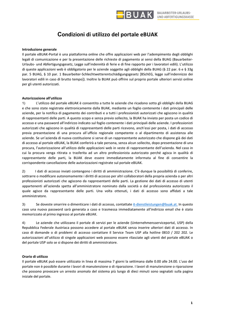 Condizioni di utilizzo del portale eBUAK Introduzione generale Il portale eBUAK-Portal è una piattaforma online che offre applicazioni web per l’adempimento degli obblighi legali di comunicazione e per la presentazione delle richieste di pagamento ai sensi della BUAG (BauarbeiterUrlaubs- und Abfertigungsgesetz, Legge sull’indennità di ferie e di fine rapporto per i lavoratori edili). L’utilizzo di queste applicazioni web è obbligatorio per le aziende soggette agli obblighi della BUAG (§ 22 par. 6 e § 33g par. 5 BUAG, § 10 par. 1 Bauarbeiter-Schlechtwetterentschädigungsgesetz [BSchEG, legge sull’indennizzo dei lavoratori edili in caso di brutto tempo]). Inoltre la BUAK può offrire sul proprio portale ulteriori servizi online per gli utenti autorizzati. Autorizzazione all’utilizzo 1) L’utilizzo del portale eBUAK è consentito a tutte le aziende che ricadono sotto gli obblighi della BUAG e che sono state registrate elettronicamente dalla BUAK, mediante un foglio contenente i dati principali delle aziende, per la notifica di pagamento dei contributi e a tutti i professionisti autorizzati che agiscono in qualità di rappresentanti delle parti. A questo scopo e senza previo sollecito, la BUAK ha inviato per posta un codice di accesso e una password all’indirizzo indicato sul foglio contenente i dati principali delle aziende. I professionisti autorizzati che agiscono in qualità di rappresentanti delle parti ricevono, anch’essi per posta, i dati di accesso previa presentazione di una procura all´ufficio regionale competente o al dipartimento di assistenza alle aziende. Se un’azienda di nuova costituzione si serve di un rappresentante autorizzato che dispone già dei dati di accesso al portale eBUAK, la BUAK conferirà a tale persona, senza alcun sollecito, dopo presentazione di una procura, l’autorizzazione all’utilizzo delle applicazioni web in veste di rappresentante dell’azienda. Nel caso in cui la procura venga ritirata o trasferita ad un altro professionista autorizzato perché agisca in qualità di rappresentante delle parti, la BUAK deve essere immediatamente informata al fine di consentire la corrispondente cancellazione delle autorizzazioni registrate sul portale eBUAK. 2) I dati di accesso inviati contengono i diritti di amministrazione. C’è dunque la possibilità di conferire, sottrarre o modificare autonomamente i diritti di accesso per altri collaboratori della propria azienda o per altri professionisti autorizzati che agiscono da rappresentanti delle parti. La gestione dei dati di accesso di utenti appartenenti all’azienda spetta all’amministratore nominato dalla società o dal professionista autorizzato il quale agisce da rappresentante delle parti. Una volta ottenuti, i dati di accesso sono affidati a tale amministratore. Se doveste smarrire o dimenticare i dati di accesso, contattate [email protected]. In questo caso una nuova password sarà generata a caso e trasmessa immediatamente all’indirizzo email che è stato memorizzato al primo ingresso al portale eBUAK. 3) 4) Le aziende che utilizzano il portale di servizi per le aziende (Unternehmensserviceportal, USP) della Repubblica Federale Austriaca possono accedere al portale eBUAK senza inserire ulteriori dati di accesso. In caso di domande o di problemi di accesso contattare il Service Team USP alla hotline 0810 / 202 202. Le autorizzazioni all’utilizzo di singole applicazioni web possono essere rilasciate agli utenti del portale eBUAK o del portale USP solo se si dispone dei diritti di amministratore. Orario di utilizzo Il portale eBUAK può essere utilizzato in linea di massima 7 giorni la settimana dalle 0.00 alle 24.00. L’uso del portale non è possibile durante i lavori di manutenzione o di riparazione. I lavori di manutenzione o riparazione che possono provocare un arresto anomalo del sistema più lungo di dieci minuti sono segnalati sulla pagina iniziale del portale. 1 Assistenza tecnica L’assistenza per la risoluzione di eventuali problemi tecnici è garantita dal lunedì al giovedì tra le 7.15 e le 16.00 e il venerdì dalle 7.15 alle 13.00. Si prega di inviare una descrizione dei problemi all’indirizzo [email protected]. E’ possibile ricevere assistenza tecnica anche telefonando al numero +43 (0) 57 95 79 interno diretto 1710 oppure interno diretto 1713. Dovere di diligenza/esonero da responsabilità 1) Gli utenti hanno l’obbligo di non divulgare username e password e di modificare la password ad intervalli regolari (almeno ogni sei mesi) per impedire che terzi possano accedere ai dati del portale eBUAK. Qualsiasi sospetto di uso improprio deve essere immediatamente comunicato alla BUAK. La BUAK declina qualsiasi responsabilità nei confronti degli utenti o di terzi per eventuali danni causati da un uso improprio delle applicazioni web. 2) La BUAK si riserva il diritto di bloccare l’accesso al proprio portale nel caso sospetti un uso improprio da parte di un utente. 3) La BUAK si impegna a ridurre quanto più è possibile eventuali problemi che potrebbero verificarsi a causa di guasti o incompatibilità quando si richiamano informazioni e applicazioni web. La BUAK non si assume nessuna responsabilità nel caso in cui il servizio non sia disponibile ininterrottamente o subisca danni di altro tipo. 4) La BUAK non si assume nessuna responsabilità per la completezza e la correttezza dei dati richiamati. In caso di divergenze tra i dati presentati sul sistema dell’utente e quelli indicati dalla BUAK valgono i dati della BUAK. 5) La BUAK risponde dei danni causati dal comportamento dei suoi collaboratori solo in caso di dolo o grave negligenza. 6) La BUAK tratta i dati personali in conformità alla legge sulla protezione dei dati (Datenschutzgesetz, DSG 2000). Compenso L’utilizzo delle applicazioni web del portale eBUAK è gratuito. Nota: In generale, i costi collegati all’utilizzo di internet non sono a carico della BUAK. Consenso Al primo ingresso l’utente