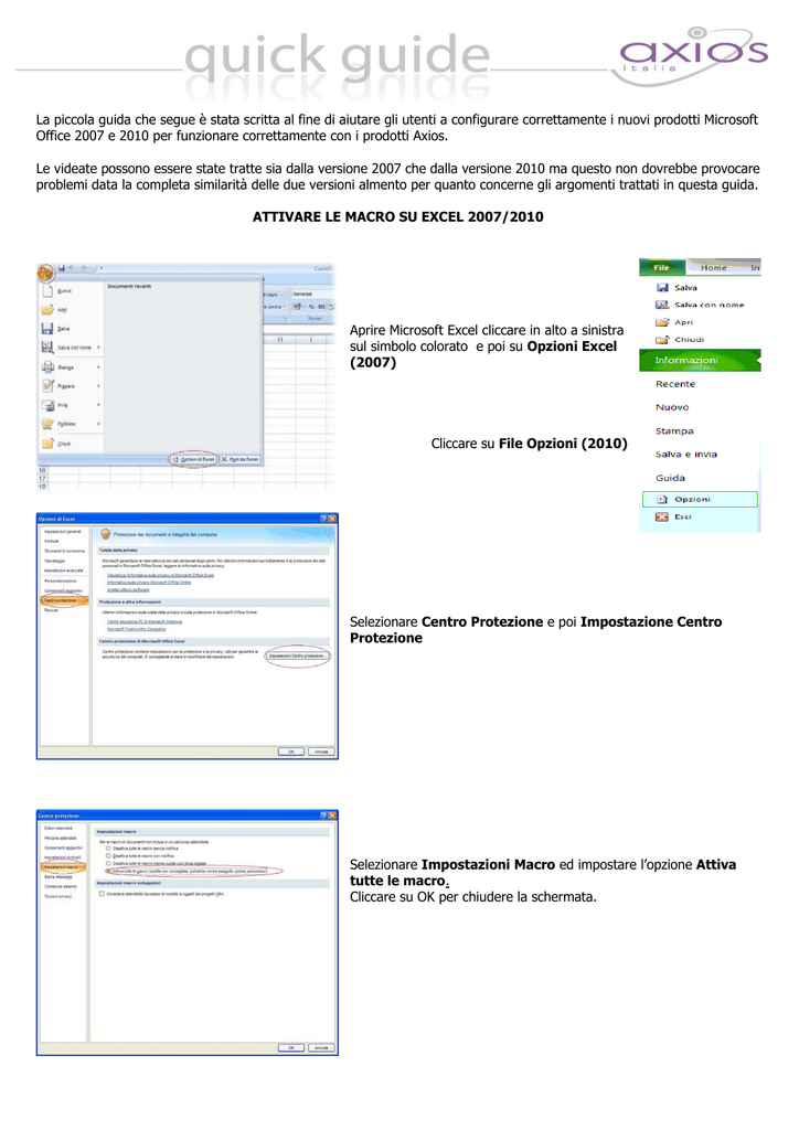 La piccola guida che segue è stata scritta al fine di aiutare gli utenti a configurare correttamente i nuovi prodotti Microsoft Office 2007 e 2010 per funzionare correttamente con i prodotti Axios. Le videate possono essere state tratte sia dalla versione 2007 che dalla versione 2010 ma questo non dovrebbe provocare problemi data la completa similarità delle due versioni almento per quanto concerne gli argomenti trattati in questa guida. ATTIVARE LE MACRO SU EXCEL 2007/2010 Aprire Microsoft Excel cliccare in alto a sinistra sul simbolo colorato e poi su Opzioni Excel (2007) Cliccare su File Opzioni (2010) Selezionare Centro Protezione e poi Impostazione Centro Protezione Selezionare Impostazioni Macro ed impostare l’opzione Attiva tutte le macro. Cliccare su OK per chiudere la schermata. PERCORSI ATTENDIBILI SU EXCEL (WORD) 2007/2010 Aprire Microsoft Excel cliccare in alto a sinistra sul simbolo colorato e poi su Opzioni Excel (2007) Cliccare su File Opzioni (2010) Selezionare Centro Protezione e poi Impostazione Centro Protezione Selezionare la voce Percorsi attendibili Impostare come percorso C:\AXIOS e spuntare la casella Considera attendibili anche le sottocartella di questo percorso e premere OK