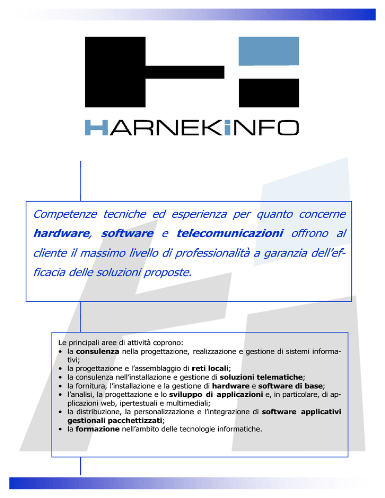 Competenze tecniche ed esperienza per quanto concerne hardware, software e telecomunicazioni offrono al cliente il massimo livello di professionalità a garanzia dell’efficacia delle soluzioni proposte. Le principali aree di attività coprono: • la consulenza nella progettazione, realizzazione e gestione di sistemi informativi; • la progettazione e l’assemblaggio di reti locali; • la consulenza nell’installazione e gestione di soluzioni telematiche; • la fornitura, l’installazione e la gestione di hardware e software di base; • l’analisi, la progettazione e lo sviluppo di applicazioni e, in particolare, di applicazioni web, ipertestuali e multimediali; • la distribuzione, la personalizzazione e l’integrazione di software applicativi gestionali pacchettizzati; • la formazione nell’ambito delle tecnologie informatiche. Consulenza HarnekInfo è attiva in ogni ambito connesso alla progettazione, riorganizzazione e gestione dei sistemi informativi per aziende ed enti pubblici: • l’analisi dello stato attuale; • l’analisi e la formalizzazione dei requisiti per gli interventi sul sistema informativo con individuazione delle priorità; • la formulazione di un progetto per la realizzazione, la riorganizzazione o l’aggiornamento del sistema informativo (in termini di impianto elettrico, rete di comunicazione, hardware, software di base, software applicativi, costituzione di basi di dati, connessioni telematiche, formazione del personale…); • la formulazione della documentazione per l’eventuale richiesta di finanziamenti; • la formulazione della documentazione per la gestione delle gare per l’aggiudicazione delle forniture; • la gestione dei fornitori (ordini, solleciti, collaudi, eventuale rendicontazione, stati di avanzamento…). Fornitura di HW e SW di Base HarnekInfo, grazie alla collaborazione con i principali distributori nazionali, è in grado di fornire ai propri clienti, installare e configurare hardware e software di base delle migliori marche garantendo elevati standard qualitativi uniti a condizioni economiche vantaggiose. Assistenza HW e SW HarnekInfo è in grado di garantire ai clienti assistenza tecnica su hardware e software di base per server, personal computer e periferiche su piattaforma Microsoft allo scopo di fornire la più ampia copertura a tutte le loro esigenze in merito all’utilizzo delle attrezzature informatiche. SW Applicativo HarnekInfo (Microsoft Partner) dispone di notevoli competenze in tutte le fasi del processo di sviluppo di software applicativo: definizione dei requisiti, stesura delle specifiche, progettazione, realizzazione, testing, installazione, avvio dell’applicazione. Gli ambienti di sviluppo impiegati comprendono .NET Framework, ASP.NET, SQL Server, Visual Basic, Visual C++, Visual InterDev, Access, FrontPage. HarnekInfo realizza e distribuisce e soluzioni standard pacchettizzate (ERP, CRM…) caratterizzate da affidabilità, facilità d’uso e piattaforma di grande diffusione (reti Microsoft). Formazione HarnekInfo dispone di personale altamente qualificato nel settore informatico e che può vantare esperienze di docenza a vari livelli: in università, in corsi finanziati dalla Comunità Europea nell’ambito del Fondo Sociale Europeo, nei Centri di Formazione Professionale della Regione Lombardia. HarnekInfo è quindi in grado di proporre ai propri clienti corsi rivolti agli operatori per l’avviamento all’utilizzo delle nuove tecnologie o il perfezionamento delle competenze già acquisite. HarnekInfo s.r.l. - piazza SS. Redentore, 12 - 24067 Sarnico BG - tel: 035 912440 - fax: 035 4261228 email: [email protected] - web: www.harnekinfo.it