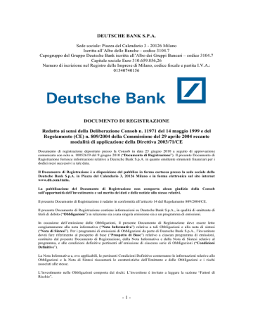 DEUTSCHE BANK S.P.A. Sede sociale: Piazza del Calendario 3 - 20126 Milano Iscritta all’Albo delle Banche – codice 3104.7 Capogruppo del Gruppo Deutsche Bank iscritta all’Albo dei Gruppi Bancari – codice 3104.7 Capitale sociale Euro 310.659.856,26 Numero di iscrizione nel Registro delle Imprese di Milano, codice fiscale e partita I.V.A.: 01340740156 DOCUMENTO DI REGISTRAZIONE Redatto ai sensi della Deliberazione Consob n. 11971 del 14 maggio 1999 e del Regolamento (CE) n. 809/2004 della Commissione del 29 aprile 2004 recante modalità di applicazione della Direttiva 2003/71/CE Documento di registrazione depositato presso la Consob in data 25 giugno 2010 a seguito di approvazione comunicata con nota n. 10052619 del 9 giugno 2010 (“Documento di Registrazione”). Il presente Documento di Registrazione fornisce informazioni relative a Deutsche Bank S.p.A. in quanto emittente strumenti finanziari per i dodici mesi successivi a tale data. Il Documento di Registrazione è a disposizione del pubblico in forma cartacea presso la sede sociale della Deutsche Bank S.p.A. in Piazza del Calendario 3, 20126 Milano e in forma elettronica sul sito internet www.db.com/italia. La pubblicazione del Documento di Registrazione non comporta alcun giudizio della Consob sull’opportunità dell’investimento e sul merito dei dati e delle notizie allo stesso relativi. Il presente Documento di Registrazione è redatto in conformità all’articolo 14 del Regolamento 809/2004/CE. Il presente Documento di Registrazione contiene informazioni su Deutsche Bank S.p.A., in qualità di emittente di titoli di debito (“Obbligazioni”) in relazione sia a una singola emissione sia a un programma di emissioni. In occasione dell’emissione delle Obbligazioni, il presente Documento di Registrazione deve essere letto congiuntamente alla nota informativa (“Nota Informativa”) relativa a tali Obbligazioni e alla nota di sintesi (“Nota di Sintesi”). Per i programmi di emissioni di Obbligazioni da parte di Deutsche Bank S.p.A., l’investitore dovrà fare riferimento al prospetto di base (“Prospetto di Base”) relativo a ciascun programma di emissioni, costituito dal presente Documento di Registrazione, dalla Nota Informativa e dalla Nota di Sintesi relative al programma, e alle condizioni definitive pertinenti all’emissione di ciascuna serie di Obbligazioni (“Condizioni Definitive”). La Nota Informativa e, ove applicabili, le pertinenti Condizioni Definitive conterranno le informazioni relative alle Obbligazioni e la Nota di Sintesi riassumerà le caratteristiche dell’Emittente e delle Obbligazioni e i rischi associati alle stesse. L’investimento nelle Obbligazioni comporta dei rischi. L’investitore è invitato a leggere la sezione “Fattori di Rischio”. -1- INDICE INDICE............................................................................................................................................................... 2 DEFINIZIONI ................................................................................................................................................... 4 GLOSSARIO ..................................................................................................................................................... 5 1. PERSONE RESPONSABILI .................................................................................................................. 7 1.1 INDICAZIONE DELLE PERSONE RESPONSABILI ...................................................................................... 7 1.2 DICHIARAZIONE DELLE PERSONE RESPONSABILI ................................................................................. 7 2. REVISORE LEGALE DEI CONTI ...................................................................................................... 8 2.1 REVISORI LEGALI DELL’EMITTENTE ..................................................................................................... 8 2.2 INFORMAZIONI SUI RAPPORTI CON LA SOCIETÀ DI REVISIONE ............................................................. 8 3. FATTORI DI RISCHIO .......................................................................................................................... 9 3.1 RISCHIO DI CREDITO .............................................................................................................................. 9 3.2 RISCHIO LEGALE .................................................................................................................................... 9 3.3 RISCHIO CORRELATO ALL’ASSENZA DI RATING .................................................................................. 10 3.4 RISCHIO DI MERCATO .......................................................................................................................... 10 3.5 INFORMAZIONI FINANZIARIE SELEZIONATE RELATIVE ALL’EMITTENTE ........................................... 11 4. INFORMAZIONI SULL’EMITTENTE............................................................................................. 14 4.1 STORIA ED EVOLUZIONE DELL’EMITTENTE ........................................................................................ 14 4.1.1 Denominazione legale................................................................................................................. 14 4.1.2 Luogo di registrazione dell’Emittente e suo numero di registrazione ..................................... 14 4.1.3 Data di costituzione e durata dell’Emittente.............................................................................. 14 4.1.4 Storia e sviluppo dell’Emittente ................................................................................................. 14 4.1.5 Domicilio e forma giuridica dell’Emittente, legislazione in base alla quale opera, paese di costituzione, indirizzo e numero di telefono della sede sociale............................................................. 16 4.1.6 Fatti recenti veri