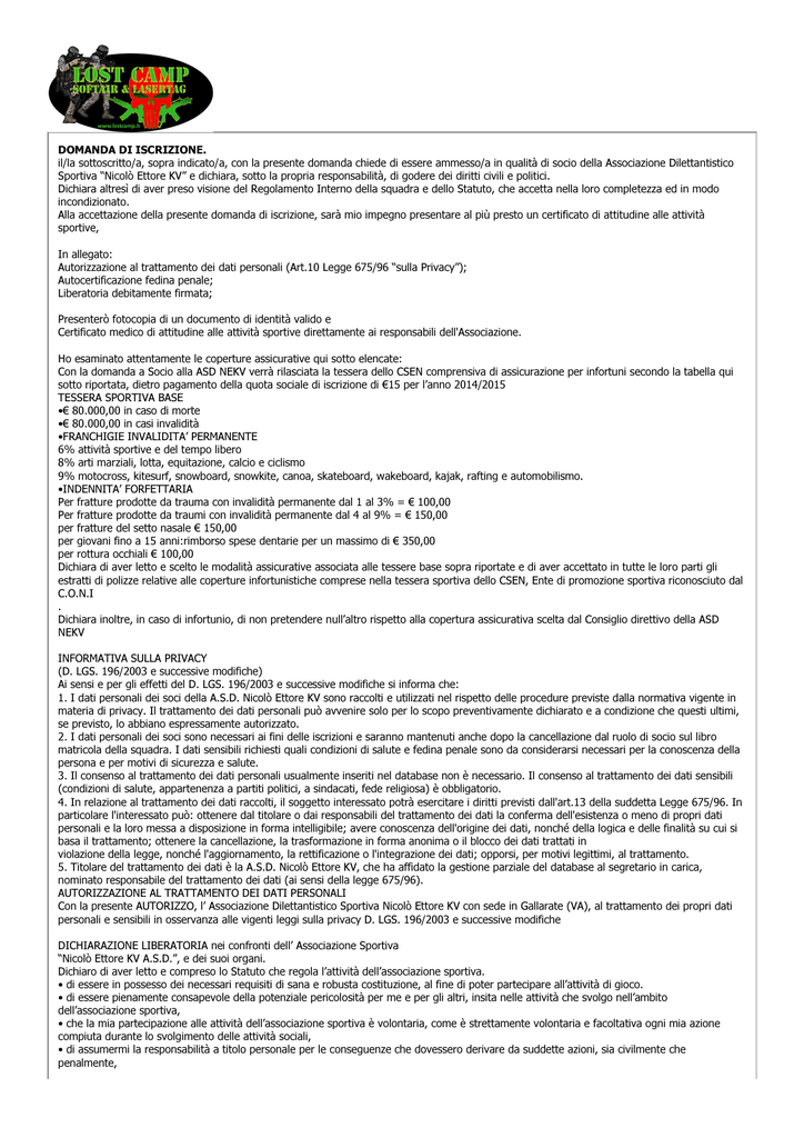 DOMANDA DI ISCRIZIONE. il/la sottoscritto/a, sopra indicato/a, con la presente domanda chiede di essere ammesso/a in qualità di socio della Associazione Dilettantistico Sportiva “Nicolò Ettore KV” e dichiara, sotto la propria responsabilità, di godere dei diritti civili e politici. Dichiara altresì di aver preso visione del Regolamento Interno della squadra e dello Statuto, che accetta nella loro completezza ed in modo incondizionato. Alla accettazione della presente domanda di iscrizione, sarà mio impegno presentare al più presto un certificato di attitudine alle attività sportive, In allegato: Autorizzazione al trattamento dei dati personali (Art.10 Legge 675/96 “sulla Privacy”); Autocertificazione fedina penale; Liberatoria debitamente firmata; Presenterò fotocopia di un documento di identità valido e Certificato medico di attitudine alle attività sportive direttamente ai responsabili dell'Associazione. Ho esaminato attentamente le coperture assicurative qui sotto elencate: Con la domanda a Socio alla ASD NEKV verrà rilasciata la tessera dello CSEN comprensiva di assicurazione per infortuni secondo la tabella qui sotto riportata, dietro pagamento della quota sociale di iscrizione di €15 per l’anno 2014/2015 TESSERA SPORTIVA BASE •€ 80.000,00 in caso di morte •€ 80.000,00 in casi invalidità •FRANCHIGIE INVALIDITA’ PERMANENTE 6% attività sportive e del tempo libero 8% arti marziali, lotta, equitazione, calcio e ciclismo 9% motocross, kitesurf, snowboard, snowkite, canoa, skateboard, wakeboard, kajak, rafting e automobilismo. •INDENNITA’ FORFETTARIA Per fratture prodotte da trauma con invalidità permanente dal 1 al 3% = € 100,00 Per fratture prodotte da traumi con invalidità permanente dal 4 al 9% = € 150,00 per fratture del setto nasale € 150,00 per giovani fino a 15 anni:rimborso spese dentarie per un massimo di € 350,00 per rottura occhiali € 100,00 Dichiara di aver letto e scelto le modalità assicurative associata alle tessere base sopra riportate e di aver accettato in tutte le loro parti gli estratti di polizze relative alle coperture infortunistiche comprese nella tessera sportiva dello CSEN, Ente di promozione sportiva riconosciuto dal C.O.N.I . Dichiara inoltre, in caso di infortunio, di non pretendere null’altro rispetto alla copertura assicurativa scelta dal Consiglio direttivo della ASD NEKV INFORMATIVA SULLA PRIVACY (D. LGS. 196/2003 e successive modifiche) Ai sensi e per gli effetti del D. LGS. 196/2003 e successive modifiche si informa che: 1. I dati personali dei soci della A.S.D. Nicolò Ettore KV sono raccolti e utilizzati nel rispetto delle procedure previste dalla normativa vigente in materia di privacy. Il trattamento dei dati personali può avvenire solo per lo scopo preventivamente dichiarato e a condizione che questi ultimi, se previsto, lo abbiano espressamente autorizzato. 2. I dati personali dei soci sono necessari ai fini delle iscrizioni e saranno mantenuti anche dopo la cancellazione dal ruolo di socio sul libro matricola della squadra. I dati sensibili richiesti quali condizioni di salute e fedina penale sono da considerarsi necessari per la conoscenza della persona e per motivi di sicurezza e salute. 3. Il consenso al trattamento dei dati personali usualmente inseriti nel database non è necessario. Il consenso al trattamento dei dati sensibili (condizioni di salute, appartenenza a partiti politici, a sindacati, fede religiosa) è obbligatorio. 4. In relazione al trattamento dei dati raccolti, il soggetto interessato potrà esercitare i diritti previsti dall'art.13 della suddetta Legge 675/96. In particolare l'interessato può: ottenere dal titolare o dai responsabili del trattamento dei dati la conferma dell'esistenza o meno di propri dati personali e la loro messa a disposizione in forma intelligibile; avere conoscenza dell'origine dei dati, nonché della logica e delle finalità su cui si basa il trattamento; ottenere la cancellazione, la trasformazione in forma anonima o il blocco dei dati trattati in violazione della legge, nonché l'aggiornamento, la rettificazione o l'integrazione dei dati; opporsi, per motivi legittimi, al trattamento. 5. Titolare del trattamento dei dati è la A.S.D. Nicolò Ettore KV, che ha affidato la gestione parziale del database al segretario in carica, nominato responsabile del trattamento dei dati (ai sensi della legge 675/96). AUTORIZZAZIONE AL TRATTAMENTO DEI DATI PERSONALI Con la presente AUTORIZZO, l’ Associazione Dilettantistico Sportiva Nicolò Ettore KV con sede in Gallarate (VA), al trattamento dei propri dati personali e sensibili in osservanza alle vigenti leggi sulla privacy D. LGS. 196/2003 e successive modifiche DICHIARAZIONE LIBERATORIA nei confronti dell’ Associazione Sportiva “Nicolò Ettore KV A.S.D.”, e dei suoi organi. Dichiaro di aver letto e compreso lo Statuto che regola l’attività dell’associazione sportiva. • di essere in possesso dei necessari requisiti di sana e robusta costituzione, al fine di poter partecipare all’attività di gioco. • di essere pienamente consapevole della potenziale pericolosità per me e per gli altri, insita nelle attività che svolgo nell’ambito dell’associazione sportiva, • che la mia partecipazione alle attività dell’associazione sportiva è volontaria, come è strettamente volontaria e facoltativa ogni mia azione compiuta durante lo svolgimento delle attività sociali, • di assumermi la responsabilità a titolo personale per le conseguenze che dovessero derivare da suddette azioni, sia civilmente che penalmente, • di essere a conoscenza di tutte le normative di legge vigenti inerenti la pratica del gioco denominato Soft-Air e di tutte le normative inerenti l’uso degli strumenti di gioco, in particolare: repliche giocattolo ad aria compressa per la pratica specifica del Soft-Air. • che sono a conoscenza di tutte le regole sulla sicurezza che disciplinano le attività dell’associa