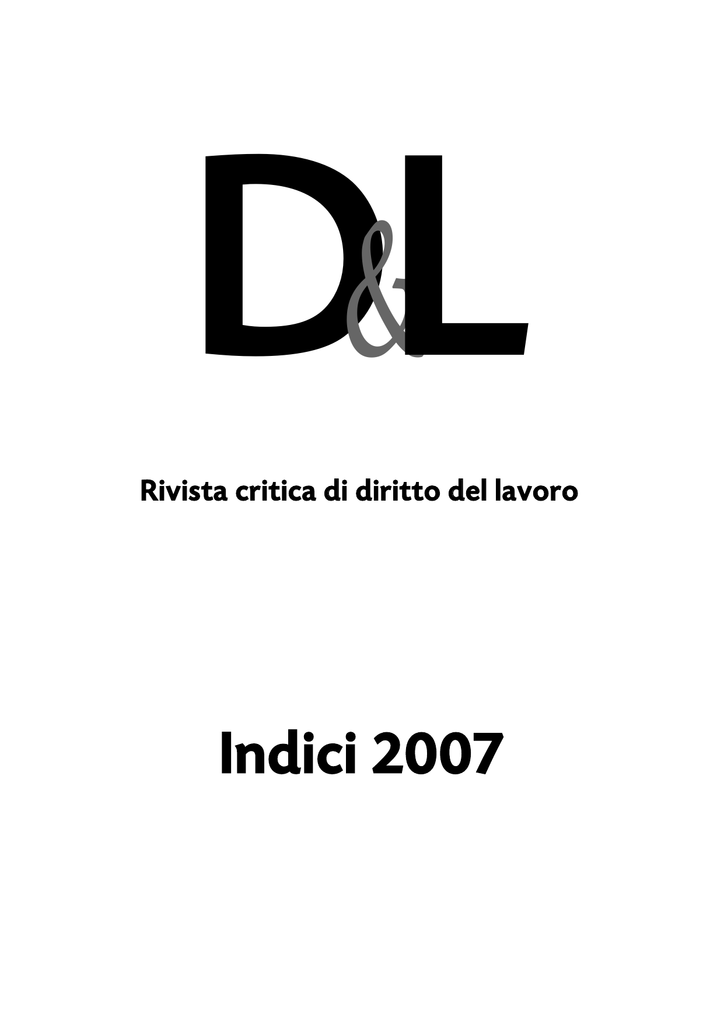 D&L Rivista critica di diritto del lavoro Indici 2007 Direzione: Alberto Guariso (direttore responsabile), Stefano Chiusolo, Lorenzo Franceschinis Comitato di redazione: Fabrizio Amato, Maurizio Borali, Giuseppe Bronzini, Filippo Capurro, Luigi De Andreis, Michele Di Lecce, Sergio Mattone, Roberto Muggia, Stefano Muggia, Giampaolo Muntoni, Giovanni Paganuzzi, Marco Pivetti, Renato Scorcelli Segreteria di redazione: Tinina Rosboch e Susanna Marchesin Hanno collaborato ai fascicoli di quest’annata: Pier Giovanni Alleva, Lisa Amoriello, Chiara Asta, Angelo Beretta, Giovanni Luca Bertone, Davide Bonsignorio, Luce Bonzano, Andrea Bordone, Giuseppe Bulgarini d'Elci, Enrico U. M. Cafiero, Martino Canal, Alba Civitelli, Valentina Civitelli, Nicola Coccia, Andrea Danilo Conte, Giuseppe Cordedda, Alessandro Corrado, Marco De Giorgi, Giancarlo Esposti, Carlo Facile, Vincenzo Ferrante, Emanuela Fiorini, Aldo Garlatti, Marzia Giovannini, Stefano Giubboni, Sara Huge, Andrea Leone D'Agata, Emanuela Maggiore, Francesca Malzani, Chiara Mancini, Antonio Manna, Marcella Mensi, Mario Meucci, Ulpiano Morcavallo, Alvise Moro, Francesca Mugnaini, Roberto Muller, Roberta Maddalena Paris, Matteo Paulli, Ferdinando Perone, Paolo Perucco, Marco Peruzzi, Valeria Piccone, Eleonora Pini, Filippo Pirelli, Eugenio Polizzi, Davide Pollastro, Valentina Remida, Roberto Riverso, Irene Romoli, Monica Rota, Sara Russi, Maddalena Russo, Carmen Schettini, Yara Serafini, Angelo Sica, Patrizia Testa, Alberto Vescovini, Chiara Zambrelli, Luigi Zezza Inchiostro Rosso coop. a r.l. 20121 Milano - via San Prospero, 4 tel. 02.36582498 r. a. - fax 02.36582594 [email protected] Abbonamento 2008: quattro numeri e indice annuale Per i magistrati un numero singolo un numero arretrato indice dell’annata un’annata completa arretrata € 140 € 75 € 39 € 39 € 39 € 155 Pagamento a favore dell’editore Inchiostro Rosso coop. a r.l c/c postale n. 24707200 oppure bonifico bancario sul c.c. n. 571 della Banca Popolare Commercio & Industria Ag. 76 Mi - CIN A - ABI 05048 - CAB 01629 Codice IBAN IT93 A050 4801 6290 0000 0000 571 BIC POCHTML076 Gli abbonamenti decorrono comunque dal 1° gennaio, anche se effettuati nel corso dell’anno. Per ragioni amministrative gli abbonamenti non disdetti entro il 31/3/2008 sono considerati automaticamente rinnovati. I fascicoli non pervenuti all’abbonato, se richiesti entro 30 giorni dal ricevimento del fascicolo immediatamente successivo, verranno rispediti senza alcun addebito; decorso tale termine, si rispediranno solo dietro pagamento dell’importo relativo a un singolo fascicolo maggiorato di spese postali. Spedizione in abbonamento postale - 45% - art. 2, comma 20/B, legge 662/96, Filiale di Milano Registrazione n. 46 Tribunale di Milano 25/1/1992 Questo periodico è associato alla Unione Stampa Periodica Italiana Finito di stampare nel mese di gennaio 2008 presso Grafiche Speed 2000 – Milano Sommario Sommario Interventi Pier Giovanni Alleva Nuove norme per il superamento del precariato e la dignità del lavoro Giovanni Luca Bertone Danno esistenziale e onere della prova alla luce di alcune recenti pronunce della Suprema Corte Giuseppe Bronzini Dodici noterelle sul Green paper Giuseppe Bronzini e Valeria Piccone Le Corti sovranazionali e il Parlamento europeo insistono per l’«efficacia anticipata» della Carta di Nizza Giuseppe Bronzini e Valeria Piccone Diritto di sciopero e libertà di circolazione nelle recenti conclusioni degli Avvocati Generali Alessandro Corrado La riforma della legge fallimentare: le implicazioni giuslavoristiche del D. Lgs. 5/06; parte quarta: primi orientamenti Marco De Giorgi Nota sul «tramviere extracomunitario» Stefano Giubboni Infortunio, malattia professionale e risarcimento del danno differenziale Mario Meucci Ricondotta a unitarietà la disciplina del licenziamento dei dirigenti Mario Meucci Alcuni punti fermi in tema di oneri probatori del demansionamento e del mobbing Valentina Remida La Legge organica 3/07 per l’eguaglianza effettiva di donne e uomini: un decisivo passo in avanti della Spagna verso la parità di genere Roberto Riverso Il cantiere delle riforme processuali: occorre maggiore attenzione e coraggio per il settore previdenziale Chiara Zambrelli La nuova normativa sulla forma delle dimissioni p. 47 » 25 » 9 » 319 » 619 » 17 » 977 » 331 » 33 » 631 » 335 » 997 » 989 Note a sentenza Calcolo oggi e pago domani: lo strano destino del trattamento di fine rapporto dei dipendenti postali (C. Schettini) V » 74 Il diritto di difesa ex art. 7 SL (E. Pini) Diritti sindacali e cessione di ramo d’azienda (C. Asta) Le assemblee itineranti (A. Leone D’Agata) Diritto di accesso delle Rsu nei luoghi di lavoro (A. Vescovini) Inadempimento di obblighi assunti con accordi collettivi e comportamento antisindacale (R. Muller) Contratto a progetto: conseguenze in caso di indicazione generica e indeterminata dell’oggetto (A. Beretta) Prova delle ragioni del contratto a termine (A. Vescovini) Le ragioni che legittimano il ricorso alla somministrazione di lavoro a termine: onere probatorio del soggetto utilizzatore e poteri di accertamento del giudice (G. Cordedda) Composizione delle commissioni di concorso nella selezione pubblica e tutela contro le discriminazioni di genere: la riserva di un terzo dei posti alle donne quale «azione positiva». L’azione pubblica della Consigliera di parità e le «aporie» della giurisprudenza (F. Amato e I. Romoli) Lavoro alle dipendenze della PA: quando il termine c’è ma non si vede (Y. Serafini) Accertamento tecnico preventivo sulla persona del lavoratore assente per malattia: il rifiuto del consenso alla luce del nuovo testo dell’art. 696 c.p.c. (S. Huge) Trasformazione del compenso per lavoro straordinario in superminimo (M. Mensi) Cassa edile e implicita revoca della delega di pagamento: le prime sentenze contro Cass. 13300/05 (A. Beretta) Inadempimento datoriale nell’individuazione del crit