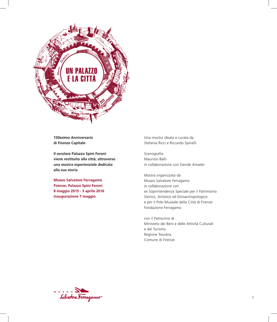 UN PALAZZO E LA CITTÀ 150esimo Anniversario di Firenze Capitale Una mostra ideata e curata da Stefania Ricci e Riccardo Spinelli Il secolare Palazzo Spini Feroni viene restituito alla città, attraverso una mostra esperienziale dedicata alla sua storia Scenografia Maurizio Balò in collaborazione con Davide Amadei Museo Salvatore Ferragamo Firenze, Palazzo Spini Feroni 8 maggio 2015 - 3 aprile 2016 inaugurazione 7 maggio Mostra organizzata da Museo Salvatore Ferragamo in collaborazione con ex Soprintendenza Speciale per il Patrimonio Storico, Artistico ed Etnoantropologico e per il Polo Museale della Città di Firenze Fondazione Ferragamo con il Patrocinio di Ministero dei Beni e delle Attività Culturali e del Turismo Regione Toscana Comune di Firenze 1 UN PALAZZO E LA CITTÀ “Già molto tempo prima di trasferirmi a Palazzo Spini Feroni amavo questo edificio e lo consideravo uno dei più belli di tutta Firenze” Salvatore Ferragamo A Palazzo Spini Feroni, in via Tornabuoni a Firenze, dall’8 maggio 2015 al 3 aprile 2016, il Museo Salvatore Ferragamo dedica una mostra alla storia di questo secolare edificio proprio in occasione delle celebrazioni del 150esimo Anniversario di Firenze Capitale del Regno d’Italia (1865-1870), che nel 1865 aveva nel palazzo la sede del Municipio. La mostra, a cura di Stefania Ricci e Riccardo Spinelli, presenta opere d’arte e documenti di grande prestigio provenienti da musei e collezioni private e racconta le complesse vicende storiche del palazzo e dei suoi abitanti, in un allestimento molto coinvolgente progettato dallo scenografo Maurizio Balò, riconsegnando a Firenze, ai suoi cittadini e ai turisti uno degli edifici più significativi del paesaggio urbano fiorentino. Se da un lato si evidenzia, attraverso la mostra, un valore storico e architettonico estremamente importante per la città di Firenze, dall’altro si attualizza il passato e si rafforza la stretta connessione tra Palazzo Spini Feroni, magnifico esempio di architettura medioevale – restituito, al termine di un complesso restauro compiuto dalla famiglia Ferragamo, alla città nella sua originaria bellezza – e Firenze quale luogo d’arte, cultura, tradizione e riporta allo stile di vita, alla creatività e all’eleganza tutte italiane. L’immagine della mostra. Il simbolo della mostra prende ispirazione da una veduta a 360° di Firenze presa dalla sommità merlata di Palazzo Spini Feroni raffigurata in un’incisione di Ramsay Richard Reinagle del 1806, pubblicata nel “Journal des Luxus und der Moden”, come una sorta di diorama della città mostrato a fini promozionali. Il percorso della mostra. La mostra si propone come un viaggio à rebours nel tempo, scandito dall’orologio visibile sulla facciata, qui riprodotto come ingresso di un caveau dove sono conservati i tesori più preziosi, tuttora in grado di offrire spunti di riflessione e ispirazione per il futuro. Il trascorrere del tempo è segnato dalla lancetta dei minuti, che si muove all’indietro per segnalare il viaggio nel passato. Il punto di partenza del percorso, come in ogni mostra al Museo Salvatore Ferragamo, è rappresentato dal mondo di Salvatore Ferragamo che acquistando il palazzo intuì l’importanza, per un creatore di moda, di operare in un luogo storico e di cultura. SALA 1 Salvatore Ferragamo e il suo palazzo. Quando Salvatore Ferragamo (1898-1960) arrivò dall’America in Italia nel 1927 era già un uomo di successo. Scelse Firenze perché la città rappresentava nel mondo l’artigianato e l’arte italiana. Nei primi anni Salvatore non si curò molto della clientela locale e dell’ambiente dove operare. Ma dopo il fallimento nel 1933, conseguenza della depressione del 1929, si rese conto di aver trascurato la società cittadina e il luogo dove accoglierla. La scelta della nuova sede ricadde su Palazzo Spini Feroni, per la storia e la posizione dell’edificio che acquistò qualche anno dopo, nel 1938. Da quel momento la dimora diventa protagonista della comunicazione Ferragamo, in cui un 2 UN PALAZZO E LA CITTÀ prodotto artigianale di qualità si sposa all’immagine di un ambiente unico, riprodotta sulla carta intestata dell’azienda, sul fronte delle scatole delle scarpe e utilizzata per la pubblicità. Il palazzo è anche protagonista del primo foulard Ferragamo, realizzato nel 1961 su disegno dell’artista Alvaro Monnini, fondatore dell’Astrattismo Geometrico. Dopo la morte di Ferragamo nel 1960, l’immobile ha continuato a conservare il ruolo di sede e simbolo dell’azienda. Questa storia viene raccontata attraverso filmati e fotografie, ma le vere protagoniste della sala sono le scarpe, 650 modelli da sera, 264 da giorno, create tra gli anni cinquanta e la fine degli anni sessanta da Salvatore Ferragamo e dalla figlia Fiamma, in un allestimento che ricorda l’ambiente originario in cui erano conservate, come fonte di ispirazione per le nuove collezioni. Su un tavolo sono invece visibili alcune calzature con zeppa degli anni trenta e quaranta, le più celebri a firma Ferragamo. SALA 2 Da Geri Spini alla fine del Quattrocento. Le origini del palazzo risalgono al 1289, dopo che un’alluvione aveva distrutto le case degli Spini, ricca e potente famiglia proprietaria di una delle prime società bancarie d’Europa. Committente dell’edificio fu Ruggeri, detto Geri, la persona più illustre del casato, banchiere di papa Bonifacio VIII per conto del quale riscuoteva le decime ecclesiastiche nella maggior parte d’Europa. Uomo astuto e ricchissimo, fu uno dei più autorevoli rappresentanti della fazione dei guelfi neri, responsabile dell’esilio di Dante Alighieri, rappresentato nel dipinto di Domenico Petarlini del 1860 della Galleria d’arte moderna di Palazzo Pitti. La celebrità di cui Geri godette presso i contemporanei si estende anche al Decamerone di Giovanni Boccaccio, che allo Spini e alla moglie dedicò due novelle, nelle quali si sottolinea la grande considerazione che