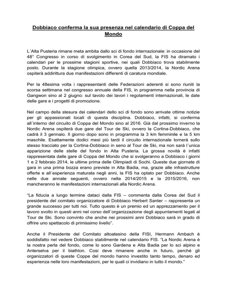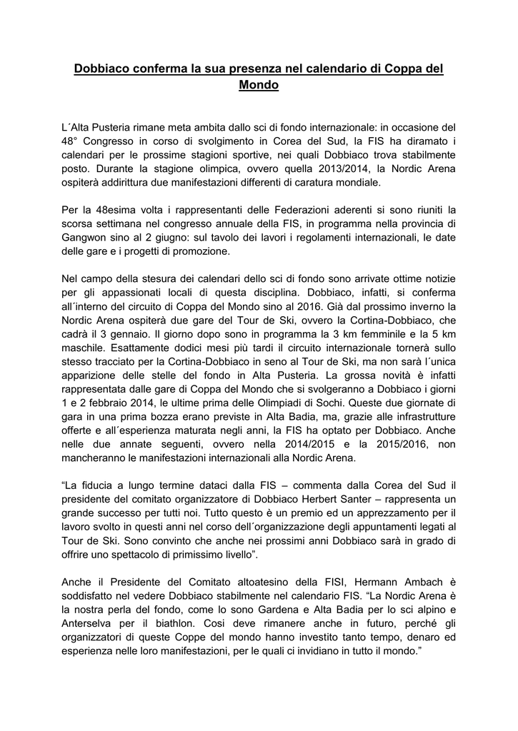 Dobbiaco conferma la sua presenza nel calendario di Coppa del Mondo L´Alta Pusteria rimane meta ambita dallo sci di fondo internazionale: in occasione del 48° Congresso in corso di svolgimento in Corea del Sud, la FIS ha diramato i calendari per le prossime stagioni sportive, nei quali Dobbiaco trova stabilmente posto. Durante la stagione olimpica, ovvero quella 2013/2014, la Nordic Arena ospiterà addirittura due manifestazioni differenti di caratura mondiale. Per la 48esima volta i rappresentanti delle Federazioni aderenti si sono riuniti la scorsa settimana nel congresso annuale della FIS, in programma nella provincia di Gangwon sino al 2 giugno: sul tavolo dei lavori i regolamenti internazionali, le date delle gare e i progetti di promozione. Nel campo della stesura dei calendari dello sci di fondo sono arrivate ottime notizie per gli appassionati locali di questa disciplina. Dobbiaco, infatti, si conferma all´interno del circuito di Coppa del Mondo sino al 2016. Già dal prossimo inverno la Nordic Arena ospiterà due gare del Tour de Ski, ovvero la Cortina-Dobbiaco, che cadrà il 3 gennaio. Il giorno dopo sono in programma la 3 km femminile e la 5 km maschile. Esattamente dodici mesi più tardi il circuito internazionale tornerà sullo stesso tracciato per la Cortina-Dobbiaco in seno al Tour de Ski, ma non sarà l´unica apparizione delle stelle del fondo in Alta Pusteria. La grossa novità è infatti rappresentata dalle gare di Coppa del Mondo che si svolgeranno a Dobbiaco i giorni 1 e 2 febbraio 2014, le ultime prima delle Olimpiadi di Sochi. Queste due giornate di gara in una prima bozza erano previste in Alta Badia, ma, grazie alle infrastrutture offerte e all´esperienza maturata negli anni, la FIS ha optato per Dobbiaco. Anche nelle due annate seguenti, ovvero nella 2014/2015 e la 2015/2016, non mancheranno le manifestazioni internazionali alla Nordic Arena. “La fiducia a lungo termine dataci dalla FIS – commenta dalla Corea del Sud il presidente del comitato organizzatore di Dobbiaco Herbert Santer – rappresenta un grande successo per tutti noi. Tutto questo è un premio ed un apprezzamento per il lavoro svolto in questi anni nel corso dell´organizzazione degli appuntamenti legati al Tour de Ski. Sono convinto che anche nei prossimi anni Dobbiaco sarà in grado di offrire uno spettacolo di primissimo livello”. Anche il Presidente del Comitato altoatesino della FISI, Hermann Ambach è soddisfatto nel vedere Dobbiaco stabilmente nel calendario FIS. “La Nordic Arena è la nostra perla del fondo, come lo sono Gardena e Alta Badia per lo sci alpino e Anterselva per il biathlon. Cosi deve rimanere anche in futuro, perché gli organizzatori di queste Coppe del mondo hanno investito tanto tempo, denaro ed esperienza nelle loro manifestazioni, per le quali ci invidiano in tutto il mondo.” Calendario Coppa del Mondo 2012/13 Novembre 2012 Sab. 24/11/12 - 10 km TL femminile e 15 km TL maschile Gallivare (Swe) Dom. 25/11/12 - 4x5 km femminile e 4x7,5 km maschile Galliware (Swe) Ven. 30/11/12 - Sprint TC femminile e maschile Kuusamo (Fin) Dicembre 2012 Sab. 01/12/12 - 5 km TL femminile e 10 km TL maschile Kuusamo (Fin) Dom. 01/12/12 - 10 km TC pursuit femminile e 15 km TC pursuit maschile Kuusamo (Fin) Ven. 07/12/12 - Team Sprint TL femminile e maschile Quebec (Can) Sab. 08/12/12 - Sprint TL femminile e maschile Quebec (Can) Gio. 13/12/12 - 10 km C mass start femminile e 15 km C mass start maschile Canmore (Can) Sab. 15/12/12 - Sprint TL femminile e maschile Canmore (Can) Dom. 16/12/12 - Skiathlon femminile e maschile Canmore (Can) Tour de Ski 2012/13 Sab. 29/12/12 (Tour de Ski) - 2,5 km TL femminile e 3,75 km TL maschile Oberhof (Ger) Dom. 30/12/12 (Tour de Ski) - 10 km TC pursuit femminile e 15 km TC pursuit maschile Oberhof (Ger) Mar. 01/01/13 (Tour de Ski) - Sprint TL femminile e maschile Muenstertal (Svi) Gio. 03/01/13 (Tour de Ski) - 15 km TL pursuit femminile e 35 km TL pursuit maschile Cortina/Dobbiaco (Ita) Ven. 04/01/13 (Tour de Ski) - 3 km TC femminile e 5 km TC maschile Dobbiaco (Ita) Sab. 05/01/12 (Tour de Ski) - 10 km TC mass start femminile e 20 km TC mass start maschile Val di Fiemme (Ita) Dom. 06/01/12 (Tour de Ski) - 9 km TL pursuit femminile e maschile Val di Fiemme (Ita) Gennaio 2013 Sab. 12/01/13 - Sprint TC femminile e maschile Liberec (Cze) Dom. 13/01/13 - Team sprint TL femminile e maschile Liberec (Cze) Sab. 19/01/13 - 10 km TC femminile mass start e 15 km TC maschile mass start La Clusaz (Fra) Dom. 22/01/13 - 4x5 km femminile e 4x7,5 km km TC maschile La Clusaz (Fra) Febbraio 2013 Ven. 01/02/13 - Sprint TL femminile e maschile Sochi (Rus) Sab. 02/02/13 - Skiathlon femminile e maschile Sochi (Rus) Dom. 03/02/13 - Team Sprint TC femminile e maschile Sochi (Rus) Mondiali in Val di Fiemme dal 20 febbraio al 3 marzo 2013 Marzo 2013 Sab. 09/03/13 - Sprint TL femminile e maschile Lahti (Fin) Dom. 10/03/13 - 10 km TC femminile e 15 km TC maschile Lahti (Fin) Mer. 13/03/13 - Sprint TC femminile e maschile Drammen (Nor) Sab. 16/03/13 - 50 km TL mass start maschile Oslo (Nor) Dom. 17/03/13 - 30 km TL mass start femminile Oslo (Nor) Mer. 20/03/13 - Sprint TC femminile e maschile Stoccolma (Swe) Ven. 22/03/13 - 2,5 km TL femminile e 3,75 km TL maschile Falun (Sve) Sab. 23/03/13 - 10 km TC mass start femminile e 15 km TC mass start maschile Falun (Sve) Dom. 24/03/13 - 10 km TL pursuit femminile e 15 km TL pursuit maschile Falun (Sve)
