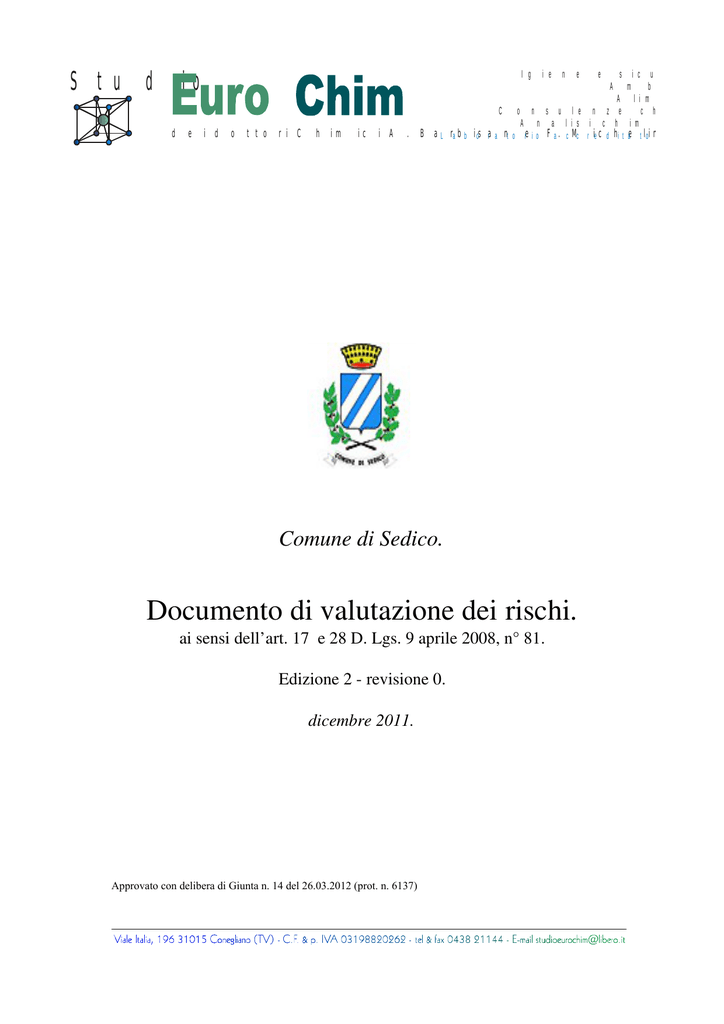 S t u d io I g e n e e s i c u m b A li m o n s u l e n z e c h A n a l i s i c h im i A C d i e i d o t t o r i C h im ic i A . B a L ra b b i os ra a nt o re i o F a . c Mc r ie c d h i t ae t l oi n U i N Comune di Sedico. Documento di valutazione dei rischi. ai sensi dell’art. 17 e 28 D. Lgs. 9 aprile 2008, n° 81. Edizione 2 revisione 0. dicembre 2011. Approvato con delibera di Giunta n. 14 del 26.03.2012 (prot. n. 6137) r e z z a i e n t e e n t i i m i c h c h e e I C E (pagina vuota) Pag. 2 di 70. Indice generale Informazioni sul documento.............................................................................................................................5 Autori e responsabilità.................................................................................................................................5 Dichiarazioni e firme...................................................................................................................................5 Gestione del documento..............................................................................................................................5 Distribuzione e riservatezza........................................................................................................................7 Premessa...........................................................................................................................................................9 Informazioni generali....................................................................................................................................10 Definizioni.................................................................................................................................................10 Competenze e responsabilità.....................................................................................................................13 Riunione per la sicurezza...........................................................................................................................15 Programmi di miglioramento.....................................................................................................................15 Dati aziendali..................................................................................................................................................16 Personale con incarichi e funzioni relative alla sicurezza..........................................................................16 Attività e mansioni.....................................................................................................................................16 Sinottico mansioni.....................................................................................................................................18 Pianta organica..........................................................................................................................................18 Materie prime............................................................................................................................................18 Luoghi di lavoro........................................................................................................................................18 Attrezzature / macchinari...........................................................................................................................26 Mezzi e macchine operatrici......................................................................................................................27 Dispositivi di protezione individuale.......................................................................................................28 Dispositivi antincendio..............................................................................................................................28 Valutazione dei rischi.....................................................................................................................................29 Frequenza della valutazione.......................................................................................................................29 Criteri e metodologia di valutazione..........................................................................................................29 Attuazione.................................................................................................................................................30 Rischi individuati............................................................................................................................................32 Valutazione del rischio di caduta, scivolamento, inciampo, urto...............................................................33 Valutazione del rischio di folgorazione o elettrocuzione...........................................................................35 Valutazione del rischio incendio e scoppio................................................................................................38 Valutazione del rischio nell’utilizzo di macchine/attrezzature...................................................................41 Valutazione del rischio connesso all’esposizione ad agenti chimici..........................................................43 Valutazione del rischio connesso all’esposizione al rumore......................................................................46 Valutazione del rischio connesso all’esposizione alle vibrazioni meccaniche...........................................48 Valutazione del rischio connesso a fattori microclimatici.........................................................................50 Valutazione del rischio da movimentazione manuale dei carichi...............................................................53 Valutazione del rischio connesso all’uso di videoterminali.......................................................................55 Valutazione rischio per lav