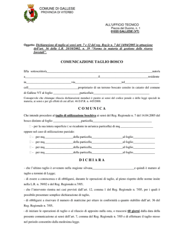 COMUNE DI GALLESE PROVINCIA DI VITERBO ALL'UFFICIO TECNICO Piazza del Duomo, n. 1 01035 GALLESE (VT) Oggetto: Dichiarazione di taglio ai sensi artt. 7 e 12 del reg. Reg.le n. 7 del 14/04/2005 in attuazione dell’art. 36 della L.R. 28/10/2002, n. 39 “Norme in materia di gestione delle risorse forestali”. COMUNICAZIONE TAGLIO BOSCO Il/la sottoscritto/a____________________________________________________________________nato/a a_______________________________________________il_______________________________residente in_____________________________via______________________________tel______________________ cell________________________________proprietario di un terreno boscato censito in catasto del comune di Gallese VT al foglio _________________particella/e____________________________________ Consapevole che chiunque rilascia dichiarazioni mendaci è punito ai sensi del codice penale e delle leggi speciali in materia, ai sensi e per gli effetti di cui all'art. 46 D.P.R. n. 445/2000. COMUNICA Che intende procedere al taglio di utilizzazione boschiva ai sensi del Reg. Regionale n. 7 del 14.04.2005 del bosco distinto al foglio __________________particella______________________________________ - per la sua intera superficie ( se ricadente in un'unica particella) di mq._____________________ oppure nel caso di utilizzazione parziale: - per mq.__________________della particella____________________al foglio______________ - per mq.__________________della particella____________________al foglio______________ - per mq.__________________della particella____________________al foglio______________ - per mq.__________________della particella____________________al foglio______________ DICHIARA - che l’ultimo taglio è avvenuto nella stagione silvana___________________________e quindi è maturo al taglio a termini di Legge; - di essere a conoscenza e di obbligarsi, durante le operazioni di taglio, al pieno rispetto delle norme insite nella L.R. n. 39/02 e del Reg. Regionale n.7/05; - che l’intervento rientra nei casi previsti dall’art. 12, comma 1 del Reg. Regionale n. 7/05, per i quali è possibile presentare semplice dichiarazione di taglio, - di obbligarsi a riservare il numero di matricine per ettaro in conformità a quanto stabilito dall’art. 36 del Reg. Regionale n. 7/05, - di iniziare le operazioni di taglio o al rilascio di apposito nulla osta, o trascorsi 60 giorni dalla data della presente comunicazione ai sensi dell’art. 7, comma del Reg. Regionale n. 7/05 e di effettuare il taglio stesso nel periodo consentito dalla medesima legge. COMUNE DI GALLESE PROVINCIA DI VITERBO Ai sensi dell’art. 8, comma 1 del Reg. Regionale n.7/2005 le operazioni di taglio devono concludersi entro 18 mesi dal decorso del termine fissato per l’inizio dell’attività. Lo scrivente ultimate le operazioni provvederà, ai sensi dell’art.7, comma 5 del Reg. Regionale n.7 del 18.04.2005 ad inviare apposita comunicazione di fine lavori, tramite raccomandata a/r o consegna a mano, al Corpo Forestale di Vasanello competente per il territorio, Via Piazza Vittorio Veneto, 13 – Vasanello, (VT) tel 0761409702, pena incorrere nella sanzione di legge prevista. N.B. Per le superfici di taglio superiori ad ha 0,5 dovrà essere effettuata anche comunicazione di inizio taglio al suddetto Corpo Forestale ed acquisire il relativo benestare. Data ______________________ Firma ______________________________ A tal fine allega la seguente documentazione: 1) copia planimetria catastale 1:2000, aggiornata della zona evidenziando l’area oggetto di taglio. 2) copia certificato catastale (Visura).