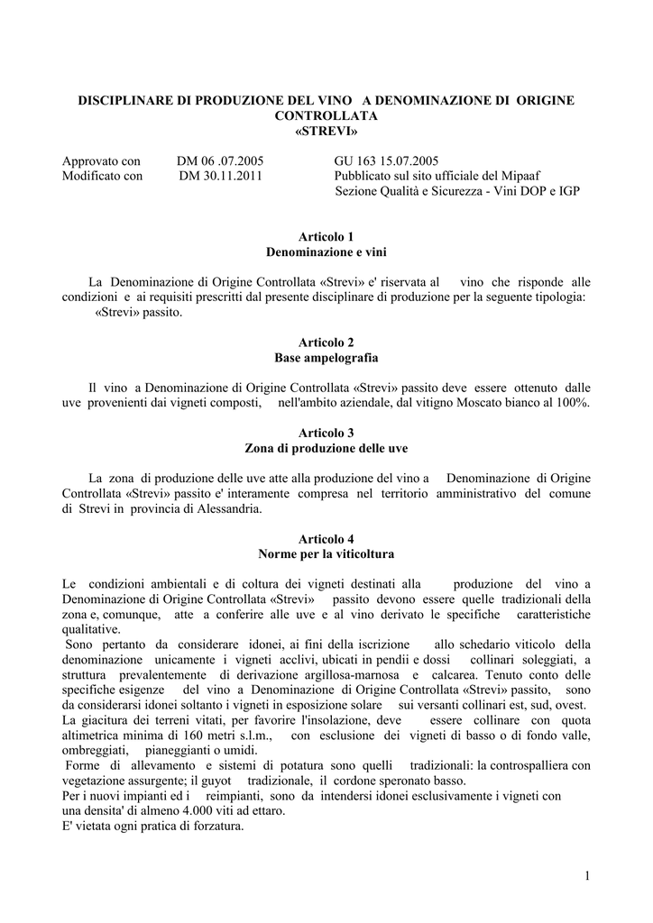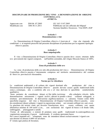DISCIPLINARE DI PRODUZIONE DEL VINO A DENOMINAZIONE DI ORIGINE CONTROLLATA «STREVI» Approvato con Modificato con DM 06 .07.2005 DM 30.11.2011 GU 163 15.07.2005 Pubblicato sul sito ufficiale del Mipaaf Sezione Qualità e Sicurezza - Vini DOP e IGP Articolo 1 Denominazione e vini La Denominazione di Origine Controllata «Strevi» e' riservata al vino che risponde alle condizioni e ai requisiti prescritti dal presente disciplinare di produzione per la seguente tipologia: «Strevi» passito. Articolo 2 Base ampelografia Il vino a Denominazione di Origine Controllata «Strevi» passito deve essere ottenuto dalle uve provenienti dai vigneti composti, nell'ambito aziendale, dal vitigno Moscato bianco al 100%. Articolo 3 Zona di produzione delle uve La zona di produzione delle uve atte alla produzione del vino a Denominazione di Origine Controllata «Strevi» passito e' interamente compresa nel territorio amministrativo del comune di Strevi in provincia di Alessandria. Articolo 4 Norme per la viticoltura Le condizioni ambientali e di coltura dei vigneti destinati alla produzione del vino a Denominazione di Origine Controllata «Strevi» passito devono essere quelle tradizionali della zona e, comunque, atte a conferire alle uve e al vino derivato le specifiche caratteristiche qualitative. Sono pertanto da considerare idonei, ai fini della iscrizione allo schedario viticolo della denominazione unicamente i vigneti acclivi, ubicati in pendii e dossi collinari soleggiati, a struttura prevalentemente di derivazione argillosa-marnosa e calcarea. Tenuto conto delle specifiche esigenze del vino a Denominazione di Origine Controllata «Strevi» passito, sono da considerarsi idonei soltanto i vigneti in esposizione solare sui versanti collinari est, sud, ovest. La giacitura dei terreni vitati, per favorire l'insolazione, deve essere collinare con quota altimetrica minima di 160 metri s.l.m., con esclusione dei vigneti di basso o di fondo valle, ombreggiati, pianeggianti o umidi. Forme di allevamento e sistemi di potatura sono quelli tradizionali: la controspalliera con vegetazione assurgente; il guyot tradizionale, il cordone speronato basso. Per i nuovi impianti ed i reimpianti, sono da intendersi idonei esclusivamente i vigneti con una densita' di almeno 4.000 viti ad ettaro. E' vietata ogni pratica di forzatura. 1 La resa massima di uva ammessa per la produzione del vino a Denominazione di Origine Controllata «Strevi» passito non deve essere superiore a 6 tonnellate per ettaro in coltura specializzata ed a tale limite, anche in annate eccezionalmente favorevoli, dovra' essere riportata mediante cernita delle uve purche' la produzione non superi del 20% il limite medesimo. Le uve al momento della raccolta devono assicurare un titolo alcolometrico volumico naturale minimo non inferiore a 12,00 % vol. Le uve destinate alla produzione del vino a Denominazione di Origine Controllata «Strevi» passito che intendono fregiarsi della specificazione aggiuntiva «vigna» debbono presentare un titolo alcolometrico volumico naturale minimo di 12,50% vol. La quantita' massima di uva ammessa per la produzione del vino a Denominazione di Origine Controllata «Strevi» passito con la menzione aggiuntiva «vigna» seguita dal relativo toponimo o nome tradizionale , deve essere di 5.400 kg per ettaro in coltura specializzata. In particolare, per poter utilizzare la menzione aggiuntiva «vigna», il vigneto di nuovo impianto dovra' avere una resa ettaro ulteriormente ridotta come sotto appresso specificato: al terzo anno di impianto: resa uva 3.200 kg/ha; titolo alcolometrico volumico naturale minimo: 12,50% vol; al quarto anno di impianto: resa uva 3.780 kg/ha; titolo alcolometrico volumico naturale minimo: 12,50 % vol; al quinto anno di impianto: resa uva 4.320 kg/ha; titolo alcolometrico volumico naturale minimo: 12,50 % vol; al sesto anno di impianto: resa uva 4.860 kg/ha; titolo alcolometrico volumico naturale minimo: 12,50 % vol; al settimo anno di impianto: resa uva 5.400 kg/ha; titolo alcolometrico volumico naturale minimo: 12,50 % vol. La Regione Piemonte con proprio decreto, su proposta del Consorzio di tutela, sentite le organizzazioni di categoria interessate, ogni anno prima della vendemmia può, in relazione all'andamento climatico ed alle altre condizioni di coltivazione, stabilire un limite massimo di produzione inferiore a quello fissato, dandone immediata comunicazione all’organismo di controllo. Articolo 5 Norme per la vinificazione Le operazioni di vinificazione, affinamento, invecchiamento obbligatorio ed imbottigliamento devono essere effettuate nel territorio del comune di Strevi e dei comuni confinanti con lo stesso (Acqui Terme, Cassine, Morsasco, Orsara Bormida, Ricaldone, Rivalta Bormida, Visone). 2 Conformemente all’articolo 8 del Reg. CE n. 607/2009, l’imbottigliamento o il condizionamento deve aver luogo nella predetta zona geografica delimitata per salvaguardare la qualità o la reputazione o garantire l’origine o assicurare l’efficacia dei controlli. Conformemente all’articolo 8 del Reg. CE n. 607/2009, a salvaguardia dei diritti precostituiti dei soggetti che tradizionalmente hanno effettuato l’imbottigliamento al di fuori dell’area di produzione delimitata, sono previste autorizzazioni individuali alle condizioni di cui all’articolo 10, comma 3 e 4 del decreto legislativo n. 61/2010 (Allegato 1). Nella vinificazione sono ammesse soltanto le pratiche leali e costanti consentite per il tipo di vino prodotto. Le uve devono essere sottoposte a graduale appassimento dopo la raccolta, al sole ed all'aria aperta; all'aria aperta in cassette o su graticci, in locali chiusi e ventilati, in camera termo-idro-condizionata, escludendo il riscaldamento dell'uva e dell'ambiente. Il vino a Denominazione di Origine Controllata «Strevi» passito può essere immesso al consumo solo dopo essere stato sottoposto ad un periodo di affinamento e invecchiamento di almeno due anni a decorr