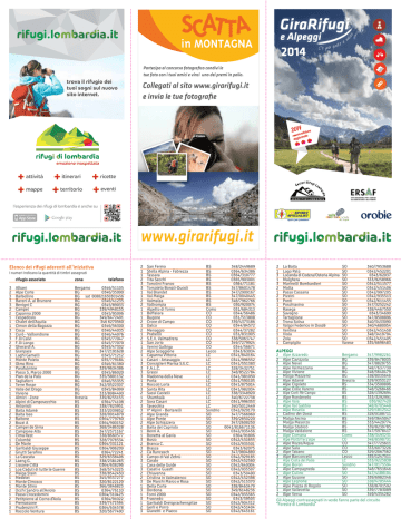 Partecipa al concorso fotografico condivi le tue foto con i tuoi amici e vinci uno dei premi in palio. trova il rifugio dei tuoi sogni sul nuovo sito internet. attività itinerari ricette mappe territorio eventi Collegati al sito www.girarifugi.it e invia le tue fotografie l’esperienza dei rifugi di lombardia è anche su www.girarifugi.it Elenco dei rifugi aderenti all’iniziativa I numeri indicano la quantità di timbri assegnati rifugio associato 3Albani 2 Alpe Corte 3Barbellino 3 Baroni A. al Brunone 3 Benigni C 2Campel 2 Capanna 2000 1Cespedosio 1 Chalet dell’Aquila 1 Cimon della Bagozza 3Coca 3 Curò - Valbondione 3 F.lli Calvi 2 F.lli Longo 2 Gherardi A. 2Gianpace 3 Laghi Gemelli 1 Monte Poieto 3 Olmo Rino 2Parafulmine 1 Passo S. Marco 2000 1 Pian de la Palù 3Tagliaferri 1 Terre Rosse 1 Valle del Drago 1Vivione 1 Almici - Zone 2 Alpini di Campovecchio 1Antonioli 2 Baita Adamè 2 Baita Iseo 2 Baitone 2 Bozzi A 2 Campei de Sima 2 Campione Alto 1 Cima Rest 1Colombè 1 De Marie 3 Garibaldi Giuseppe 2 Gnutti Serafino 1 La Cascata 2 Laeng G. 2 Lissone Città 1 Loa Caduti di tutte le Guerre 2 Malga Stain 1Medelet 1 Monte Cimosco 1 Monte Stino 2 Occhi Sandro all’Aviolo 1 Passo Crocedomini 2 Petitpierre al Corno d’Aola 1Premassone 3 Prudenzini P. 1 Roccolo Ventura zona telefono Bergamo 0346/51105 BG 0346/35090 BG sat 008821650301456 BG 0346/41235 BG 0345/89033 BG 339/4948155 BG 0345/95096 BG 349/6472491 BG 346 6270560 BG 0346/56300 BG 0346/44035 BG 0346/44076 BG 0345/77047 BG 0345/77070 BG 0345/47302 BG 347/2191628 BG 0345/71212 BG 035/779184 BG 0346/61380 BG 329/9634386 BG 0345/86020 BG 335/5801132 BG 0346/55355 BG 342/0522307 BG 0345/84099 BG 333/8984490 Brescia 339/8255153 BS 0364/74108 BS 338/7825951 BS 333/2039852 BS 328/0914879 BS 0364/779760 BS 0364/900152 BS 368/3486328 BS 347/2571167 BS 338/8660577 BS 328/7978334 BS 0364/331121 BS 0364/906209 BS 0364/72241 BS 329/6338406 BS 338/2381283 BS 0364/638296 BS 348/5743225 BS 338/8542450 BS 345/9337277 BS 320/8122129 BS 366/3846823 BS 0364/76110 BS 0364/310425 BS 0364/91022 BS 339/7471594 BS 0364/634578 BS 320/5677400 2 San Fermo 1 Stella Alpina - Fabrezza 1Tassara 2 Tita Secchi 3 Tonolini Franco 3 Torsoleto Bonali-Ducoli 1 Val Brandet 1 Val Malga 2Valmalza 2Valtrompia 1 Alpetto di Torno 1Boffalora 1Bugone 2 Croce di Campo 1Dalco 2Menaggio 1Prabello 2 S.E.V. Valmadrera 1 San Jorio 1 Venini Galbiga 2 Alpe Scoggione 1 Capanna Vittoria 1 Casari - Artavaggio 3 Consiglieri Marisa S.E.C. 3F.A.L.C. 3Grassi 3 Madonna della Neve 1Porta 1 Roccoli Lorla 3 Santa Rita 2 Sassi Castelli 1Shambalà 2 Sora Casari 3Tavecchia 3 V° Alpini - Bertarelli 2 Alpe Granda 1 Alpe Ponte 2 Alpe Schiazzera 2 Baita del Capriolo 1 Berni A. 1 Bonetta al Gavia 3Bosio 2 Branca C. 3Brasca 2 Cà Runcasch 3 Campo di Val Zebrù 3Carate 1 Casa delle Guide 3 Casati e Guasti 2Chiavenna 2 Cristina in Valmalenco 3 De Marchi Marco e Rosa 1 Della Corte 3Dordona 1 Forni 2000 3Frasnedo 1 Garibaldi Dreisprachenspitze 2 Gerli e Porro 3 Gianetti e Piacco BS 348/2449689 BS 0364/634386 BS 0364/310777 BS 0365/903001 BS 0364/71181 BS 347/8601478 BS 347/2909167 BS 347/0040445 BS 348/7962766 BS 030/920074 Como 031/684313 CO 0344/56486 CO 031/513808 CO 339/4373186 CO 0344/84572 CO 0344/37282 CO 031/831905 CO 338/5063747 CO 349/7279924 CO 0344/56671 Lecco 0343/63034 LC 0341/840164 LC 0341/996552 LC 0341/551383 LC 328/3432751 LC 348/8522784 LC 0341/981050 LC 0341/590105 LC 0341/875014 LC 0341/982034 LC 338/3348920 LC 340/6722738 LC 0341/996353 LC 340/5012449 Sondrio 0342/929170 SO 347/7566960 SO 339/2850220 SO 347/2608250 SO 0041/816671136 SO 0342/935456 SO 0364/91806 SO 0342/451655 SO 0342/935501 SO 0343/62075 SO 347/9804889 SO 0342/929185 SO 0342/452560 SO 0342/640004 SO 0342/935507 SO 0343/50490 SO 0342/452398 SO 0342/515370 SO 338/8463479 SO 349/6148236 SO 0342/935365 SO 0343/39503 SO 0342/904312 SO 0342/451404 SO 0342/645161 2 La Baita 1 Lago Palù 3 Locanda di Codera/Osteria Alpina 1Malghera 3 Marinelli Bombardieri 2Motta 1 Passo Cassana 2Pizzini 3Ponti 1Poschiavino 1Rasega 2Savogno 2Tartaglione 2 Trona Soliva 2 Valgoi Federico in Dosdè 2Ventina 1Viola 1Zoia 1Campiglio SO SO SO SO SO SO SO SO SO SO SO SO SO SO SO SO SO SO Varese 340/7953688 0342/452201 0343/62037 333/9258966 0342/511577 0342/451406 0342/997205 0342/935513 0342/611455 347/3252242 338/4467550 0343/34699 347/8508896 340/3433090 340/4680054 0342/451458 348/3419794 0342/451405 335/6696483 ALPEGGI 2 Alpe Azzaredo Bergamo 347/9982261 2 Alpe Cavizzola BG 339/8478035 3 Alpe Nevel BG 347/8829755 1 Alpe Valmezzana BG 348/7637739 1 Alpe Vivione BG 348/5640479 1 Malga Mezzeno BG 338/8035646 2 Alpe Adamé Brescia 329/9353127 1 Alpe Cigoleto BS 334/3500896 1 Alpe Colle Vareno BS 348/3268466 2 Alpe Corti Rè Campo BS 328/1392694 2 Alpe Rondeneto BS 333/3292991 2 Alpe Vaia BS 030/927420 3 Alpe Val Gabbia BS 348/6705448 1 Alpe Rosello BS 329/1812542 1 Cadino dei Dossi BS 328/0188711 1 Malga Arcina BS 349/3645047 1 Malga Mesorzo BS 333/4429774 1 Malga Stabicò BS 339/8239785 1 Malga Valdaione BS 347/5978417 2 Alpe Comana Como 338/3493231 2 Alpe Piotti/Terz’alpe CO 348/8598731 2 Alpe Rozzo/Aigua CO 347/7725611 2 Alpe Sala CO 333/6073226 2 Alpe Tabano CO 329/2067562 3 Alpe Barconcelli Lecco 335/1247511 2 Alpe Costa del Palio LC 333/9225838 2 Alpe Boron Sondrio 347/0175594 2 Alpe Campagneda SO 348/7651646 1 Alpe Culino SO 347/4188104 3 Alpe Gusone SO 339/6982346 3 Alpe Legnone SO 338/4705444 2 Alpe Piazza di Rogolo SO338/8701592 1 Alpe Vallecetta SO 339/7783089 2 Alpe Verva SO 349/4354262 Gli Alpeggi contrassegnati in verde fanno parte del circuito “Foreste di Lombardia” Regolamento Girarifugi Il concorso dell’estate in montagna! Partecipa da giugno a ottobre e raccogli i punti nei rifugi e negli alpeggi. Recandoti in una delle strutture elencate sulla tessera “Girarifugi e Alpeggi”, potrai richiedere un timbro di fedeltà (da apporre in una delle caselle della tessera) a comprova del tuo passaggio. La tessera è nominativa 