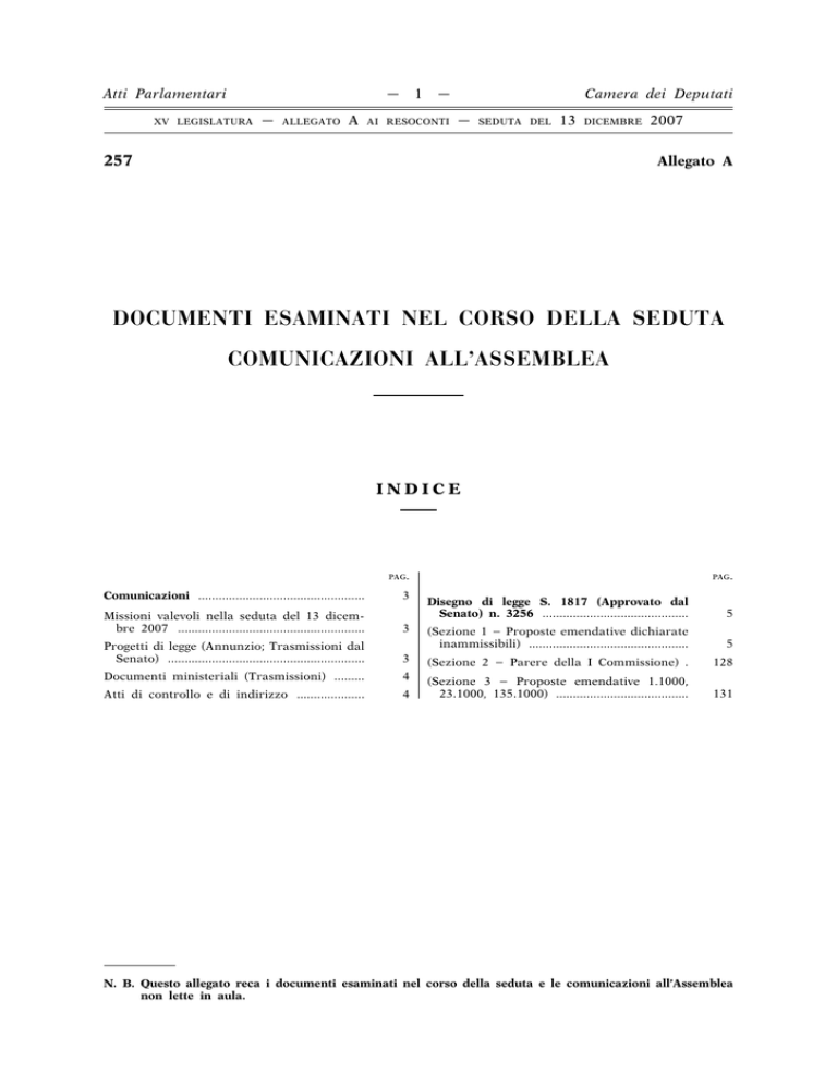 — Atti Parlamentari XV LEGISLATURA — ALLEGATO A 1 — AI RESOCONTI Camera dei Deputati — SEDUTA DEL 13 DICEMBRE 257 2007 Allegato A DOCUMENTI ESAMINATI NEL CORSO DELLA SEDUTA COMUNICAZIONI ALL’ASSEMBLEA INDICE PAG. Comunicazioni ................................................. 3 Missioni valevoli nella seduta del 13 dicembre 2007 ....................................................... 3 Progetti di legge (Annunzio; Trasmissioni dal Senato) .......................................................... PAG. Disegno di legge S. 1817 (Approvato dal Senato) n. 3256 ........................................... 5 (Sezione 1 – Proposte emendative dichiarate inammissibili) ............................................... 5 3 (Sezione 2 – Parere della I Commissione) . 128 Documenti ministeriali (Trasmissioni) ......... 4 Atti di controllo e di indirizzo .................... 4 (Sezione 3 – Proposte emendative 1.1000, 23.1000, 135.1000) ....................................... 131 N. B. Questo allegato reca i documenti esaminati nel corso della seduta e le comunicazioni all’Assemblea non lette in aula. PAGINA BIANCA — Atti Parlamentari XV LEGISLATURA — ALLEGATO A AI RESOCONTI 3 — — Camera dei Deputati SEDUTA DEL 13 DICEMBRE 2007 — N. 257 COMUNICAZIONI Missioni valevoli nella seduta del 13 dicembre 2007. Albonetti, Amato, Bersani, Bindi, Bocchino, Boco, Bonelli, Bonino, Brugger, Bruno, Capodicasa, Castagnetti, Catone, Cento, Chiti, Colucci, Cordoni, D’Alema, D’Antoni, Damiano, De Castro, De Piccoli, Del Mese, Di Pietro, Di Salvo, Donadi, Fabris, Fioroni, Folena, Forgione, Francescato, Galante, Gentiloni Silveri, Giovanardi, La Malfa, Landolfi, Lanzillotta, Leoni, Letta, Levi, Lion, Marcenaro, Maroni, Mazzocchi, Melandri, Meloni, Meta, Migliore, Minniti, Morrone, Mussi, Oliva, Leoluca Orlando, Parisi, Pecoraro Scanio, Pinotti, Piscitello, Pisicchio, Pollastrini, Prodi, Ranieri, Realacci, Rigoni, Rutelli, Santagata, Scajola, Sgobio, Soro, Spini, Stucchi, Tremonti, Villetti, Violante, Visco, Elio Vito. (Alla ripresa pomeridiana della seduta). Albonetti, Amato, Bersani, Bindi, Bocchino, Boco, Bonelli, Bonino, Brugger, Bruno, Capodicasa, Castagnetti, Cento, Chiti, Colucci, Cordoni, D’Alema, D’Antoni, Damiano, De Castro, De Piccoli, Del Mese, Di Pietro, Di Salvo, Donadi, Fabris, Fioroni, Folena, Forgione, Francescato, Galante, Gentiloni Silveri, Giovanardi, La Malfa, Landolfi, Lanzillotta, Leoni, Letta, Levi, Lion, Marcenaro, Maroni, Mazzocchi, Melandri, Meloni, Meta, Migliore, Minniti, Morrone, Mussi, Oliva, Leoluca Orlando, Parisi, Pecoraro Scanio, Pinotti, Piscitello, Pisicchio, Pollastrini, Prodi, Ranieri, Realacci, Rigoni, Rutelli, Santagata, Scajola, Sgobio, Soro, Spini, Stucchi, Tremonti, Villetti, Violante, Visco, Elio Vito. Annunzio di proposte di legge. In data 12 dicembre 2007 sono state presentate alla Presidenza le seguenti proposte di legge di iniziativa dei deputati: DI VIRGILIO ed altri: « Modifiche alla legge 11 agosto 1991, n. 266, in materia di organizzazioni di volontariato » (3295); FRANZOSO: « Istituzione di una zona franca nell’area portuale di Taranto » (3296). Saranno stampate e distribuite. Annunzio di un disegno di legge. In data 12 dicembre 2007 è stato presentato alla Presidenza il seguente disegno di legge: dal ministro della difesa: « Disposizioni in materia di personale militare delle Forze armate, Istituti di formazione e onorificenze » (3297). Sarà stampato e distribuito. Trasmissioni dal Senato. In data 12 dicembre 2007 il Presidente del Senato ha trasmesso alla Presidenza i seguenti disegni di legge: S. 1586. – « Ratifica ed esecuzione della Convenzione tra il Governo della Repubblica italiana e il Governo della Repubblica di Lettonia per evitare le doppie imposizioni in materia di imposte sul reddito e sul patrimonio e per prevenire le evasioni fiscali, con Protocollo aggiuntivo, fatta a Riga il 21 maggio 1997, e relativo — Atti Parlamentari XV LEGISLATURA — ALLEGATO A AI RESOCONTI Scambio di Note, effettuato a Roma il 9 dicembre 2004 » (approvato dal Senato) (3298); S. 1587. – « Ratifica ed esecuzione dell’Accordo di cooperazione culturale e scientifica tra il Governo della Repubblica italiana ed il Governo della Repubblica dell’Honduras, fatto a Tegucigalpa il 7 maggio 2004 » (approvato dal Senato) (3299); S. 1629. – « Ratifica ed esecuzione di due Protocolli relativi alla Convenzione internazionale di cooperazione per la sicurezza della navigazione aerea (EUROCONTROL), fatti a Bruxelles, rispettivamente, il 27 giugno 1997 e l’8 ottobre 2002, e norme di adeguamento dell’ordinamento interno » (approvato dal Senato) (3300); S. 1630. – « Ratifica ed esecuzione dell’Accordo di coproduzione cinematografica tra il Governo della Repubblica italiana ed il Governo della Repubblica argentina, con Allegato, fatto a Roma il 16 ottobre 2006 » (approvato dal Senato) (3301); S. 1680. – « Ratifica ed esecuzione dell’Accordo di cooperazione relativo ad un sistema globale di navigazione satellitare civile (GNSS) tra la Comunità europea e i suoi Stati membri, da una parte, e la Repubblica di Corea, dall’altra, fatto a Helsinki il 9 settembre 2006 » (approvato dal Senato) (3302); S. 1681. – « Ratifica ed esecuzione dell’Accordo di cooperazione culturale tra il Governo della Repubblica italiana ed il Governo della Repubblica indiana fatto a New Delhi il 12 luglio 2004 » (approvato dal Senato) (3303); S. 1751. – « Ratifica ed esecuzione della Convenzione in materia di assistenza giudiziaria penale tra il Governo della Repubblica italiana e il Governo della Repubblica algerina democratica e popolare, fatta ad Algeri il 22 luglio 2003 » (approvato dal Senato) (3304). Saranno stampati e distribuiti. 4 — — Camera dei Deputati SEDUTA DEL 13 DICEMBRE 2007 — N. 257 Trasmissione dal ministro dell’interno. Il ministro dell’interno, con lettera del 3 dicembre 2007, ha trasmesso tre note relative all’a