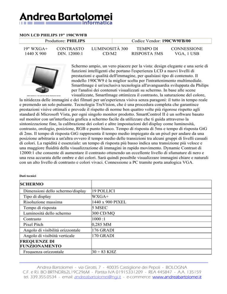 MON LCD PHILIPS 19" 190CW9FB Produttore: PHILIPS 19" WXGA+ 1440 X 900 CONTRASTO DIN. 12000:1 Codice Vendor: 190CW9FB/00 LUMINOSITÀ 300 TEMPO DI CD/M2 RISPOSTA 5MS CONNESSIONE VGA, 1 USB Schermo ampio, un vero piacere per la vista: design elegante e una serie di funzioni intelligenti che portano l'esperienza LCD a nuovi livelli di prestazioni e qualità dell'immagine, per qualsiasi tipo di contenuto. Il modello 190CW9 è la miglior scelta per l'intrattenimento multimediale. SmartImage è un'esclusiva tecnologia all'avanguardia sviluppata da Philips per l'analisi dei contenuti visualizzati su schermo. In base alle scene visualizzate, SmartImage ottimizza il contrasto, la saturazione del colore, la nitidezza delle immagini e dei filmati per un'esperienza visiva senza paragoni: il tutto in tempo reale e premendo un solo pulsante. Tecnologia TruVision, che è una procedura completa che garantisce prestazioni visive ottimali e prevede il rispetto di norme ben quattro volte più rigorose rispetto agli standard di Microsoft Vista, per ogni singolo monitor prodotto. SmartControl II è un software basato sul monitor con un'interfaccia grafica a schermo facile da utilizzare che ti guida attraverso la sintonizzazione fine, la calibrazione dei colori e altre impostazioni del display come luminosità, contrasto, orologio, posizione, RGB e punto bianco. Tempo di risposta di 5ms e tempo di risposta GtG di 2ms. Il tempo di risposta GtG rappresenta il tempo medio impiegato da un pixel per andare da una posizione arbitraria a un'altra ovvero il tempo medio delle transizioni tra alcuni gruppi di livelli casuali di colori. La rapidità è essenziale: un tempo di risposta più basso indica una transizione più veloce e una maggiore fluidità della visualizzazione di immagini in rapido movimento. Dynamic Contrast di 12000:1 che consente di aumentare il contrasto ottenendo un eccellente livello di sfumature di nero e una resa accurata delle ombre e dei colori. Sarà quindi possibile visualizzare immagini chiare e naturali con un alto livello di contrasto e colori vivaci. Connessione a PC tramite porta analogica VGA. Dati tecnici SCHERMO Dimensioni dello schermo/display Tipo di display Risoluzione massima Tempo di risposta Luminosità dello schermo Contrasto Pixel Pitch Angolo di visibilità orizzontale Angolo di visibiità verticale FREQUENZE DI FUNZIONAMENTO Frequenza orizzontale 19 POLLICI WXGA+ 1440 x 900 PIXEL 5 MSEC 300 CD/MQ 1000 :1 0,285 MM 176 GRADI 170 GRADI 30 ÷ 83 KHZ Andrea Bartolomei - via Girotti, 7 - 40035 Castiglione dei Pepoli - BOLOGNA C.F. e R.I. BO BRTNDR62L19C296M - Partita IVA 01915331209 - REA 445847 - A.A. 135159 tel. 339.355.0534 - email: [email protected] - e-commerce: www.andreabartolomei.it Frequenza verticale 56 ÷ 75 HZ AUDIO E MULTIMEDIA Altoparlanti Potenza altoparlanti Non presenti - WATT REGOLAZIONI On Screen Display (OSD) Controlli e regolazioni Tipo di autoregolazioni si autoregolazione, colore, contrasto, luminosità, posizione SmartImage, Smart Control COLLEGAMENTI Connettori segnali tipo "monitor" D-SUB 15 pin, USB HDCP Ready Hub USB integrato no ALIMENTAZIONE Tensione di Alimentazione Consumo 100-240V/ 50-60 Hz <36 WATT CERTIFICAZIONI Certificazioni bassa emissione Certificazioni risparmio energetico Certificazioni di sicurezza e qualità Altre certificazioni CARATTERISTICHE PARTICOLARI Predisposto montaggio a parete Predisposizione Blocco Kensington TCO 06 EPA Energy Star FCC Class B, Marcatura CE, SEMKO, UL/CUL - si DIMENSIONI Dimensioni in cm (LxAxP) Peso circa 44,3 x 36,8 x 17,0 cm 4 KG ALTRO Contenuto della confezione Note Tempo di risposta Grey to Grey: 2ms. Contrasto dinamico: 12000:1. Finitura nero lucido Andrea Bartolomei - via Girotti, 7 - 40035 Castiglione dei Pepoli - BOLOGNA C.F. e R.I. BO BRTNDR62L19C296M - Partita IVA 01915331209 - REA 445847 - A.A. 135159 tel. 339.355.0534 - email: [email protected] - e-commerce: www.andreabartolomei.it