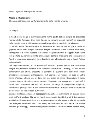 Paolo Legrenzi, Mariagrazia Favrin Magia e illusionismo Che cosa ci insegnano sul funzionamento della mente umana. La magia I mondi della magia e dell’illusionismo fanno parte del più ampio ed articolato mondo della fantasia. Che cosa hanno in comune questi mondi? La capacità della mente umana di immaginare realtà parallele a quelle in cui viviamo. Lo studio della fantasia-magia in relazione ai bambini ed al gioco risale al gigante sacro Jean Piaget. Secondo Piaget i bambini, a tre quattro anni d’età, immaginano di aver causato loro stessi lo spostamento di oggetti fuori dalla loro portata e, persino ad otto anni, alcuni bambini ritengono che le nuvole o i fiumi si muovano secondo i loro desideri, non obbedendo cioè a leggi fisiche indipendenti. Già negli anni trenta, ad un esame più attento, queste ipotesi sul ruolo della magia nel pensiero infantile non vennero confermate. Huang, in uno studio sistematico del 1930, presenta a bambini di quattro anni fenomeni strani chiedendo spiegazioni dell’accaduto. Ad esempio, si mostra un tubo di vetro pieno d’acqua, chiuso da un lato con un pezzo di carta. Rovesciato il tubo, l’acqua, invece di cadere, resta dentro. I bambini non conoscono a quell’età il ruolo della pressione dell’aria, e tuttavia, in luogo di spiegazioni magiche, ricorrono a principi fisici a loro noti come l’adesività: “L’acqua non esce perché c’è qualcosa di appiccicoso sul vetro”. Questa riluttanza all’uso di spiegazioni magiche è confermata in quegli stessi anni dall’antropologo Margaret Mead, osservando bambini privi di formazione scolastica. Di rado essi ricorrono spontaneamente alla magia o alla stregoneria per spiegare fenomeni fisici. Nel caso, ad esempio, di una barca che aveva mollato gli ormeggi, i bambini reagiscono dicendo: “Non era stata fissata bene, 1 adesso andrà al largo”, “Popoli (il proprietario) non l’ha legata, adesso perderà la canoa”, e così via. Negli anni novanta inizia una tradizione di studi più accurata. Ad esempio, si lasciano cadere oggetti in vari contenitori truccati. Talvolta questi oggetti spariscono, altre volte rimpiccioliscono o ingrandiscono. I bambini, dai quattro agli otto anni di età, cercano di spiegare questi fenomeni inusitati in due modi: o inventando principi fisici sconosciuti oppure ricorrendo alla magia. Quando sono piccoli non hanno nessuna difficoltà nell’invocare principi di natura magica, che violano persino il buon senso. In seguito utilizzano spiegazioni immaginifiche che orecchiano la fisica imparata a scuola. Anche da adulti la comprensione scientifica del mondo continua a convivere con cose che non riusciamo a spiegare. Basti pensare che i più non hanno la minima idea di come funzioni la televisione, il cellulare o il forno a microonde. Eppure ben pochi credono che gli elettrodomestici siano magici. Quando si cresce il magico non scompare ma assume anche un’altra funzione, diventando per lo più intrattenimento. Piace cioè sotto forma di fiabe che si svolgono in mondi immaginari, che violano in misura maggiore o minore le leggi della quotidianità. Si pensi, ad esempio, alle tre favole di Calvino raccolte nel volume I nostri antenati. In una (Il barone rampante) abbiamo il protagonista che da bambino decide di vivere sugli alberi: il racconto si dipana in una storia inusitata ma non magica. Al contrario, nelle altre due, si narrano le gesta di un cavaliere inesistente, una corazza vuota che si comporta da perfetto ufficiale, e le vite dei due semi-corpi di un visconte tranciato dalla testa ai piedi da un fendente turco. Ovviamente il cavaliere ed il visconte, vivendo in queste condizioni, violano le nostre conoscenze di biologia spicciola. Più cose sappiamo, più mondi paralleli possiamo inventare. E tuttavia nel passare dal mondo reale a quello magico dobbiamo tenere fermi dei vincoli. Animali che mutano di dimensione o di forma sono stati presentati a bambini di quattro e cinque anni. Si domanda loro se è possibile che quell’animale cambi in quel dato modo rispetto alle forme e dimensioni note e familiari. Le risposte indicano una capacità precoce di distinguere ciò che è strano, ma plausibile, da ciò che non lo è. Ad esempio, si può accettare una forte ed inusitata crescita di 2 dimensioni rispetto alla forma standard: un rimpicciolimento delle stesse proporzioni appare meno credibile. Provate a sottoporre a bambini profili di animali dalle forme fantastiche, chiedendo loro se alcune protuberanze corrispondano a gambe o braccia, oppure dove sono collocati il cervello o gli occhi. In questi casi i bambini non rispondono a caso, ma trasferiscono sistematicamente le nozioni apprese circa il funzionamento degli animali che conoscono a questi esseri sconosciuti: gli occhi vengono collocati in quella protuberanza che sembra la testa, e cioè la sporgenza più grossa dove viene localizzato anche il cervello. Il cuore è all’interno del blocco centrale. Questo trasferimento di proprietà dal noto all’ignoto avviene anche con esseri artificiali, come nel recente cartone animato Wall-E, dove i comportamenti di un corpo umano vengono spontaneamente proiettati sulle componenti meccaniche di un trattorino/uomo e su una vezzosa trattorina/femmina (battezzata, da un bambino seduto al cinema, “Walla”). Su questi meccanismi si basano la fantascienza e la fanta-storia, cioè quei romanzi in cui, ad esempio, Hitler vince la seconda guerra mondiale (il prototipo è La svastica sul sole di Philip Dick). Molti bambini hanno pratica di maghi o prestigiatori, per averli visti alle loro festicciole, in carne ed ossa, o alla televisione. Quando hanno otto anni, anche se parlano di magia, ad un esame più attento ci si accorge che alludono a trucchi, analoghi a quelli fatti dai prestigiatori. I media tendono a presentare come maghi sia quelli veri e propri (mago Otelma) sia gli illusionisti (mago Casanova). I protagonisti stessi alimentano ad arte questa confusione,