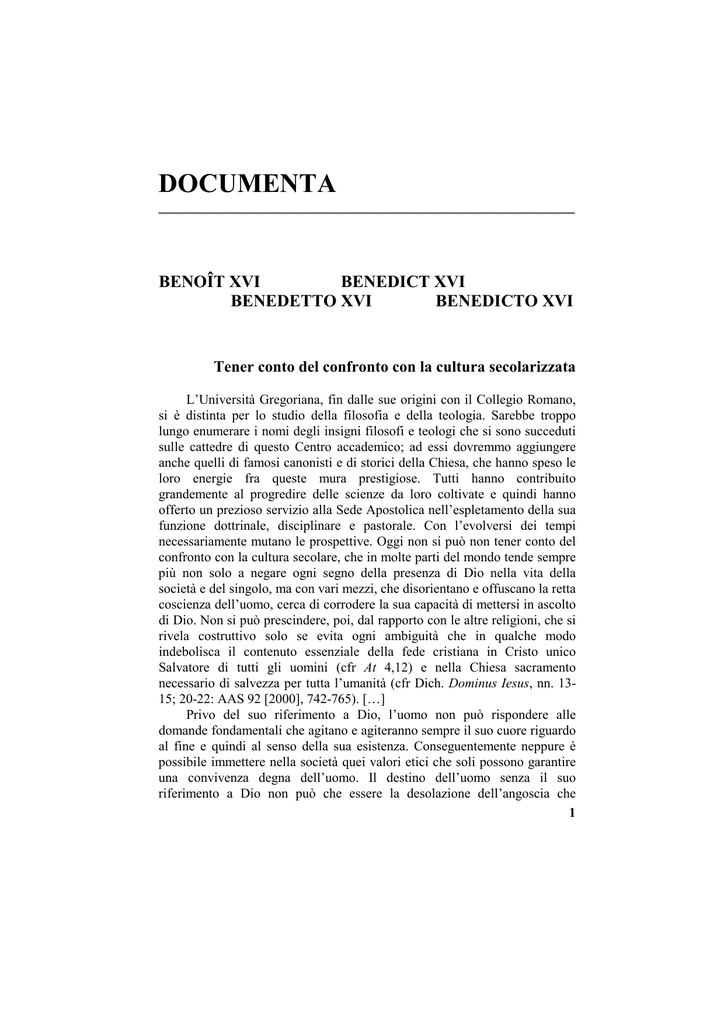 DOCUMENTA ______________________________________________________________ BENOÎT XVI BENEDICT XVI BENEDETTO XVI BENEDICTO XVI Tener conto del confronto con la cultura secolarizzata L’Università Gregoriana, fin dalle sue origini con il Collegio Romano, si è distinta per lo studio della filosofia e della teologia. Sarebbe troppo lungo enumerare i nomi degli insigni filosofi e teologi che si sono succeduti sulle cattedre di questo Centro accademico; ad essi dovremmo aggiungere anche quelli di famosi canonisti e di storici della Chiesa, che hanno speso le loro energie fra queste mura prestigiose. Tutti hanno contribuito grandemente al progredire delle scienze da loro coltivate e quindi hanno offerto un prezioso servizio alla Sede Apostolica nell’espletamento della sua funzione dottrinale, disciplinare e pastorale. Con l’evolversi dei tempi necessariamente mutano le prospettive. Oggi non si può non tener conto del confronto con la cultura secolare, che in molte parti del mondo tende sempre più non solo a negare ogni segno della presenza di Dio nella vita della società e del singolo, ma con vari mezzi, che disorientano e offuscano la retta coscienza dell’uomo, cerca di corrodere la sua capacità di mettersi in ascolto di Dio. Non si può prescindere, poi, dal rapporto con le altre religioni, che si rivela costruttivo solo se evita ogni ambiguità che in qualche modo indebolisca il contenuto essenziale della fede cristiana in Cristo unico Salvatore di tutti gli uomini (cfr At 4,12) e nella Chiesa sacramento necessario di salvezza per tutta l’umanità (cfr Dich. Dominus Iesus, nn. 1315; 20-22: AAS 92 [2000], 742-765). […] Privo del suo riferimento a Dio, l’uomo non può rispondere alle domande fondamentali che agitano e agiteranno sempre il suo cuore riguardo al fine e quindi al senso della sua esistenza. Conseguentemente neppure è possibile immettere nella società quei valori etici che soli possono garantire una convivenza degna dell’uomo. Il destino dell’uomo senza il suo riferimento a Dio non può che essere la desolazione dell’angoscia che 1 conduce alla disperazione. Solo in riferimento al Dio-Amore, che si è rivelato in Gesù Cristo, l’uomo può trovare il senso della sua esistenza e vivere nella speranza, pur nell’esperienza dei mali che feriscono la sua esistenza personale e la società in cui vive. La speranza fa sì che l’uomo non si chiuda in un nichilismo paralizzante e sterile, ma si apra all’impegno generoso nella società in cui vive per poterla migliorare. Alla Comunità dei Docenti, degli Studenti e dei Benefattori della Pontificia Università Gregoriana, 3-11-2006. Rispondere alle sfide della cultura secolarizzata La Repubblica Federale di Germania condivide con tutto il mondo occidentale una cultura caratterizzata dalla secolarizzazione, in cui Dio scompare sempre più dalla coscienza pubblica, in cui l’unicità della figura di Cristo sbiadisce e in cui i valori formati dalla tradizione della Chiesa perdono sempre più la loro efficacia. Così, anche per il singolo la fede diventa sempre più difficile; sempre più i progetti di vita e il modo di vivere vengono determinati secondo il gusto personale. È questa la situazione che devono affrontare sia i Pastori della Chiesa sia i fedeli. Non pochi, pertanto, si sono fatti prendere dallo scoraggiamento e dalla rassegnazione, atteggiamenti che ostacolano la testimonianza del Vangelo liberatore e salvifico di Cristo. Non è forse in fondo anche il cristianesimo solo una tra tante altre proposte volte a dare un senso alla vita? È una domanda che parecchi si pongono. Al contempo, però, dinanzi alla fragilità e alla breve durata della maggior parte di tali proposte, molti guardano, domandando e sperando, al messaggio cristiano e si aspettano da noi risposte convincenti. Ai Vescovi della Germania in visita ad limina apostolorum, 10-11-2006. La nécessité du dialogue interculturel Je remercie votre Président, Son Éminence le Métropolite Damaskinos d’Andrinople, qui m’a présenté le premier fruit de votre travail : l’édition conjointe, dans leur langue originale et selon l’ordre chronologique, des trois livres sacrés des trois religions monothéistes. C’était en effet le premier 2 projet que nous avions retenu en créant ensemble cette Fondation, pour « apporter une contribution spécifique et positive au dialogue entre les cultures et entre les religions ». Comme je l’ai rappelé à plusieurs reprises […], nous sommes appelés, Juifs, Chrétiens et Musulmans, à reconnaître et à développer les liens qui nous unissent. C’est bien là l’idée qui nous a conduits à créer cette Fondation, dont le but est de rechercher « le message le plus essentiel et le plus authentique que les trois religions monothéistes, à savoir judaïsme, christianisme et islam, peuvent adresser au monde du XXIe siècle », afin de donner une nouvelle impulsion au dialogue interreligieux et interculturel, par la recherche commune et par la mise en lumière et la diffusion de ce qui, dans nos patrimoines spirituels respectifs, contribue à renforcer les liens fraternels entre nos communautés de croyants. […] Les travaux de la Fondation contribueront à une prise de conscience croissante de tout ce qui, dans les différentes cultures de notre temps, est conforme à la sagesse divine et sert la dignité de l’homme, pour mieux discerner et pour mieux rejeter tout ce qui est usurpation du nom de Dieu et dénaturation de l’humanité de l’homme. […] Nous pourrons ainsi progresser dans le dialogue interreligieux et interculturel, dialogue aujourd’hui plus nécessaire que jamais : un dialogue vrai, respectueux des différences, courageux, patient et persévérant, qui puise sa force dans la prière et qui se nourrit de l’espérance qui habite tous ceux qui croient en Dieu et qui mettent leur confiance en Lui. […] La recherche et le dialogue interreligieux et interculturels ne sont pas