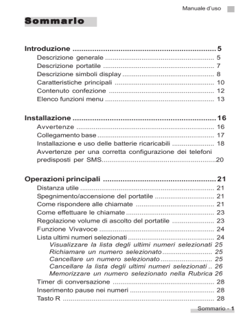Manuale d’uso Sommario Introduzione .................................................................. 5 Descrizione generale ......................................................... Descrizione portatile .......................................................... Descrizione simboli display ................................................ Caratteristiche principali .................................................... Contenuto confezione ....................................................... Elenco funzioni menu ......................................................... 5 7 8 10 12 13 Installazione .................................................................. 16 Avvertenze ........................................................................ 16 Collegamento base ............................................................. 17 Installazione e uso delle batterie ricaricabili ...................... 18 Avvertenze per una corretta configurazione dei telefoni predisposti per SMS...........................................................20 Operazioni principali .................................................... 21 Distanza utile ...................................................................... 21 Spegnimento/accensione del portatile ............................... 21 Come rispondere alle chiamate ......................................... 21 Come effettuare le chiamate .............................................. 23 Regolazione volume di ascolto del portatile ...................... 23 Funzione Vivavoce ............................................................ 24 Lista ultimi numeri selezionati ............................................. 24 Visualizzare la lista degli ultimi numeri selezionati 25 Richiamare un numero selezionato .......................... 25 Cancellare un numero selezionato ........................... 25 Cancellare la lista degli ultimi numeri selezionati .. 26 Memorizzare un numero selezionato nella Rubrica 26 Timer di conversazione ..................................................... 28 Inserimento pause nei numeri ............................................ 28 Tasto R ............................................................................... 28 Sommario - 1 Manuale d’uso Esclusione microfono ........................................................ Blocco tastiera portatile ..................................................... Funzione ricerca portatile .................................................. Servizio 4* .......................................................................... 29 29 29 30 Personalizzazioni ......................................................... 31 Volume suoneria portatile .................................................. 31 Volume suoneria esterna .......................................... 31 Volume suoneria interna ........................................... 32 Melodia suoneria portatile .................................................. 33 Melodia Esterna ......................................................... 33 Melodia Interna .......................................................... 34 Volume auricolare portatile ................................................ 34 Risposta automatica ........................................................... 35 Nome portatile .................................................................... 36 Impostazione della lingua ................................................... 36 Toni sonori (Tasti, Batteria, Fuori Portata) ......................... 37 Avviso acustico di conferma tasti ............................. 37 Avviso acustico di batteria scarica .......................... 38 Avviso acustico di fuori copertura ............................ 38 Volume suoneria base ....................................................... 39 Melodia suoneria base ....................................................... 40 Impostazione codice di sicurezza ..................................... 40 Temporizzazione segnale Flash ........................................ 41 Ripristino programmazioni .................................................. 42 Impostazione della data, dell’ora e della sveglia ................ 43 Impostazione della data ............................................ 43 Impostazione dell’ora ................................................ 43 Impostazione della sveglia ....................................... 44 Rubrica Telefonica ........................................................ 46 Inserire un nominativo in Rubrica ...................................... Visualizzare un nominativo della Rubrica ......................... Modificare un nominativo della Rubrica ............................. Cancellare un nominativo dalla Rubrica ............................. 2 - Sommario 46 47 48 49 Manuale d’uso Esportare un nominativo dalla Rubrica .............................. 50 Esportare la Rubrica .......................................................... 50 Copiare la rubrica da una scheda SIM .............................. 51 Copiare un nominativo su una scheda SIM.........................53 Codice di accesso ............................................................. 53 Servizio SMS ................................................................. 55 Composizione ed invio di un messaggio ............................ 55 Inviare un messaggio ................................................ 57 Inserimento simboli ................................................... 58 Inserimento numero telefonico ................................. 59 Salvare un messaggio ............................................... 59 Cancellare un messaggio ......................................... 60 Messaggi ricevuti ............................................................... 60 Cancellare un messaggio ......................................... 61 Rispondere ad un messaggio ................................... 61 Inoltrare un messaggio .............................................. 62 Richiamare il n
