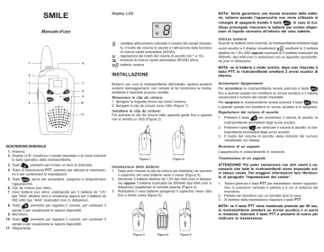 SMILE Display LCD Manuale d’uso : carattere alfanumerico indicante il numero del canale impostato, il livello del volume di ascolto e l’attivazione della funzione di ricerca canali automatica (SCAN). : regolazione del livello del volume di ascolto (da 1 a 15). : funzione di ricerca canali automatica (SCAN) attiva. : batteria scarica. INSTALLAZIONE Estrarre con cura la ricetrasmittente dall’imballo; qualora presenti evidenti danneggiamenti, non cercare di far funzionare la ricetrasmittente e riportarla al punto vendita. Rimuovere la clip da cintura: 1. Spingere la linguetta ferma clip verso l’esterno. 2. Spingere la clip da cintura verso l’alto (Figura 1). Installare la clip da cintura: Far scorrere la clip da cintura nelle apposite guide fino a quando non si sentirà un click (Figura 2). NOTA: Smile garantisce una durata massima delle batterie, tuttavia quando l’apparecchio non viene utilizzato si consiglia di spegnerlo tramite il tasto . In caso di inutilizzo prolungato rimuovere le batterie per evitare dispersioni di liquido corrosivo all’interno del vano batterie. Utilizzo batterie Quando le batterie sono scariche, la ricetrasmittente emetterà degli avvisi acustici e il display visualizzerà : sostituire le 3 batterie alkaline da 1,5V, AAA oppure ricaricare le 3 batterie ricaricabili da 550mAh, tipo AAA (non in dotazione) con un apposito caricabatterie (non in dotazione). NOTA: se la batteria è molto scarica, dopo aver rilasciato il tasto PTT, la ricetrasmittente emetterà 2 avvisi acustici di allarme. Accensione/ Spegnimento Per accendere la ricetrasmittente tenere premuto il tasto fino a quando questa non emetterà un avviso acustico e il display visualizzerà il numero del canale impostato fino Per spegnere la ricetrasmittente tenere premuto il tasto a quando questa non emetterà un avviso acustico e si spegnerà. Regolazione del volume di ascolto 1. Premere il tasto per aumentare il volume di ascolto: la ricetrasmittente emmetterà degli avvisi acustici. 2. Premere il tasto per diminuire il volume di ascolto: la ricetrasmittente emmetterà degli avvisi acustici. 3. Il livello del volume di ascolto viene indicato dal numero visualizzato sul display. DESCRIZIONE GENERALE Ricezione di un segnale 01. Antenna. 02. Display LCD: visualizza il canale impostato e le icone indicanti lo stato operativo della ricetrasmittente. L’apparecchio è costantemente in ricezione. 03. Tasto : premerlo per inviare un tono di chiamata. 04. Tasto di trasmissione PTT: premere per attivare la trasmissione e per confermare le impostazioni. 05. Tasto : serve per accendere, spegnere e programmare l’apparecchio. 06. Clip da cintura (sul retro). 07. Vano batterie (sul retro): predisposto per 3 batterie da 1,5V tipo “AAA” alkaline (non in dotazione) oppure per 3 batterie da 550 mAh tipo “AAA” ricaricabili (non in dotazione). 08. Tasto : premerlo per regolare il volume, per cambiare il canale e per visualizzare le opzioni disponibili. 09. Microfono. 10. Tasto : premerlo per regolare il volume, per cambiare il canale e per visualizzare le opzioni disponibili. 11. Altoparlante. Trasmissione di un segnale Installazione delle batterie: 1. Dopo aver rimosso la clip da cintura (se installata), far scorrere il coperchio del vano batterie verso il basso (Figura 3). 2. Introdurre 3 batterie alkaline da 1,5V tipo AAA (non in dotazione) oppure 3 batterie ricaricabili da 550mAh tipo AAA (non in dotazione) rispettando la corretta polarità (Figura 4). 3. Richiudere il vano batterie spingendo il coperchio verso l’alto fino a fondo corsa (figura 5). ATTENZIONE! Per poter comunicare con altri utenti è necessario che tutte le ricetrasmittenti siano impostate sullo stesso canale. Per maggiori informazioni fare riferimento al paragrafo “Impostazione del canale”. 1. Tenere premuto il tasto PTT per trasmettere: tenere l’apparecchio in posizione verticale e parlare a 5 cm di distanza dal microfono. 2. Parlare nel microfono con un normale tono di voce. 3. Al termine della trasmissione rilasciare il tasto PTT. NOTA: se il tasto PTT viene mantenuto premuto per 60 sec, la ricetrasmittente emetterà un avviso acustico e si porrà in ricezione; rilasciare il tasto PTT e premerlo di nuovo per riattivare la trasmissione. Tono di fine trasmissione (Roger Tone) Con questa funzione attiva, ogni volta che si rilascerà il tasto PTT, l’apparecchio emetterà un avviso acustico udibile sia da chi è in ascolto sia da chi trasmette. Per attivare questa funzione procedere come descritto di seguito. 1. Con la ricetrasmittente spenta, tenere premuto il tasto . per accendere il portatile. 2. Premere il tasto 3. La funzione Roger Tone verrà attivata. Per disattivare la funzione Roger Tone, procedere come descritto sopra. OPERAZIONI PRINCIPALI. Impostazione canale Smile dispone di 8 canali che possono essere impostati come descritto di seguito: : il numero del canale preim1. Premere brevemente il tasto postato lampeggerà sul display; 2. Premete ripetutamente i tasti e per impostare il canale desiderato (da 1 a 8). 3. Confermare il canale con il tasto PTT: l’apparecchio tornerà in stato di attesa. Invio tono di chiamata SPECIFICHE Premendo il tasto è possibile inviare un tono di circa 2 secondi all’utente chiamato. Il tono di chiamata può essere utilizzato anche per indicare l’inizio e la fine della trasmissione. • • • • Tenendo premuto il tasto la ricetrasmittente emetterà il tono di chiamata per 10 volte consecutive, al termine si porrà in stato di attesa. Il simbolo sulla destra indica che le apparecchiature elettriche ed elettroniche non devono essere gettate nei rifiuti domestici. Questa apparecchiatura nonché le batterie, a fine vita, dovranno essere portate ai centri locali di raccolta per gli adeguati trattamenti di smaltimento, secondo quanto previsto dalla normativa vigente. Per conoscere dove sono situati i luoghi suddetti, chiedere informazioni presso gli uffici comunali. RISOLUZIONE DE