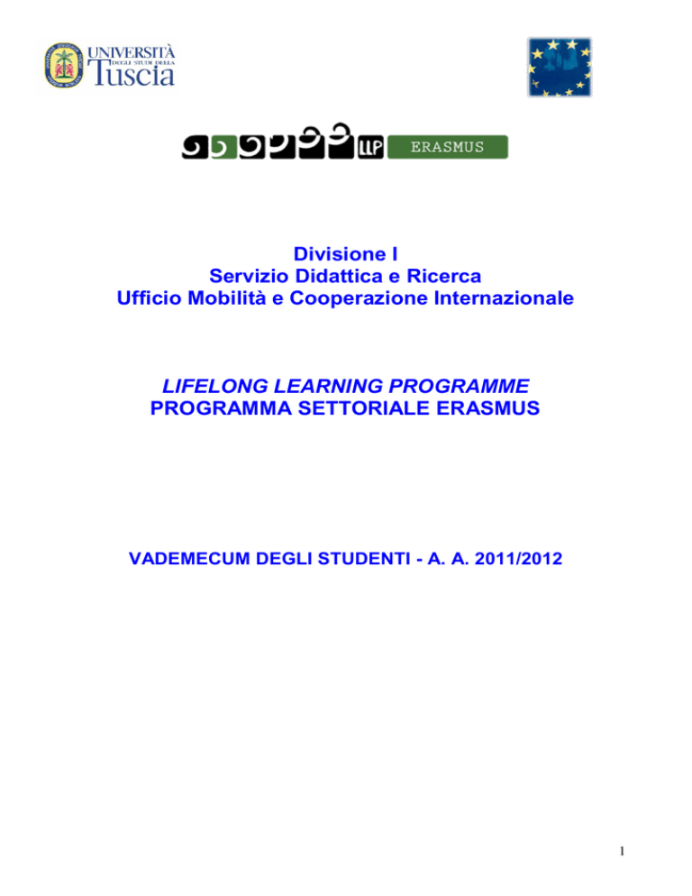 Divisione I Servizio Didattica e Ricerca Ufficio Mobilità e Cooperazione Internazionale LIFELONG LEARNING PROGRAMME PROGRAMMA SETTORIALE ERASMUS VADEMECUM DEGLI STUDENTI - A. A. 2011/2012 1 INFORMAZIONI GENERALI Il Programma d'azione comunitaria nel campo dell'apprendimento permanente, o Lifelong Learning Programme (LLP), è stato istituito con decisione del Parlamento europeo e del Consiglio il 15 novembre 2006 (GU L327), e riunisce al suo interno tutte le iniziative di cooperazione europea nell'ambito dell’istruzione e della formazione dal 2007 al 2013. Ha sostituito, integrandoli in un unico programma, i precedenti Socrates e Leonardo, attivi dal 1995 al 2006. All’interno del Lifelong Learning Programme sono previsti 4 singoli programmi settoriali: COMENIUS (Istruzione scolastica) - ERASMUS (Istruzione superiore e alta formazione) LEONARDO da VINCI (formazione iniziale e continua) - GRUNDTVIG (Educazione degli adulti). Il Programma Settoriale Erasmus prevede una mobilità studenti ai fini di studio ed una mobilità studenti per Placement (tirocini). Il Programma Settoriale Erasmus è aperto alla partecipazione: dei ventisette Stati membri dell’Unione Europea: Austria, Belgio, Bulgaria, Cipro, Danimarca, Estonia, Finlandia, Francia, Germania, Grecia, Irlanda, Italia, Lettonia, Lituania, Lussemburgo, Malta, Paesi Bassi, Polonia, Portogallo, Regno Unito, Repubblica Ceca, Romania, Slovacchia, Slovenia, Spagna, Svezia e Ungheria; dei tre paesi dello Spazio Economico Europeo: Islanda, Liechtenstein, Norvegia; del paese candidato all'adesione: Turchia; e, per alcune azioni, della Croazia. MOBILITA STUDENTI AI FINI DI STUDIO OBIETTIVI E DURATA L’ERASMUS permette agli studenti universitari di trascorrere un periodo di studio, da un minimo di 3 mesi (o un trimestre accademico completo) ad un massimo di 12 mesi (periodo di validità del periodo Erasmus per l’a.a. 2011/2012: dal 1° giugno 2011 al 30 settembre 2012), presso un’Università estera individuata nel Bando LLP – Programma Settoriale Erasmus pubblicato dall’Università degli Studi della Tuscia e relativamente alla Facoltà di appartenenza. Gli studenti hanno così la possibilità di seguire i corsi, sostenere gli esami, preparare la tesi, usufruire delle strutture e ottenere il riconoscimento degli esami sostenuti presso l’Istituto straniero. L’Erasmus dà l’opportunità agli studenti, durante il normale corso degli studi, di fare nuove esperienze culturali all'estero in un sistema universitario diverso, di perfezionare la conoscenza di un’altra lingua e di incontrare giovani di altri Paesi, partecipando così attivamente alla costruzione di un’Europa sempre più unita. Gli studenti che beneficeranno del contributo Erasmus per l’a.a. 2011/2012 devono essere regolarmente iscritti all'Università della Tuscia (sia in fase di presentazione della domanda di candidatura sia al momento della partenza per l’estero) a corsi di laurea del nuovo ordinamento, sia triennali che specialistici/magistrali, oppure a dottorati di ricerca, e saranno esonerati dal pagamento delle tasse di iscrizione nell'Università ospitante, usufruendo degli stessi diritti degli studenti dell'Ateneo di destinazione. L’Università ospitante può, tuttavia, richiedere il pagamento di modesti contributi, ad esempio per spese di assicurazione, corsi di lingua, iscrizione ad associazioni studentesche e per l’utilizzo di materiali vari. Inoltre gli studenti devono soddisfare le seguenti condizioni: essere cittadini di uno Stato membro dell’Unione Europea o di un altro Paese partecipante al Programma1 oppure essere cittadini di altri Paesi, regolarmente iscritti presso un Istituto di istruzione superiore in Italia; non avere già beneficiato negli anni precedenti di contributi Erasmus o Lingua; non usufruire contemporaneamente di altre borse di studio finanziate dall’Unione Europea; 1 I 27 Stati membri dell’Unione Europea (Austria, Belgio, Bulgaria, Cipro, Danimarca, Estonia, Finlandia, Francia, Germania, Grecia, Irlanda, Italia, Lettonia, Lituania, Lussemburgo, Malta, Paesi Bassi, Polonia, Portogallo, Regno Unito, Repubblica Ceca, Romania, Slovacchia, Slovenia, Spagna, Svezia e Ungheria), i 3 Paesi dello Spazio Economico Europeo (Islanda, Liechtenstein e Norvegia) e il Paese Candidato all’adesione (Turchia). 2 effettuare la mobilità sulla base degli accordi interuniversitari elencati nell’annuale Bando Erasmus relativamente alla Facoltà di appartenenza. Gli studenti iscritti ad un corso di laurea triennale che presumono di laurearsi prima della data di partenza per il soggiorno Erasmus, e che per tale ragione presentano domanda per trascorrere all'estero parte del primo anno del corso di laurea specialistica/magistrale, devono risultare iscritti (al momento della partenza) ad un corso di laurea specialistica/magistrale, pena il decadimento della borsa ed il mancato nulla osta alla partenza. Dovranno, quindi, predisporre un Learning Agreement (piano di studi) relativo alle attività didattiche inerenti il corso di laurea specialistica/magistrale, cui si iscriveranno. Nel caso di studenti di cittadinanza di uno dei Paesi partner, temporaneamente residenti in Italia ed iscritti presso l’Università degli Studi della Tuscia, sono eleggibili per la mobilità presso un Ateneo del loro Paese di origine, ma nel processo di selezione non verrà data loro priorità. Inoltre, la conferma della borsa di studio è subordinata all’accettazione da parte dell’Ateneo partner. Inoltre, in base alle direttive della Commissione Europea sulla mobilità degli studenti per motivi di studio (SM) o per tirocinio (SM-placement) e dell’Agenzia Nazionale LLP Italia, nell’ambito del LLP – Programma Settoriale Erasmus a partire dall’a.a. 2010/2011 uno studente potrà ricevere durante il proprio percorso accademico al massimo due borse di studio ERASMUS: 1. 2. una borsa ERASMUS per la mobilità ai fini di studio (SMS); una borsa ERASMUS per la mo