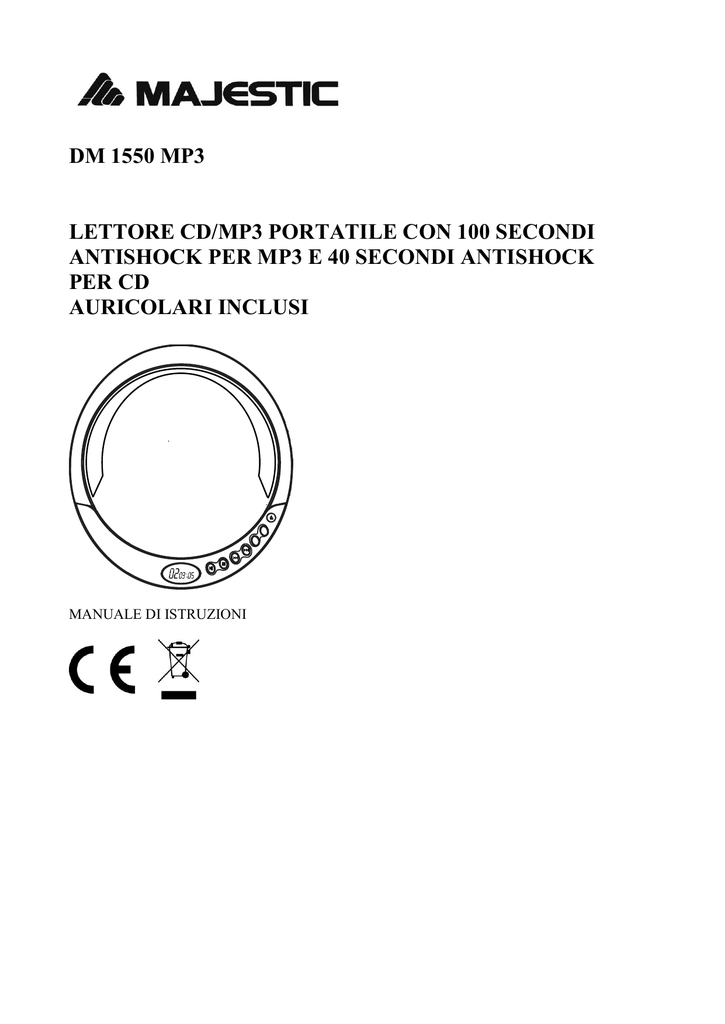 DM 1550 MP3 LETTORE CD/MP3 PORTATILE CON 100 SECONDI ANTISHOCK PER MP3 E 40 SECONDI ANTISHOCK PER CD AURICOLARI INCLUSI MANUALE DI ISTRUZIONI PRECAUZIONI DI SICUREZZA FRECCIA ALL’INTERNO DI UN TRIANGOLO EQUILATERO: si intende allertare l’utente della presenza di voltaggio pericoloso non isolato all’interno del prodotto tale da poter causare un corto circuito ed essere di pericolo per le persone. PUNTO ESCLAMATIVO: intende informare l’utente che per qualsiasi componente da sostituire bisogna rivolgersi al personale di servizio qualificato/autorizzato. PERICOLO Presenza di invisibili radiazioni laser all’apertura. Evitare la diretta esposizione alle stesse. SICUREZZA LASER: Questo apparecchio utilizza un laser. Solo il personale di servizio qualificato deve aprire l’apparecchio. ATTENZIONE: UN USO DEI COMANDI E PERFORMANCE DIVERSI DA QUELLI INDICATI POTREBBE RISULTARE PERICOLOSO A CAUSA DELL’ESPOSIZIONE ALLE RADIAZIONI. Le seguenti etichette sono fissate nella parte posteriore dell’apparecchio e indicano la presenza di raggio laser. ETICHETTA INFORMATIVA SULLE RADIAZIONI: L’etichetta è posizionata all’interno dell’apparecchio, come mostrato nell’illustrazione l’apparecchio contiene una radiazione laser in accordo con il limite del prodotto laser classe 1. Prima di procedere con l’utilizzo dell’apparecchio, si raccomanda di leggere il seguente manuale d’istruzioni ISTRUZIONI DI SICUREZZA 1. LEGGERE LE ISTRUZIONI – Leggere le istruzioni operative prima di utilizzare l’apparecchio. 2. CONSERVARE LE ISTRUZIONI – Conservare il seguente manuale d’istruzioni per un eventuale utilizzo futuro 3. PRESTARE ATTENZIONE ALLE ISTRUZIONI – Osservare attentamente tutte le avvertenze e le istruzioni operative. 4. SEGUIRE LE ISTRUZIONI – Seguire attentamente tutte le istruzioni operative 5. ACQUA E UMIDITA’ – Non usare l’apparecchio vicino all’acqua, per esempio, vicino a vasche da bagno, a lavandini, a lavelli, piscine o superfici bagnate. 6. PULIZIA – Pulire l’apparecchio solo con un panno morbido e asciutto. 7. VENTILAZIONE - L’apparecchio deve essere posizionato in un luogo che non interferisca con l’adeguata ventilazione. Non posizionare l’apparecchio sopra letti, divani o superfici simili che potrebbero ostruire le aperture di ventilazione e nemmeno in librerie troppo chiuse che potrebbero impedire la normale ventilazione dell’apparecchio stesso. On posizionare l’apparecchio sopra i termosifoni o qualsiasi sorgente che produca calore. 8. CALORE – L’apparecchio deve essere tenuto lontano dalle fonti eccessive di calore, come i termosifoni, le stufe o altri apparecchio (tipo gli amplificatori) che producono calore. 9. ALIMENTAZIONE – L’apparecchio deve essere collegato solo a una alimentazione del tipo descritta nel seguente manuale d’istruzioni o come indicato nell’etichetta posteriore. 10. CADUTA DI LIQUIDI E OGGETTI – Prestar cura particolare affinché nessun oggetto o liquido entrino all’interno dell’apparecchio attraverso le fessure. 11. RICHIESTA DI ASSISTENZA – Non cercare di aprire l’apparecchio da soli, poiché si rischierebbe l’esposizione a dannose radiazioni laser. Rivolgersi solamente al personale di servizio autorizzato. 12. ASSISTENZA – Per qualsiasi tipo di servizio che non sia tra quelli sopra descritti, l’utente si deve rivolgere al personale di servizio qualificato e autorizzato. PRIMA DI QUALSIASI OPERAZIONE Note relative ai COMPACT DISCS L’apparecchio potrebbe non riprodurre i dischi sporchi, danneggiati o graffiati per un corretto funzionamento si consiglia di usare: a. Compact Disc consigliati: usare solo compact disc con il marchio indicato : b. Usare il CD con segnale audio digitale. Per stabilire un livello di sicurezza: Impostare il Volume a un livello basso Aumentare lentamente il suono fino a che si possa sentire in maniera confortevole e chiara, senza distorsione. POSIZIONE DEI COMANDI 1. Vano CD 2. Tasto SALTO/RICERCA traccia (-) ◄◄ 3. Tasto SALTO/RICERA traccia (+) ►► 4. Tasto P (Program) / +10 5. Tasto M (Mode) 6. Display LCD 7. Tasto PLAY/PAUSE 8. Tasto STOP ■ 9. Comando VOLUME 10. Tasto apertura vano CD ▲ 11. Presa CUFFIE 12. Scomparto Batterie 13. Presa alimentazione esterna jack da 3,5mm ALIMENTAZIONE L’apparecchio funziona con due batterie 1,5V “AA” da installare o sostituire come segue: 1. Aprire il vano batterie posto sotto l’apparecchio facendo scorrere il coperchio. 2. Inserire 2 batterie di tipo “AA” (non incluse) rispettando la corretta polarità come indicato all’interno dello scomparto. Si raccomanda l’uso di batterie alcaline per una maggiore durata. 3. Richiudere il vano batterie con l’apposito coperchio. PRECAUZIONI RELATIVE ALLE BATTERIE Osservare le seguenti precauzioni quando si utilizzano le batterie con questo apparecchio: 1.Usare solo le batterie del tipo e misura specificate. 2.Accertarsi di rispettare la corretta polarità quando si inseriscono le batterie come indicato all’interno dello scomparto. Le batterie inserire al contrario potrebbero causare danni all’apparecchio stesso. 3.Non mischiare batterie diverse (per esempio batterie alcaline con batterie zinco carbonio) e nemmeno vecchie batterie con nuove. 4.Se le batterie all’interno dell’apparecchio sono consumate o se l’apparecchio stesso non viene usato per lungo tempo, rimuovere le batterie al fine di prevenire qualsiasi danno causato da perdita di liquido dalle batterie stesse. 5.Non tentare di ricaricare batterie non ric remearicabili, si potrebbero surriscaldare e d esplodere 6.Non gettare le batterie nel fuoco, potrebbero esplodere o perdere liquido. 7.Pulire i contatti delle batterie prima dell’installazione delle batterie stesse. Alimentazione esterna: collegare alla Presa Jack da 3,5mm un alimentatore adattatore (non incluso) AC/DC ( AC 230V 50Hz – DC 5V / 800mA) OPERAZIONI Introduzione 1. Inserire gli auricolari (in dotazione) nella presa ingres