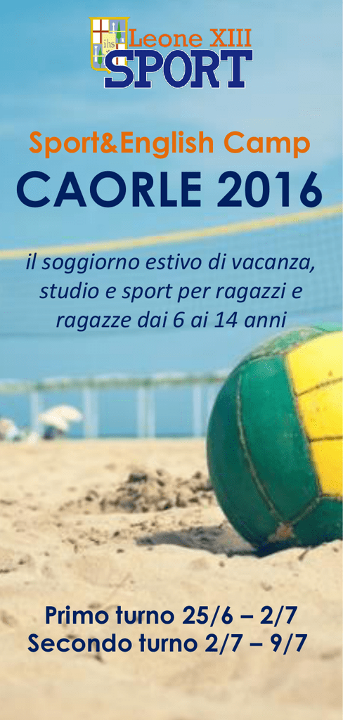 Sport&English Camp CAORLE 2016 il soggiorno estivo di vacanza, studio e sport per ragazzi e ragazze dai 6 ai 14 anni Primo turno 25/6 – 2/7 Secondo turno 2/7 – 9/7 Sport&English Camp Il Camp offre una vacanza sportiva orientata al divertimento, all’attività di gruppo in mezzo alla natura e alla fraternizzazione tra i ragazzi. L’iscrizione è aperta a ragazzi e ragazze fra i 6 e i 14 anni; i partecipanti sono divisi in gruppi in base all’ età, per garantire il corretto insegnamento didattico e per facilitare la socializzazione tra loro. In base al meteo e alla disponibilità delle strutture, ogni giorno il Camp offre: • Attività sportive svolte nella Villa Sant’Ignazio e in strutture sportive in loco • Insegnamento dell’inglese in forma ludico didattica con insegnante madrelingua • Attività didattiche Il programma settimanale prevede un’escursione a stretto contatto con la natura e una giornata di divertimento al parco acquatico. Lo Sport Il Camp dà la possibilità di provare tanti sport. Gli Istruttori sono qualificati in Scienze Motorie e si avvalgono del supporto di professionisti di settore per la pratica di discipline specifiche. L’inglese Ogni giorno i ragazzi si dedicano all’apprendimento dell’inglese attraverso attività ludico didattiche a cura di insegnanti madrelingua. Le attività didattiche Il Camp prevede ogni giorno uno spazio compiti e nella settimana sono previsti momenti ludico-didattici legati al territorio di Caorle e alla natura, come la visita alle fattorie didattiche e ai musei paesaggistici immersi nella natura. La Villa Sant’Ignazio Villa Sant’Ignazio si trova a Caorle (Venezia) sul mar Adriatico. Immersa in un parco, si affaccia su una spiaggia con accesso privato ed è dotata di tutte le attrezzature balneari e sportive. La Villa offre numerosi servizi di alta qualità e attrezzature ed impianti sportivi. Le strutture sportive Per lo svolgimento delle attività sportive il Camp utilizza gli impianti della Villa e quelli di Caorle. Il territorio offre moderne e attrezzate strutture per la pratica di discipline tra le quali: canoa, beach soccer, basket, hockey, beach rugby, volley, danza, ginnastica ritmica, calcio, golf, nuoto, orienteering, dodgeball, pallamano, pallanuoto, tennistavolo. La giornata-tipo prevede: • sveglia alle 8:00 e colazione • alle 8:30 saluto alla giornata • attività sportive ed escursioni al mattino e al pomeriggio • pranzo alle 12:15 • compiti e lezioni d’inglese • cena alle 19:45 e giochi di gruppo Ogni mattina i ragazzi scopriranno il programma dettagliato della giornata che sta per iniziare. La quota d’iscrizione è di 600€ a settimana e comprende: • Vitto e alloggio in Villa Sant’Ignazio • Trasporti dall’istituto Leone XIII e in loco • Assicurazione • Escursioni e visite guidate • Kit sportivo di due t-shirt Le iscrizioni aprono il 15 Marzo e fino al 1 Aprile saranno riservate agli studenti Leoniani e agli iscritti al Centro Sportivo; bisogna compilare il modulo d’iscrizione disponibile online e negli uffici del Centro Sportivo in via Rossetti 4 e consegnarlo in Segreteria o via mail; gli orari della Segreteria sono: dal lunedì al venerdì dalle 8:30 alle 10:30 e dalle 15:00 alle 18:30, Sabato dalle 11:15 alle 13:00. Le iscrizioni chiudono il 13 Maggio. I posti disponibili sono 90, al raggiungimento dei quali le iscrizioni verranno chiuse. Sono previsti sconti per chi partecipa a entrambe le settimane o assieme a fratelli e sorelle. Indirizzo Villa Sant’Ignazio: Viale Selva Rosata 83 30021 Caorle - Venezia INFO E ISCRIZIONI Centro Sportivo Leone XIII Via Rossetti 4 Milano 02 4349901 [email protected]