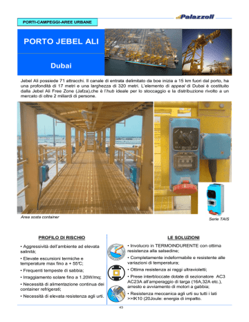 PORTI-CAMPEGGI-AREE URBANE PORTO JEBEL ALI Dubai Jebel Ali possiede 71 attracchi. Il canale di entrata delimitato da boe inizia a 15 km fuori dal porto, ha una profondità di 17 metri e una larghezza di 320 metri. L’elemento di appeal di Dubai è costituito dalla Jebel Ali Free Zone (Jafza),che è l’hub ideale per lo stoccaggio e la distribuzione rivolto a un mercato di oltre 2 miliardi di persone. Area sosta container Serie TAIS PROFILO DI RISCHIO LE SOLUZIONI • Aggressività dell’ambiente ad elevata salinità; • Involucro in TERMOINDURENTE con ottima resistenza alla salsedine; • Elevate escursioni termiche e temperature max fino a + 55°C; • Completamente indeformabile e resistente alle variazioni di temperatura; • Frequenti tempeste di sabbia; • Ottima resistenza ai raggi ultravioletti; • Irraggiamento solare fino a 1.20W/mq; • Prese interbloccate dotate di sezionatore AC3 AC23A all’amperaggio di targa (16A,32A etc.), arresto e avviamento di motori a gabbia; • Necessità di alimentazione continua dei container refrigerati; • Resistenza meccanica agli urti su tutti i lati >>IK10 (20Joule: energia di impatto. • Necessità di elevata resistenza agli urti. 43