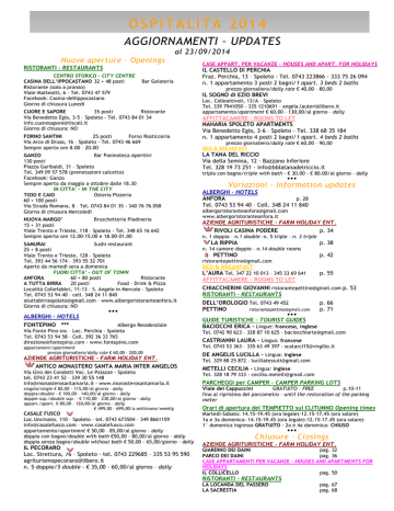 OSPITALITÀ 2014 AGGIORNAMENTI – UPDATES al 23/09/2014 Nuove aperture – Openings RISTORANTI – RESTAURANTS CENTRO STORICO – CITY CENTRE CASINA DELL’IPPOCASTANO 32 + 48 posti Ristorante (solo a pranzo) Viale Matteotti, 6 - Tel. 0743 47 579 Facebook: Casina-dellippocastano Giorno di chiusura Lunedì Bar Gelateria CUORE E SAPORE 35 posti Ristorante Via Benedetto Egio, 3-5 – Spoleto - Tel. 0743 84 01 34 [email protected] Giorno di chiusura: NO FORNO SANTINI 25 posti Forno Rosticceria Via Arco di Druso, 16 – Spoleto - Tel. 0743 46 669 Sempre aperto ore 8.00 – 20.00 GANZO Bar Paninoteca Aperitivi 130 posti Piazza Garibaldi, 31 – Spoleto Tel. 349 09 57 578 (prenotazioni calcetto) Facebook: Ganzo Sempre aperto da maggio a ottobre dalle 18.30 IN CITTA’ – IN THE CITY TIZIO E CAIO Osteria Pizzeria 60 + 100 posti Via Strada Romana, 8 – Tel. 0743 84 01 35 - 340 76 76 058 Giorno di chiusura Mercoledì NUOVA MARGO’ Bruschetteria Piadineria 15 + 31 posti Viale Trento e Trieste, 118 – Spoleto - Tel. 348 65 16 642 Sempre aperto ore 12.00-15.00 e 18.00-01.00 SAMURAI Sushi restaurant 25 + 8 posti Viale Trento e Trieste, 128 – Spoleto Tel. 393 44 56 174 – 393 55 32 701 Aperto da martedì sera a domenica FUORI CITTA’ – OUT OF TOWN ANFORA 60 + 80 posti Ristorante A TUTTA BIRRA 20 posti Food – Drink & Pizza Località Collefabbri, 11-13 – S. Angelo in Mercole – Spoleto Tel. 0743 53 94 40 – cell. 348 24 11 840 [email protected] – www.albergoristoranteanfora.it Giorno di chiusura: NO ALBERGHI – HOTELS FONTEPINO *** Albergo Residenziale Via Fonte Pino snc – Loc. Perchia - Spoleto Tel. 0743 53 94 58 – Cell. 392 36 33 765 [email protected] - www.fontepino.com appartament/apartment prezzo giornaliero/daily rate € 60,00 – 200,00 AZIENDE AGRITURISTICHE - FARM HOLIDAY ENT. ANTICO MONASTERO SANTA MARIA INTER ANGELOS Via Giro dei Condotti Voc. Le Palazze - Spoleto tel. 0743 23 41 52 – 339 30 55 148 [email protected] - www.monasterosantamaria.it CASE APPART. PER VACANZE – HOUSES AND APART. FOR HOLIDAYS IL CASTELLO DI PERCHIA Fraz. Perchia, 13 – Spoleto - Tel. 0743 223866 - 333 75 26 094 n. 1 appartamento 3 posti 2 bagni/1 apart. 3 beds 2 baths prezzo giornaliero/daily rate € 40,00 – 80,00 IL SOGNO di EZIO BREVI Loc. Colleattivoli, 13/A – Spoleto Tel. 339 7941050 - 335 1210691 – [email protected] appartamento/apartment € 60,00 – 130,00/al giorno – daily AFFITTACAMERE – ROOMS TO LET NAHARIA SPOLETO APARTMENTS Via Benedetto Egio, 3-6 – Spoleto - Tel. 338 68 35 184 n. 1 appartamento 4 posti 2 bagni/1 apart. 4 beds 2 baths prezzo giornaliero/daily rate € 60,00 – 90,00 BED & BREAKFAST LA TANA DEL RICCIO Via della Semina, 12 - Bazzano Inferiore Tel. 328 19 73 251 - [email protected] tripla con bagno/triple with bath - € 30.00 - € 80.00/al giorno – daily Variazioni – Information updates ALBERGHI – HOTELS p. 28 ANFORA Tel. 0743 53 94 40 – Cell. 348 24 11 840 [email protected] www.albergoristoranteanfora.it AZIENDE AGRITURISTICHE - FARM HOLIDAY ENT. RIVOLI CASINA PODERE p. 34 n. 1 doppia – n.1 double- n. 5 triple – n. 3 triple LA RIPPIA p. 38 n. 14 camere doppie – n.14 double rooms PETTINO p. 42 [email protected] BED & BREAKFAST L’AURA Tel. 347 22 10 013 – 345 33 69 641 AFFITTACAMERE – ROOMS TO LET p. 55 CHIACCHERINI GIOVANNI [email protected] p. 53 RISTORANTI – RESTAURANTS DELL’OROLOGIO Tel. 0743 49 452 PETTINO [email protected] p. 66 p. 71 GUIDE TURISTICHE – TOURIST GUIDES BACIOCCHI ERICA - Lingue: francese, inglese Tel. 0742 90 623 – 328 87 10 625 - [email protected] CASTRIANNI LAURA - Lingua: francese Tel. 0743 53 363 – 335 63 49 397 - [email protected] DE ANGELIS LUCILLA - Lingua: inglese Tel. 329 88 25 872 – [email protected] METELLI CECILIA - Lingua: inglese Tel. 328 18 79 333 - [email protected] PARCHEGGI per CAMPER – CAMPER PARKING LOTS singola/single € 80,00 – 115,00/al giorno - daily doppia/double - € 100,00 – 140,00/al giorno - daily doppie sup./double sup. - € 110,00 – 230,00/al giorno - daily appart./apart. € 80,00 – 120,00/al giorno – daily € 499,00 – 699,00/a settimana/weekly Viale dei Cappuccini GRATUITO – FREE p.10-11 fino al ripristino del parcometro – until the restoration of the parking meter CASALE FUSCO Loc.Uncinano, 110 – Spoleto - tel. 0743 673504 – 349 8661159 [email protected] – www.casalefusco.com appartamento/apartment € 50,00 – 85,00/al giorno – daily doppia con bagno/double with bath €50,00 - 80,00/al giorno – daily doppia senza bagno/double without bath € 50,00 - 65,00/giorno – daily Martedì-Sabato: 14.15-19.45 (ora legale)-12.15-17.45 (ora solare) 1a e 3a domenica: 14.15-19.45 (ora legale)-12.15-17.45 (ora solare) 1° domenica ingresso GRATUITO - 2a e 4a domenica: CHIUSO IL PECORARO Loc. Strettura, 76 – Spoleto - tel. 0743 229685 – 335 53 95 590 [email protected] n. 5 doppie/5 double - € 35,00 – 60,00/al giorno – daily Orari di apertura del TEMPIETTO sul CLITUNNO Opening times Chiusure – Closings AZIENDE AGRITURISTICHE - FARM HOLIDAY ENT. GIARDINO DEI DAINI pag. 32 PARCO DEI DAINI pag. 36 CASE APPARTAMENTI PER VACANZE – HOUSES AND APARTMENTS FOR HOLIDAYS IL COLLICELLO pag. 50 RISTORANTI – RESTAURANTS LA LOCANDA DEL PASSERO LA SACRESTIA pag. 67 pag. 68