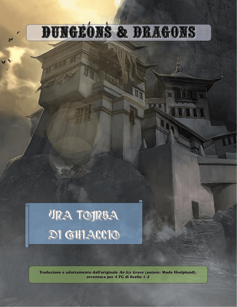 DUNGEONS & DRAGONS UNA TOMBA DI GHIACCIO Traduzione e adattamento dall'originale An Icy Grave (autore: Mads Hvelplund), avventura per 4 PG di livello 1-2 Un piccolo monastero tra i monti è vittima del cattivo tempo e della sfortuna: una violenta bufera e la vendetta di un abate morto si sono abbattute sui poveri monaci, trasformando il secluso monastero in un cimitero ghiacciato. piena. Tuto questo accadde un anno fa, e da allora il monastero è stato la tomba, muta e glaciale, dei corpi dei monaci. Presto, però, a un anno di distanza, sorgerà nuovamente la luna piena, e fra tre giorni il fantasma dell'abate risorgerà per infestare nuovamente il monastero. Preparazione L'avventura si svolge nell'arco di una manciata di giorni e notti, Sommario parte dei quali i PG li trascorreranno nel monastero, L'avventura ha inizio quando i PG cercano riparo da una scontri ostici - fatta eccezione per il combattimento finale ultima pagina). La tempesta è talmente violenta che continuare personaggi siano presenti un guerriero e un chierico, per personaggi si ritrovano intrappolati nel monastero per tre notti. comunque, sarà il cervello, più che i muscoli, a salvare i PG. non-morti minori, di cui dovrebbero avere facile ragione. Manuale dei Mostri di D&D: i Ghoul dei Ghiacci e l'Haunt dei Ghiacci, tratti dal supplemento Creature Collection (Sword & Sorcery); le loro statistiche sono comunque presentate nel testo, dunque non è necessario possedere tale manuale. crescendo di tensione in vista della notte: alla mezzanotte, intrappolati da una bufera. L'avventura non prevede molti contro il fantasma - ma è comunque consigliabile che tra i aiutare ilgruppo a sopravivere. Superati i primi scontri, Nell'avventura sono presenti due creature non contemplate nel bufera nel monastero (una mappa dell'abbazia compare in a viaggiare senza ripararsi costituirebbe un suicidio; così i Durante l'esplorazione del complesso, si imbatteranno in alcuni L'importante, in queste sessioni, è narrare gli eveti in un infatti, l'abate si materializza e il monastero sembra diventare ancora più gelido. Apparirà nel suo studio (Stanza 18) o fuori dal monastero, nella tempesta, a seconda di dove si trovino i PG (per le statistiche dell'abate, cfr. La descrizione dell'Area 18). Background Nascosto in cima a monti isolati, giace il monastero dell'Ordine della Suprema Luce. I monaci della confraternita si dedicavano al duro lavoro e alla meditazione per raggiungere l'illuminazione. L'abate era molto rigido nell'applicazione dei suoi principi, elastico come una roccia e clemente come i picchi innevati dove era edificato il monastero. Insegnava ai discepoli che la via per la vera forza passa attaverso l'astinenza dalle emozioni e dai piaceri terreni. Lui per primo si recava spesso in una grotta tra le montagne, dedicandosi intere giornate alla meditazione e a digiuni ascetici. I novizi dovevano assicurarsi che durante il periodo di astinenza del maestro fosse sempre disposta della legna secca da ardere per Riapparirà anche nelle due notti seguenti. La mattina del quarto giorno, la bufera si placherà, lasciando i PG liberi di adarsene e proseguire per il loro cammino. Probabilmente i PG riusciranno a sconfiggere il Mantscuro, i non-morti più deboli e le statue durante il primo giorno; dovrebbe avanzare loro del tempo per preapararsi alla notte; i PG più furbi impiegheranno il loro tempo alla ricerca di indizi che gettino un po' di luce su chi li ha attaccati la notte prima. Potrebbe accadere che riescano a sconfiggere l'abate già la seconda notte, anche se sarebbe meglio che il DM lo facesse sopravvivere fino al climax dell'avventura, durante la terza notte. mantenere un fuoco acceso, indispensabile per la sopravivenza I Ghoul (LI 2) in quelle gelide montagne. Se i PG accendono la fornace nel seminterrato, il fumo che tirannica del suo mentore: reputandosi più idoneo a ricoprire creature cercheranno di avvicinarsi di soppiatto al monastero depositata nella grotta fosse bagnata, sapendo che l'abate non introdurranno nel complesso, rimanendo al piano terra. Se si non in caso di vita o di morte. Due notti dopo che il maestro si attaccandoli quando sono isolati (se i PG dovessero separarsi), e ferocia. Troppo tardi l'abate si accorse del pericolo e tentò di divorarli in seguito. Se vengono scoperti prima di introdursi nel inservibile, si rese subito conto del diabolico piano del suo i PG, e cercheranno di conquistare la loro fiducia. Essendo a gelide, ma venne gettato in un crepaccio dal vento, e morì potente e famelico", non rimarranno per la notte. Se i PG La stessa notte, sorse la sua ombra, piena di risentimento, con troveranno riparo anche all'aperto. Ovviamente, si tratta di una L'abate, ora uno Haunt dei Ghiacci, fece ritorno all'abbazia, mangiarli. Tuttavia Zemal, il secondo dell'abate , divenne stufo della guida la posizione di capo del monastero, fece sì che la legna avrebbe mai interrotto le sue pratiche per accendere il fuoco, se era diretto alla grotta, soffiò una bufera gelida con inattesa accendere un fuoco. Accortosi che la legna era bagnata e subordinato. Cercò di scendere dalle montagne fra le burrasche pronunciando una maledizione contro i suoi confratelli. un solo obiettivo: la vendetta. uccidendo tutti i monaci, unica testimone della strage la luna fuoriesce dal comignolo attirerà 2 Ghoul dei Ghiacci. Le verso mezzogiorno. Se non incontrano opposizione, si presenterà l'opportnità, tenderanno un agguato ai PG, nascondendo i corpi nella neve all'esterno del monastero, per monastero, si fingeranno dei viandanti in cerca di riparo, come conoscenza del fatto che nell'abbazia risiede uno "spirito chiedono se conoscono altri rifugi, i ghoul risponderanno che trappola: intendono lasciare che il gelo uccida i PG per poi I Ghoul dei Ghiacci non sono propriamente dei non-morti, ma dei cannibali depravati che si cibano di viandanti poco accorti tra i monti. Assomigliano a dei selvaggi, con la carnagione scurit