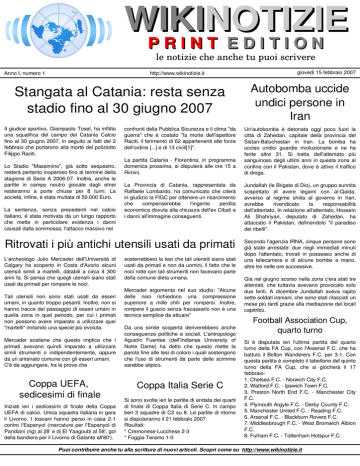 WIKINOTIZIE P R I N T E D I T I O N P R I N T E D I T I O N le notizie che anche tu puoi scrivere Anno I, numero 1 http://www.wikinotizie.it Stangata al Catania: resta senza stadio fino al 30 giugno 2007 Il giudice sportivo, Giampaolo Tosel, ha inflitto una squalifica del campo del Catania Calcio fino al 30 giugno 2007, in seguito ai fatti del 2 febbraio che portarono alla morte del poliziotto Filippo Raciti. Lo Stadio "Massimino", già sotto sequestro, resterà pertanto inoperoso fino al termine della stagione di Serie A 200607. Inoltre, anche le partite in campo neutro giocate dagli etnei resteranno a porte chiuse per 8 turni. La società, infine, è stata multata di 50.000 Euro. La sentenza, senza precedenti nel calcio italiano, è stata motivata da un lungo rapporto che mette in particolare evidenza i danni causati dalla sommossa, l'attacco massivo nei confronti della Pubblica Sicurezza e il clima "da guerra" che è costato "la morte dell'ispettore Raciti, il ferimento di 62 appartenenti alle forze dell'ordine [...] e di 13 civili[1]". La partita Catania Fiorentina, in programma domenica prossima, si disputerà alle ore 15 a Rimini. La Provincia di Catania, rappresentata da Raffaele Lombardo, ha comunicato che citerà in giudizio la FIGC per ottenere un risarcimento che compenserebbe l'ingente perdita economica dovuta alla chiusura dell'ex Cibali e i danni all'immagine conseguenti. Ritrovati i più antichi utensili usati da primati L'archeologo Julio Mercader dell'Università di Calgary ha scoperto in Costa d'Avorio alcuni utensili simili a martelli, databili a circa 4 300 anni fa. Si pensa che quegli utensili siano stati usati da primati per rompere le noci. Tali utensili non sono stati usati da esseri umani, in quanto troppo pesanti. Inoltre, non si hanno tracce del passaggio di esseri umani in quella zona in quel periodo, per cui i primati non possono avere imparato a utilizzare quei "martelli" imitando una specie più evoluta. Mercader sostiene che questo implica che i primati avevano quindi imparato a utilizzare simili strumenti o indipendentemente, oppure da un antenato comune con gli esseri umani. C'è da aggiungere, fra le prove che Coppa UEFA, sedicesimi di finale Iniziati ieri i sedicesimi di finale della Coppa UEFA di calcio. Unica squadra italiana in gara il Livorno. I toscani hanno perso in casa 21 contro l'Espanyol (marcature per l'Espanyol di Pandiani (rig) al 28' e di El Yaagoubi al 58', gol della bandiera per il Livorno di Galante all'80'). sosterrebbero la tesi che tali utensili siano stati usati da primati e non da uomini, il fatto che le noci rotte con tali strumenti non facevano parte della comune dieta umana. Mercader argomenta nel suo studio: "Alcune delle noci richiedono una compressione superiore a mille chili per rompersi. Inoltre, rompere il guscio senza fracassarlo non è una tecnica semplice da attuare" Da una simile scoperta deriverebbero anche conseguenze politiche e sociali. L'antropologo Agustín Fuentes (dell'Indianas University of Notre Dame) ha detto che questo mette la parola fine alle tesi di coloro i quali sostengono che l'uso di strumenti da parte delle scimmie sarebbe atipico. Coppa Italia Serie C Si sono svolte ieri le partite di andata dei quarti di finale di Coppa Italia di Serie C. In campo ben 3 squadre di C2 su 8. Le partite di ritorno si disputeranno il 21 febbraio 2007. Risultati: * CremoneseLucchese 23 * FoggiaTeramo 10 giovedì 15 febbraio 2007 Autobomba uccide undici persone in Iran Un'autobomba è detonata oggi poco fuori la città di Zahedan, capitale della provincia del SistanBaluchestan in Iran. La bomba ha ucciso undici guardie rivoluzionarie e ne ha ferite altre 31. Si tratta dell'attentato più sanguinoso degli ultimi anni in questa zona al confine con il Pakistan, dove è attivo il traffico di droga. Jundallah (le Brigate di Dio), un gruppo sunnita sospettato di avere legami con alQaida, avverso al regime shiita al governo in Iran, avrebbe rivendicato la responsabilità dell'attentato. In relazione all'attentato, Hossein Ali Shahriyari, deputato di Zahedan, ha attaccato il Pakistan, definendolo "il paradiso dei ribelli". Secondo l'agenzia IRNA, cinque persone sono già state arrestate: due negli immediati minuti dopo l'attentato, trovati in possesso anche di una telecamera e di alcune bombe a mano, altre tre nelle ore successive. Già nel giugno scorso nella zona c'era stati tre attentati, che tuttavia avevano provocato solo due feriti. A dicembre Jundallah aveva rapito sette soldati iraniani, che sono stati rilasciati un mese più tardi grazie alla mediazione dei locali capitribù. Football Association Cup, quarto turno Si è disputata ieri l'ultima partita del quarto turno della FA Cup, con l'Arsenal F.C. che ha battuto il Bolton Wanderers F.C. per 31. Con questa partita è completo il tabellone del quinto turno della FA Cup, che si giocherà il 17 febbraio: 1. Chelsea F.C. Norwich City F.C. 2. Watford F.C. Ipswich Town F.C. 3. Preston North End F.C. Manchester City F.C. 4. Plymouth Argyle F.C. Derby County F.C. 5. Manchester United F.C. Reading F.C. 6. Arsenal F.C. Blackburn Rovers F.C. 7. Middlesbrough F.C. West Bromwich Albion F.C. 8. Fulham F.C. Tottenham Hotspur F.C. Puoi contribuire anche tu alla scrittura di nuovi articoli. Scopri come su http://www.wikinotizie.it Anno I, numero 1 giovedì 15 febbraio 2007 http://www.wikinotizie.it Automobilismo, ancora in bilico l'Autodromo di Pergusa Sono appese a un filo le sorti dell'Autodromo di Pergusa, ad Enna, terzo circuito automobilistico d'Italia e l'unico da Roma in giù ad avere ospitato competizioni internazionali quali la Formula 1, la Formula 2, la Formula 3000 ed un evento di grandissimo richiamo come il Ferrari Day del 1997 con Michael Schumacher. L'impianto, infatti, non può esser sede di corse a livello nazionale ed internazionale dal 2004, quando la Federazione Internazionale dell'Automobile (FIA) e la nazionale CSAI hanno ritirato le licenze per le gare, presc
