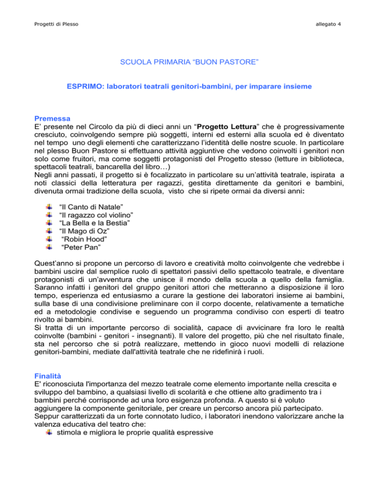Progetti di Plesso allegato 4 SCUOLA PRIMARIA “BUON PASTORE” ESPRIMO: laboratori teatrali genitori-bambini, per imparare insieme Premessa E’ presente nel Circolo da più di dieci anni un “Progetto Lettura” che è progressivamente cresciuto, coinvolgendo sempre più soggetti, interni ed esterni alla scuola ed è diventato nel tempo uno degli elementi che caratterizzano l’identità delle nostre scuole. In particolare nel plesso Buon Pastore si effettuano attività aggiuntive che vedono coinvolti i genitori non solo come fruitori, ma come soggetti protagonisti del Progetto stesso (letture in biblioteca, spettacoli teatrali, bancarella del libro…) Negli anni passati, il progetto si è focalizzato in particolare su un’attività teatrale, ispirata a noti classici della letteratura per ragazzi, gestita direttamente da genitori e bambini, divenuta ormai tradizione della scuola, visto che si ripete ormai da diversi anni: “Il Canto di Natale” “Il ragazzo col violino” “La Bella e la Bestia” “Il Mago di Oz” “Robin Hood” “Peter Pan” Quest’anno si propone un percorso di lavoro e creatività molto coinvolgente che vedrebbe i bambini uscire dal semplice ruolo di spettatori passivi dello spettacolo teatrale, e diventare protagonisti di un’avventura che unisce il mondo della scuola a quello della famiglia. Saranno infatti i genitori del gruppo genitori attori che metteranno a disposizione il loro tempo, esperienza ed entusiasmo a curare la gestione dei laboratori insieme ai bambini, sulla base di una condivisione preliminare con il corpo docente, relativamente a tematiche ed a metodologie condivise e seguendo un programma condiviso con esperti di teatro rivolto ai bambini. Si tratta di un importante percorso di socialità, capace di avvicinare fra loro le realtà coinvolte (bambini - genitori - insegnanti). Il valore del progetto, più che nel risultato finale, sta nel percorso che si potrà realizzare, mettendo in gioco nuovi modelli di relazione genitori-bambini, mediate dall'attività teatrale che ne ridefinirà i ruoli. Finalità E' riconosciuta l'importanza del mezzo teatrale come elemento importante nella crescita e sviluppo del bambino, a qualsiasi livello di scolarità e che ottiene alto gradimento tra i bambini perché corrisponde ad una loro esigenza profonda. A questo si è voluto aggiungere la componente genitoriale, per creare un percorso ancora più partecipato. Seppur caratterizzati da un forte connotato ludico, i laboratori inendono valorizzare anche la valenza educativa del teatro che: stimola e migliora le proprie qualità espressive Progetti di Plesso allegato 4 insegna l’importanza del corpo come mezzo per comunicare emozioni, sentimenti, bisogni ed al contempo stimola al controllo della propria fisicità e l'autocontrollo in generale. sviluppa la socialità, il confronto e insegna al rispetto dei tempi e delle scelte dell'altro, per un corretto coordinamento di parola e azione. sviluppa l'autostima accresce le capacità di osservazione, di adeguamento all’altro. è una palestra dove sperimentare ed esplorare emozioni, imparando a conoscerle e gestirle senza farsi sopraffare. Una libertà di espressione che dota i bambini di armi efficaci nella mediazione con le emozioni reali. è ricco di linguaggi: attività motorie, mimiche, gestuali, sonore, artistico/scenografiche stimola la creatività e spinge i bambini ad uscire dagli schemi preconfezionati di videogiochi e tv. In prima persona sperimentano le molteplici possibilità di sviluppo di una situazione. Tante ricette possibili con gli stessi ingredienti di base. si approcciano in modo nuovo e coinvolgente le diverse materie scolastiche e si possono individuare temi da sviluppare in parallelo con i percorsi didattici delle diverse materie. lavoro sul libro/testo/sceneggiatura/personaggio Destinatari Il progetto è proposto alle classi parallele del terzo anno. Si tratta di tre classi di 25 bambini circa, per un totale di circa 75 bambini. La scelta delle classi parallele facilita il coinvolgimento delle insegnanti nello svolgimento di attività e proposte, in linea con quanto sperimentato nei laboratori. Sono coinvolti gli insegnanti delle classi terze, per poter contribuire a valorizzare ed estendere alle classi gli stimoli provenienti dal piccolo gruppo dei partecipanti al laboratorio. In questa fase si prevedono attività di costruzione dei personaggi, con la scrittura e ideazione delle loro storie e vite, l'osservazione delle gestualità nel mondo che li circonda (camminate, posture, movimenti), della voce, delle relazioni, analisi di testi. I bambini, i genitori e gli insegnanti di tutte le classi assisteranno alla rappresentazione dello spettacolo natalizio, mentre I laboratori saranno proposto alle quattro classi terze della scuola, che non sono coinvolte in altri progetti teatrali, per un totale di circa 100 bambini. Descrizione Si propone un percorso di lavoro e creatività molto coinvolgente che offre ai bambini l'occasione di uscire dal semplice ruolo di spettatori passivi dello spettacolo teatrale e diventare protagonisti di un’avventura che unisce il mondo della scuola a quello della famiglia. Sono infatti alcuni genitori del gruppo teatro che mettono a disposizione il loro tempo, esperienza ed entusiasmo per la gestione dei laboratori. Il programma di attività è redatto sulla base di un confronto preliminare con il corpo docente e condiviso con un esperto di teatro per bambini. Si tratta di un importante percorso di socialità, capace di avvicinare fra loro le realtà coinvolte: bambini - genitori - insegnanti. Progetti di Plesso allegato 4 Il valore del progetto sta nel percorso che si potrà realizzare, mettendo in gioco nuovi modelli di relazione genitori-bambini, mediate dall'attività teatrale che ne ridefinirà i ruoli. I laboratori avranno cadenza settimanale e si svolgeranno in orario extra scolastico, dalle 16.30 alle 18.30. Le attività proposte avranno un rim