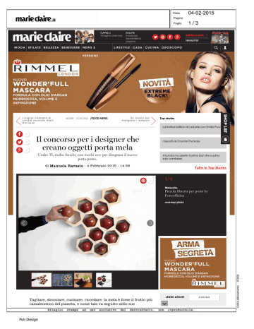 Data 04-02-2015 Pagina Foglio CAPELLI 10 tagli for men only MODA SFILATE BELLEZZA BENESSERE NEWS E SALUTE 5 modi per riaccendere la passione 1/3 abbonati NEWSLETTER LIFESTYLE CASA CUCINA OROSCOPO PERSONE HOME /CUCINA /FOOD NEWS Un anello per mangiare i lamponi Top stories La limited edition di Ladurée con Emilio Pucci 0 0 0 Il concorso per i designer che creano oggetti porta mela SHOP LIST I migliori ristoranti di Londra secondo Alain Ducasse I biscotti di Chantal Thomass Under 35, molto freschi, con tocchi eco: per disegnare il nuovo porta-pomo. A Londra ha aperto il primo bar che cucina solo cornflakes di Manuela Ravasio - 4 Febbraio 2015 - 14:58 Tutte le Top Stories 0 1/4 Melacolta Piccola libreria per pomi by Foroofficina LEGGI ANCHE Tagliare, sbucciare, cucinare, ricordare: la mela è forse il frutto più camaleontico del pianeta, e come tale va seguito nelle sue Poli Design CUCINA Codice abbonamento: 072651 courtesy photo Data 04-02-2015 Pagina Foglio evoluzioni. A pensarci sono, e saranno, designer under 35, quelli chiamati dal consorzio La Trentina per l'edizione 2015 del contest Adesigneraday, progetto che vuole mettere al centro l'ideazione di strumenti che supportino l'uso delle mele (la bocca da sola non vale, quella ci hanno già pensato nel film Il Tempo delle Mele, appunto). In collaborazione con DesignHub e consorzio Poli.Design del Politecnico di Milano, il progetto in passato ha visto nascere librerie porta mele, alberi con cavità porta-pomi, app per imparare a piantarsele da sole (le mele, ovviamente) e drink con varianti ben lontane dal semplice sidro. Fino al 15 marzo il bando è aperto ai designer del frutto: i progetti vincitori saranno comunicati durante il Fuorisalone del Mobile e poi esposti al Mart di Rovereto, museo da sempre vicino al concetto food+design. scritto da Manuela Ravasio 2/3 Borse e scarpe blu per la Primavera Estate 2015 Come indossare i jeans per andare a lavoro in ufficio Provocante Mònica Acqua essenziale Tendenza: Gonna a tubino + maglione in HOME / CUCINA / FOOD NEWS tag mele , food design , design Powered by Aggiungi un commento... Commenta Plug-in sociale di Facebook MarieClaire.it Mi piace MarieClaire.it piace a 94.468 persone. Plug-in sociale di Facebook Guarda Anche I lecca lecca a forma delle posizioni del kamasutra Un artista scioglie ogni dubbio…e zucchero: e realizza le figure cult della bibbia del sesso. Versione gommosa. SPONSOR 1 2 3 Patita per le scarpe? Marieclaire ha selezionato i modelli più cool di questa stagione, trova quello giusto per te! RICETTE Poli Design Codice abbonamento: 072651 Make up I love You! Scopri i tutorial, i consigli, le review, i prodotti e gli stratagemmi per un trucco sempre perfetto Data 04-02-2015 Pagina Foglio 3/3 RICETTE Radicchio&eros Hot-cooking: la cucina diventa i... RICETTE La ricetta dei macaron al cioccolato & prugne Un boccone francese ispirato dal... RICETTE Dolcissime prugne Dalla California il frutto che i... RICETTE La ricetta dei cookies prugne e caramello I biscotti interpretati dal food... GALASSIA MARIE CLAIRE Approfitta subito delle esclusive offerte di abbonamento con sconti fino al 65% MODA SFILATE BELLEZZA BENESSERE NEWS E PERSONE LIFESTYLE Shooting Sfilate Primavera estate News e appuntamenti Salute Gossip News e Borse 2015 Profumi News e appuntamenti News e appuntamenti appuntamenti News e appuntamenti Haute Couture Capelli Dieta e alimentazione Interviste Viaggi Sfilate AI 2014/2015 2014/2015 Make up Cinema e libri Coolmix Tendenze Milano Fashion Week Viso e corpo I nostri blog Hi-tech Scarpe Parigi Fashion Week Hair advisor MarieClaire @work Sport e fitness Poli Design 072651 Scegli l'edizione digitale della tua rivista preferita su tablet e pc. Codice abbonamento: Scegli l'edizione digitale della tua rivista preferita su smartphone.