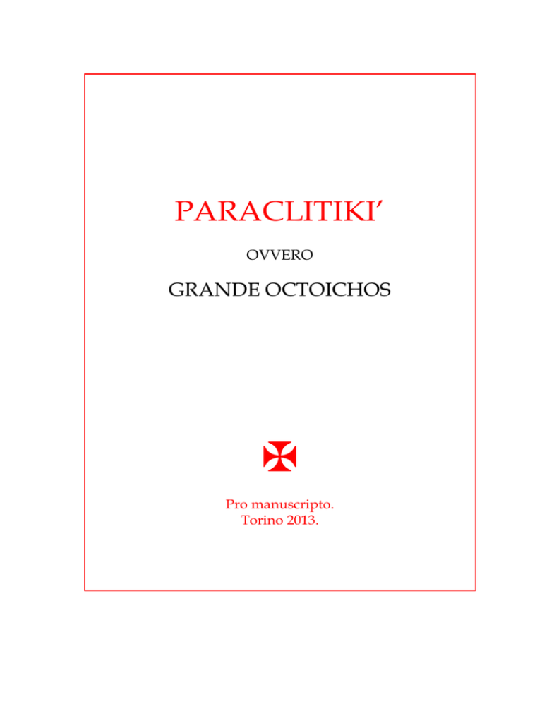 PARACLITIKI’ OVVERO GRANDE OCTOICHOS Pro manuscripto. Torino 2013. 2 DOMENICA DEL TONO PLAGALE 1 SABATO SERA AL GRANDE VESPRO. Stichirà anastàsima dell’Oktòico. Tono pl. 1. C on la tua croce preziosa, o Cristo, svergognasti il diavolo e con la tua risurrezione spuntasti il pungiglione del peccato e ci salvasti dalle porte della morte. Unigenito, noi ti glorifichiamo. Tu che dai la risurrezione al genere umano, come pecora fosti condotto al macello: di fronte a questo inorridirono i principi dell’ade e furono sollevate le porte del dolore, perché è entrato Cristo, Re della gloria, per dire ai prigionieri: Uscite e a quanti erano nella tenebra: Mostratevi. Grande prodigio! Il Creatore degli esseri invisibili, dopo aver patito nella carne per amore dell’uomo, risorse immortale! Venite, adoriamolo, famiglie delle genti, perché, strappati all’errore dalla sua compassione, abbiamo imparato a cantare il Dio uno in tre ipòstasi. Altri Stichirà, anatolikà. O ffriamo l’adorazione vespertina a te, luce senza tramonto, che alla fine dei secoli, mediante la carne, come in uno specchio, rifulgesti al mondo, discendesti all’ade, ne hai dileguasti la tenebra e mostrasti alle genti la luce della risurrezione. Signore datore di luce, gloria a te. Glorifichiamo l’autore della nostra salvezza, Cristo: con la sua risurrezione dai morti il mondo è salvato dall’inganno, gioisce il coro degli angeli, fugge la seduzione dei demòni, Adamo caduto è risollevato, il diavolo annientato. 3 Le guardie ricevettero le istruzioni dagli iniqui: Nascondete la risurrezione del Cristo, prendete il denaro e dite: Mentre dormivamo, il morto fu rapito dal sepolcro. Chi mai vide, chi mai udì che un morto venga rubato? E un morto unto di mirra e nudo, che lascia nella tomba le sue bende funerarie? Non ingannatevi, giudei, imparate le parole dei profeti e sappiate che egli è veramente il Redentore del mondo e l’onnipotente. Signore, che spogliasti l’ade e calpestasti la morte, Salvatore nostro, che illuminasti il mondo con la tua croce preziosa, abbi pietà di noi. Gloria. E ora. Theotokìon. N el Mar Rosso fu tracciata un tempo l’immagine della sposa ignara di nozze. Là, Mosè che divide le acque, qui Gabriele, ministro del prodigio: allora Israele attraversò l’abisso a piedi asciutti, ora la Vergine genera Cristo senza seme; il mare, dopo il passaggio d’Israele, rimase senza strada, l’irreprensibile, dopo il concepimento dell’Emmanuele, rimase incorrotta. O Dio che sei, che preesistevi e che sei apparso come uomo, abbi pietà di noi. Allo stico, apòstica stichirà. Anastàsimo. Tono pl. 1. C on voci di canto ti magnifichiamo, Cristo Salvatore, incarnato senza lasciare i cieli: perché per la nostra stirpe accettasti croce e morte, quale Signore amico degli uomini; spogliate le porte dell’ade risorgesti il terzo giorno, per salvare le anime nostre. Gli alfabetici. Dal tuo fianco trafitto, o datore di vita, hai fatto scaturire per tutti torrenti di perdono, vita e salvezza; nel4 la carne accettasti la morte, donandoci l’immortalità; abitando in una tomba, ci liberasti risuscitandoci con te gloriosamente, in quanto Dio. Noi dunque acclamiamo: Signore amico degli uomini, gloria a te. Straordinaria è la tua crocifissione e la tua discesa all’ade, amico degli uomini! Spogliato l’ade e gloriosamente risuscitati con te i prigionieri di un tempo, in quanto Dio, apristi il paradiso e li rendesti degni di ottenerlo; anche a noi, che glorifichiamo la tua risurrezione il terzo giorno, dona dunque il perdono dei peccati e rendici cittadini del paradiso, o solo misericortdioso. Tu che per noi accettasti nella carne la passione e il terzo giorno dai morti risorgesti, guarisci le passioni della nostra carne, facci risorgere dalle nostre gravi colpe, o amico degli uomini e salvaci. Gloria. E ora. Theotokìon. S ei tempio e porta, reggia e trono del Re, Vergine venerabilissima: per te Cristo Signore, Redentore, sole di giustizia, apparve a quanti dormivano nella tenebra, volendo illuminare quelli che di propria mano aveva plasmato a sua immagine. Tu dunque, o degna di ogni canto, che hai con lui famigliarità di madre, senza sosta prega per la salvezza delle anime nostre. Tono pl. 1. Apolytìkion. C antiamo, fedeli e adoriamo il Verbo coeterno al Padre e allo Spirito, partorito dalla Vergine a nostra salvezza: perché nella carne volle salire sulla croce, sottoporsi alla morte e risuscitare i morti con la sua risurrezione gloriosa. 5 Theotokíon. S alve, invalicabile porta del Signore, salve, muro e protezione di quanti a te accorrono, salve, porto senza tempeste e ignara di nozze: tu che partoristi nella carne il tuo Creatore e Dio, non cessare di pregare per quanti celebrano e adorano tuo Figlio. AL MESONITTICO Canone trinitario. Tono pl. 1. Acrostico: Quinto alla luce trisolare. Poema di Mitrofane. Ode 1. Cavallo e cavaliere. C elebrando la potenza dell’unica e trisolare natura, supplichiamo: illumina la nostra mente, o Dio onnipotente e sollèvala, o Signore, alla tua gloria inesplicabile. In alto le schiere intellettuali degli angeli senza sosta t’inneggiano con l’inno trisagio, Monade triplice, Triade di pari natura, sovrasostanziale, onnipotente. Concedi all’anima mia il nettare dolcissimo e luminoso della tua carità, Triade Monade fonte di luce e anche la divina compunzione che mi purifichi, o misericordioso Sovrano di tutto il creato. Theotokìon. Come sul vello la rugiada divina discese tacita dal cielo, o Vergine, nel tuo grembo e salvò tutta la natura inaridita degli uomini, o Purissima. Ode 3. Tu che col tuo comando. T u concepisti e stabilisti le sostanze spirituali che inneggiano incessantemente la tua Divinità, o Dio trilucente e onnipotente; ma accogli anche la preghiera 6 e la supplica dei nati dal fango della terra poiché sei misericordioso. O tu per natura esente da ogni mutazione, a noi mutevoli che cantiamo l’inscrutabile sorgente della tua bontà, conced