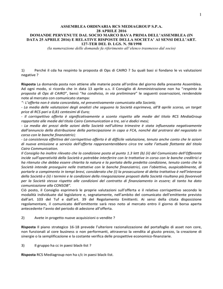 1 ASSEMBLEA ORDINARIA RCS MEDIAGROUP S.P.A. 28 APRILE 2016 DOMANDE PERVENUTE DAL SOCIO MARCO BAVA PRIMA DELL’ASSEMBLEA (IN DATA 25 APRILE 2016) E RELATIVE RISPOSTE DELLA SOCIETA’ AI SENSI DELL’ART. 127-TER DEL D. LGS. N. 58/1998 (la numerazione delle domande fa riferimento all’elenco trasmesso dal socio) 1) Perché il cda ha respinto la proposta di Ops di CAIRO ? Su quali basi si fondano le vs valutazioni negative ? Risposta La domanda posta non attiene alle materie poste all’ordine del giorno della presente Assemblea. Ad ogni modo, si ricorda che in data 13 aprile u.s. il Consiglio di Amministrazione non ha “respinto la proposta di Ops di CAIRO”, bensì “ha condiviso, in via preliminare” le seguenti osservazioni, rendendole note al mercato con comunicato stampa: “- L’offerta non è stata concordata, né preventivamente comunicata alla Società; - La media delle valutazioni degli analisti che seguono la Società esprimeva, all’8 aprile scorso, un target price di RCS pari a 0,81 centesimi di Euro; - Il corrispettivo offerto è significativamente a sconto rispetto alle medie del titolo RCS MediaGroup rapportate alle medie del titolo Cairo Communication a tre, sei e dodici mesi; - La media dei prezzi delle azioni della Società nell’ultimo trimestre è stata influenzata negativamente dall’annuncio della distribuzione della partecipazione in capo a FCA, nonché dal protrarsi del negoziato in corso con le banche finanziatrici; - La consistenza effettiva del corrispettivo offerto è di difficile valutazione, tenuto anche conto che le azioni di nuova emissione a servizio dell’offerta rappresenterebbero circa tre volte l’attuale flottante del titolo Cairo Communication. Il Consiglio ha inoltre rilevato che la condizione posta al punto 1.3 lett (b) (ii) del Comunicato dell’Offerente incide sull’operatività della Società e potrebbe interferire con le trattative in corso con le banche creditrici e ha ritenuto che debba essere chiarita la natura e la portata della predetta condizione, tenuto conto che la Società intende proseguire nelle trattative con le banche finanziatrici, con l’obiettivo, auspicabilmente, di portarle a compimento in tempi brevi, considerato che (i) la prosecuzione di detta trattativa è nell’interesse della Società e (ii) i termini e le condizioni della rinegoziazione proposti dalla Società risultano più favorevoli per la Società stessa rispetto alle condizioni del contratto di finanziamento in essere; di tanto ha dato comunicazione alla CONSOB”. Ciò posto, il Consiglio esprimerà le proprie valutazioni sull’offerta e il relativo corrispettivo secondo le modalità individuate dal legislatore e, segnatamente, nell’ambito del comunicato dell’emittente previsto dall’art. 103 del Tuf e dall’art. 39 del Regolamento Emittenti. Ai sensi della citata disposizione regolamentare, il comunicato dell’emittente sarà reso noto al mercato entro il giorno di borsa aperta antecedente l’avvio del periodo di adesione all’offerta. 2) Avete in progetto nuove acquisizioni o vendite ? Risposta Il piano strategico 16-18 prevede l’ulteriore razionalizzazione del portafoglio di asset non core, non funzionali al core business o non performanti, attraverso la vendita al giusto prezzo, la creazione di sinergie o la semplificazione e la costante verifica delle prospettive economico-finanziarie. 3) Il gruppo ha cc in paesi black-list ? Risposta RCS Mediagroup non ha c/c in paesi black-list. 2 Si segnala che il Gruppo RCS controlla: 1) RCS Sports and Events DMCC in Dubai, società che organizza eventi sportivi nei paesi dell’area del Golfo e 2) Hotelyo in Svizzera che gestisce e-commerce nell’area viaggi on-line. Tali società controllate dispongono di conti correnti nei rispettivi paesi per la usuale operatività. 4) Avete intenzione di trasferire la sede legale in Olanda e quella fiscale in GB ?se lo avete fatto come pensate di comportarvi con l’uscita della GB dall’EU ? Risposta No. 5) Avete intenzione di proporre le modifiche statutarie che raddoppiano il voto ? Risposta No. 6) Avete call center all’estero ? se si dove, con quanti lavoratori, di chi e’ la proprietà? Risposta Il gruppo non si avvale di manodopera all’estero per gestire servizi di call center. 7) Siete iscritti a Confindustria ? se si quanto costa ? avete intenzione di uscirne ? Risposta Siamo iscritti a Assolombarda , il costo è pari a 104 mila euro ed è calcolato in base al numero dei dipendenti. 8) Come e’ variato l’indebitamento e per cosa ? Risposta Questa informazione è disponibile nel paragrafo “Andamento del Gruppo al 31 dicembre 2015” del Fascicolo di Bilancio a stampa e alla pag. 210, nota n. 42 del Bilancio Consolidato. 9) A quanto ammontano gli incentivi incassati come gruppo suddivisi per tipologia ed entità ? Risposta Complessivamente le agevolazioni per l’Editoria sono risultate pari a circa 0,6 milioni e si riferiscono principalmente ad agevolazioni di tariffe telefoniche e, in parte, ad agevolazioni correlate ad investimenti. 10) Da chi e’ composto l’odv con nome cognome e quanto ci costa ? Risposta L’Organismo di Vigilanza è attualmente composto dal prof. Silvano Corbella, membro esterno alla Società, che lo presiede, dalla dr.ssa Gabriella Chersicla (Sindaco effettivo) e dal Dott. Dario Frigerio (Amministratore). E’ previsto un compenso per il prof. Corbella di euro 15.000 annui, e 8000 Euro per gli altri membri 11) Quanto costa la sponsorizzazione il Meeting di Rimini di Cl ed EXPO 2015 o altre? quanto ? Per cosa e per Risposta RCS non ha attivato sponsorizzazioni per il meeting di Rimini di CL Quanto a EXPO 2015, nello specifico la manifestazione non è costata nulla a RCS come sponsorizzazione anzi l’aggiudicazione pubblica come “soggetto concessionario per lo sviluppo e diffusione delle informazioni relative al tema e all’evento Expo” ha permesso a RCS di costruire un progetto di comunicazione per il bran