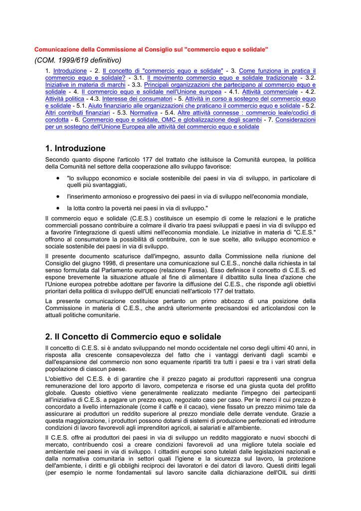 Comunicazione della Commissione al Consiglio sul "commercio equo e solidale" (COM. 1999/619 definitivo) 1. Introduzione - 2. Il concetto di "commercio equo e solidale" - 3. Come funziona in pratica il commercio equo e solidale? - 3.1. Il movimento commercio equo e solidale tradizionale - 3.2. Iniziative in materia di marchi - 3.3. Principali organizzazioni che partecipano al commercio equo e solidale - 4. Il commercio equo e solidale nell'Unione europea - 4.1. Attività commerciale - 4.2. Attività politica - 4.3. Interesse dei consumatori - 5. Attività in corso a sostegno del commercio equo e solidale - 5.1. Aiuto finanziario alle organizzazioni che praticano il commercio equo e solidale - 5.2. Altri contributi finanziari - 5.3. Normativa - 5.4. Altre attività connesse : commercio leale/codici di condotta - 6. Commercio equo e solidale, OMC e globalizzazione degli scambi - 7. Considerazioni per un sostegno dell'Unione Europea alle attività del commercio equo e solidale 1. Introduzione Secondo quanto dispone l'articolo 177 del trattato che istituisce la Comunità europea, la politica della Comunità nel settore della cooperazione allo sviluppo favorisce: • "lo sviluppo economico e sociale sostenibile dei paesi in via di sviluppo, in particolare di quelli più svantaggiati, • l'inserimento armonioso e progressivo dei paesi in via di sviluppo nell'economia mondiale, • la lotta contro la povertà nei paesi in via di sviluppo." Il commercio equo e solidale (C.E.S.) costituisce un esempio di come le relazioni e le pratiche commerciali possano contribuire a colmare il divario tra paesi sviluppati e paesi in via di sviluppo ed a favorire l'integrazione di questi ultimi nell'economia mondiale. Le iniziative in materia di "C.E.S." offrono al consumatore la possibilità di contribuire, con le sue scelte, allo sviluppo economico e sociale sostenibile dei paesi in via di sviluppo. Il presente documento scaturisce dall'impegno, assunto dalla Commissione nella riunione del Consiglio del giugno 1998, di presentare una comunicazione sul C.E.S., nonché dalla richiesta in tal senso formulata dal Parlamento europeo (relazione Fassa). Esso definisce il concetto di C.E.S. ed espone brevemente la situazione attuale al fine di alimentare il dibattito sulla linea d'azione che l'Unione europea potrebbe adottare per favorire la diffusione del C.E.S., che risponde agli obiettivi prioritari della politica di sviluppo dell'UE enunciati nell'articolo 177 del trattato. La presente comunicazione costituisce pertanto un primo abbozzo di una posizione della Commissione in materia di C.E.S., che andrà ulteriormente precisandosi ed articolandosi con le attuali politiche comunitarie. 2. Il Concetto di Commercio equo e solidale Il concetto di C.E.S. si è andato sviluppando nel mondo occidentale nel corso degli ultimi 40 anni, in risposta alla crescente consapevolezza del fatto che i vantaggi derivanti dagli scambi e dall'espansione del commercio non sono equamente ripartiti tra tutti i paesi e tra i vari strati della popolazione di ciascun paese. L'obiettivo del C.E.S. è di garantire che il prezzo pagato ai produttori rappresenti una congrua remunerazione del loro apporto di lavoro, competenza e risorse ed una giusta quota del profitto globale. Questo obiettivo viene generalmente realizzato mediante l'impegno dei partecipanti all'iniziativa di C.E.S. a pagare un prezzo equo, negoziato caso per caso. Per le merci il cui prezzo è concordato a livello internazionale (come il caffè e il cacao), viene fissato un prezzo minimo tale da assicurare ai produttori un reddito superiore al prezzo mondiale delle derrate vendute. Grazie a questa maggiorazione, i produttori possono dotarsi di sistemi di produzione perfezionati ed introdurre condizioni di lavoro favorevoli agli imprenditori agricoli, ai salariati e all'ambiente. Il C.E.S. offre ai produttori dei paesi in via di sviluppo un reddito maggiorato e nuovi sbocchi di mercato, contribuendo così a creare condizioni favorevoli ad una migliore tutela sociale ed ambientale nei paesi in via di sviluppo. I cittadini europei sono tutelati dalle legislazioni nazionali e dalla normativa comunitaria in settori quali l'igiene e la sicurezza sul lavoro, la protezione dell'ambiente, i diritti e gli obblighi reciproci dei lavoratori e dei datori di lavoro. Questi diritti legali (per esempio le norme fondamentali sul lavoro sancite dalla dichiarazione dell'OIL sui diritti fondamentali dei lavoratori del 18 giugno 1998) non sempre sono garantiti dall'ordinamento nazionale dei paesi in via di sviluppo ed anche se lo sono, le condizioni economiche o altre circostanze rendono spesso difficile il rispetto della legge. Il C.E.S. tenta di appianare queste difficoltà promuovendo uno sviluppo economico equilibrato ed una crescita sostenibile a partire dalla base. Esso aspira inoltre a ridurre, almeno in parte, il divario tra paesi industrializzati e in via di sviluppo, approfonditosi negli ultimi decenni in conseguenza della diminuzione relativa dei prezzi delle materie prime e in particolare delle derrate agricole. La pratica del C.E.S. favorisce particolarmente i piccoli produttori, soprattutto agricoltori e artigiani, i quali spesso vivono in regioni rurali periferiche e non producono in quantità sufficiente per esportare direttamente, cosicché dipendono da intermediari sia per la vendita dei prodotti che per l'assunzione di credito. Alcuni di essi hanno cercato di ridurre tale dipendenza associandosi in cooperative e mettendo in comune risorse, attrezzature e competenze tecniche e talvolta anche servizi collettivi come la sanità e l'istruzione. Le organizzazioni commerciali alternative - di cui si farà menzione più avanti - possono dare una spinta decisiva allo sviluppo di queste cooperative, con il pagamento di un prezzo equo e con la prestazione di assistenza di vario tipo, dall'acquisto di un fax alla consulenza in materia di esportazioni. Tra le iniziative di questo genere pos