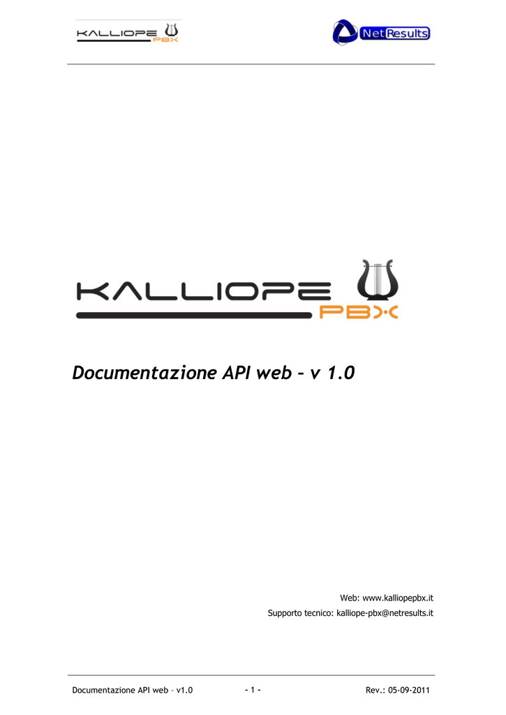 Documentazione API web – v 1.0 Web: www.kalliopepbx.it Supporto tecnico: [email protected] Documentazione API web – v1.0 -1- Rev.: 05-09-2011 NetResults S.r.l. Via Giuntini, 63 – 56023 - Navacchio di Cascina (PI) Tel. +39 050 754730 Web: http://www.netresults.it – E-mail: [email protected] Documentazione API web – v1.0 -2- Rev.: 05-09-2011 Changelog Versione 1.0 – Release KalliopePBX 3.7.4 Con il firmware 3.7.4 è stato aggiunto il supporto ad HTTPS (su porta standard 443) per accedere all’API, mediante l’utilizzo di un certificato self-signed da una Autorità di Certificazione interna. La versione dell’API rimane 1.0 in quanto non sono state effettuate modifiche all’interfaccia. Documentazione API web – v1.0 -3- Rev.: 05-09-2011 Introduzione A partire dalla release firmware 3.7.3, sono disponibili API web per l’integrazione di alcune funzioni telefoniche offerte da KalliopePBX in software di terze parti. Questo documento illustra le API introdotte, specificandone modalità di invocazione e relativo effetto/risposta. Attualmente sono disponibili API dedicate alla consultazione del registro chiamate (CDR) ed al servizio click-to-dial, invocate mediante metodi http GET/POST. Ad ogni richiesta corrisponde una eventuale azione da parte di KalliopePBX ed una risposta contenente i dati richiesti e/o l’esito della richiesta. La risposta viene fornita in formato JSON, uno standard orientato alla rappresentazione in formato human-readable di strutture dati generiche. L’API è accessibile al seguente URL1: http://<IP_KalliopePBX>/api/?<arg1>=<val1>[&<arg2>=<val2>[&…]] Gli argomenti che vengono passati all’API includono il comando richiesto, le eventuali credenziali di autenticazione, e gli eventuali parametri dello specifico comando. Nel seguito vengono descritti in dettaglio il formato di invocazione dei singoli comandi ed i relativi messaggi di risposta che costituiscono la versione corrente dell’API. 1 Con la release firmware 3.7.4 è possibile accedere all’API anche mediante HTTPS. Documentazione API web – v1.0 -4- Rev.: 05-09-2011 Descrizione API L’indicazione del comando richiesto è effettuata utilizzando l’argomento “command”, che può assumere uno dei seguenti valori: version c2c cdr Ad esclusione del comando “version”, che non richiede autenticazione, gli altri richiedono che vengano passate all’API le credenziali di autenticazione e controllo di autorizzazione. Le credenziali di autenticazione sono passate utilizzando i due parametri “user” e “password”: http://<IP_KalliopePBX>/api/?command=<comando>& user=<username>&password=<md5pwd>&... Le credenziali utilizzate per le API sono le stesse utilizzate per il pannello WEB utente. In aggiunta agli username degli utenti abilitati, per alcuni comandi sono validi anche gli utenti “admin” (l’amministratore del PBX) e “cdradmin” (l’utente abilitato alla visualizzazione non oscurata del CDR). Le password non vengono fornite in clear-text ma tramite il relativo hash md5. Ogni invocazione dell’API genera, oltre all’eventuale azione, una risposta in formato JSON. Tutte le risposte hanno il medesimo formato: { "banner": "KalliopePBX web API", "api_version": "1.0", "command": <comando>, "exit_code": <exit_code>, "exit_msg": <exit_message>, "data": [] } dove: “banner” è una stringa prefissata che identifica KalliopePBX come originatore della risposta; “api_version” è una stringa che contiene la versione dell’API che ha originato la risposta; Documentazione API web – v1.0 -5- Rev.: 05-09-2011 “command” è una stringa che riporta il comando invocato; “exit_code” è un codice numerico che, mediante il valore assunto, identifica l’esito dell’invocazione del comando, secondo quanto specificato nel seguito; “exit_msg” è una stringa contenente una descrizione sommaria dell’esito del comando. “data” è un array contente l’eventuale informazione richiesta a KalliopePBX (es. il registro chiamate) I valori dell’exit_code dipendono dal particolare comando richiesto. Sono presenti alcuni codici comuni a tutti i comandi, raccolti nella tabella seguente insieme ai corrispondenti messaggi, ma ciascun comando estende tale set con codici specifici (questi sono elencati nella descrizione di ciascun messaggio). exit_code exit_msg 0 Success 1 Internal Error 2 Missing or unknown command 3 Authentication error 4 Missing or wrong argument Documentazione API web – v1.0 descrizione Comando completato con successo Errore interno all’API Comando mancante, non specificato o sconosciuto Errore di autenticazione (username e/o password errati o vuoti) Uno o più parametri necessari al comando specificato sono mancanti o di tipo errato -6- Rev.: 05-09-2011 Comandi Di seguito si riportano i comandi disponibili e le relative modalità di invocazione (parametri), insieme alla descrizione dell’effetto del comando e della risposta attesa. Per quei comandi che prevedono messaggi di errore addizionali rispetto a quelli base, ne vengono riportati codici e descrizione. La tabella seguente raccoglie tutti i comandi disponibili, specificando per ciascuno di essi le versioni di API in cui è stato introdotto ed in cui ne è stato modificato. Comando Versione API introduzione Versione API ultima modifica c2c 1.0 (fw 3.7.3) 1.0 (fw 3.7.3) cdr 1.0 (fw 3.7.3) 1.0 (fw 3.7.3) version 1.0 (fw 3.7.3) 1.0 (fw 3.7.3) - c2c Implementa la funzione click-to-call (o click-to-dial). All’invocazione, il KalliopePBX farà squillare il telefono dell’utente, e quando questi risponde (con timeout 10 secondi) verrà generata la chiamata verso il numero richiesto. Il comando richiede autenticazione con credenziali associate ad un interno (gli username “admin” e “cdradmin” non sono utenti validi). Il comando supporta i seguenti parametri (M: Mandatory, O: Optional): Parametro M/O number M Descrizione Numero telefonico che deve essere chiamato, eventualmente comprensivo di prefisso inte