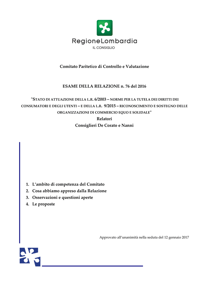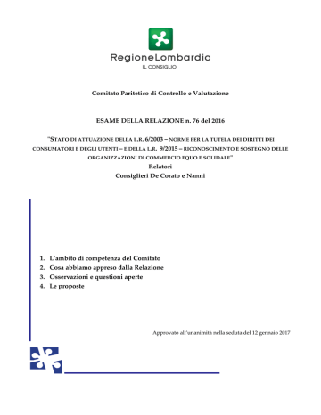 Comitato Paritetico di Controllo e Valutazione ESAME DELLA RELAZIONE n. 76 del 2016 "STATO DI ATTUAZIONE DELLA L.R. 6/2003 – NORME PER LA TUTELA DEI DIRITTI DEI CONSUMATORI E DEGLI UTENTI – E DELLA L.R. 9/2015 – RICONOSCIMENTO E SOSTEGNO DELLE ORGANIZZAZIONI DI COMMERCIO EQUO E SOLIDALE" Relatori Consiglieri De Corato e Nanni 1. L’ambito di competenza del Comitato 2. Cosa abbiamo appreso dalla Relazione 3. Osservazioni e questioni aperte 4. Le proposte Approvato all’unanimità nella seduta del 12 gennaio 2017 1. L’ambito di competenza del Comitato Il Comitato Paritetico di Controllo e Valutazione, organismo politico non partisan che esercita il controllo dell’attuazione delle leggi e la valutazione degli effetti delle politiche, ha anche il compito di esaminare le relazioni con le quali la Giunta regionale o altri soggetti rispondono ad obblighi informativi nei confronti del Consiglio previsti da leggi regionali (art. 109, comma 1, lett. c) Reg.). Inoltre, l’esame di queste relazioni, secondo la previsione regolamentare, è specifico oggetto di iniziative di collaborazione con le commissioni consiliari e la Giunta regionale (art. 109, comma 2, lett. a) Reg.). Nella seduta del 12 gennaio 2017 il Comitato ha preso in esame la Relazione n. 76 che, nel luglio 2016, la Giunta regionale ha inviato al Consiglio per rispondere al mandato informativo contenuto in due leggi regionali: • la l.r. 6/2003 - Norme per la tutela dei diritti dei consumatori e degli utenti - all’art. 4, comma 3 dispone che annualmente la Giunta trasmetta al Consiglio regionale una relazione sull’attività svolta; • la l.r. 9/2015 – Riconoscimento e sostegno delle organizzazioni di commercio equo e solidale all’art.12 (clausola valutativa) attribuisce mandato alla Giunta regionale affinché, con cadenza biennale, informi il Consiglio su attuazione e risultati degli interventi promossi. Questo documento riporta l’esito dell’esame condotto dal Comitato Paritetico. 2. Cosa abbiamo appreso dalla Relazione In sintesi, dai contenuti della relazione emergono le informazioni indicate di seguito per ciascuna delle leggi di riferimento. 1. TUTELA DEI DIRITTI DEI CONSUMATORI E DEGLI UTENTI a. La Giunta regionale nell’aprile del 2015 approva il Programma delle iniziative di tutela dei consumatori e utenti per il biennio 2015-2016 (DGR n. 3446), La norma di rendicontazione della l.r. 6/2003 (art. 4, comma 3) 3. … La Giunta regionale presenta al Consiglio regionale una relazione annuale sull’attività svolta e ne cura la più ampia diffusione. stanziando 200.000 euro per finanziare progetti presentati dalle Associazioni dei consumatori riconosciute nell’Elenco regionale previsto all’art. 3 della l.r. 6/2003. b. A seguito della definizione di modalità di presentazione e criteri di valutazione dei progetti (D.d.s n. 3512, del maggio 2015), vengono finanziate 4 iniziative che coinvolgono 15 associazioni di consumatori (contributo regionale complessivo pari a 199.750 euro). c. I progetti, avviati nel secondo semestre 2015 (conclusione prevista nel mese di ottobre 2016), si sviluppano in tre aree prioritarie: (i) sostegno alle fasce deboli della popolazione, (ii) tutele nel settore dei servizi pubblici, (iii) tutele in ambito commerciale. 2 2. RICONOSCIMENTO E SOSTEGNO DELLE ORGANIZZAZIONI DI COMMERCIO EQUO E SOLIDALE a. La Consulta commercio regionale equo e del solidale, istituita nell’ottobre 2015, è presieduta dall’Assessore allo Sviluppo Economico composta delle da e rappresentanti organizzazioni di commercio equo e solidale, dall’Assessore al Reddito di cittadinanza sociale e e inclusione dall’Assessore all’Agricoltura; b. La Consulta tra il 2015 e il 2016, si riunisce in due occasioni (ottobre 2015 e aprile 2016) per impostare il programma delle iniziative; La clausola valutativa della l.r. 9/2015 (art. 12) 1. Il Consiglio regionale controlla l'attuazione della presente legge e valuta i risultati conseguiti dagli interventi realizzati. A tal fine la Giunta regionale presenta al Consiglio una relazione biennale che documenta e descrive: a) la composizione qualitativa e quantitativa delle organizzazioni del commercio equo e solidale in possesso dei requisiti di cui al comma 1 dell'articolo 6, le sue principali variazioni e l'identificazione delle organizzazioni che operano stabilmente sul territorio regionale; b) le caratteristiche, i costi e gli esiti delle iniziative regionali di promozione del commercio equo e solidale e della 'Giornata regionale del commercio equo e solidale'; c) la tipologia e l'entità degli incentivi e contributi regionali erogati ai sensi dell'articolo 6, i criteri di assegnazione, i soggetti beneficiari e i risultati ottenuti; d) le eventuali criticità emerse nel corso dell'attuazione della presente legge, comprese quelle evidenziate dai soggetti interessati. ….. c. La Giunta regionale nel dicembre del 2015 approva il Programma delle iniziative per il commercio equo e solidale per il biennio 2015-2016 (DGR n. 4536), stanziando 200.000 euro per finanziare progetti per il commercio equo e solidale (150.000 euro) e iniziative trasversali, tra cui la giornata regionale dedicata al commercio equo e solidale (50.000); d. Il Bando a favore del commercio equo e solidale, pubblicato nel marzo 2016 e aperto dal 18 aprile al 19 maggio, prevede il finanziamento di progetti presentati da organizzazioni di commercio equo e solidale della Lombardia aggregate in partenariato (composto da almeno tre soggetti); e. Ogni progetto deve coinvolgere un minimo di tre territori provinciali e svilupparsi su una delle quattro linee di intervento previste dal Bando: (i) formazione per gli operatori delle organizzazioni, (ii) iniziative culturali, di sensibilizzazione e educazione al consumo, (iii) attività di valorizzazione dei prodotti e per il rafforzamento dei canali di vendita, (iv) organizzazione e partecipazione a fiere dedicate al commercio equo e solidale; f. I progetti pre