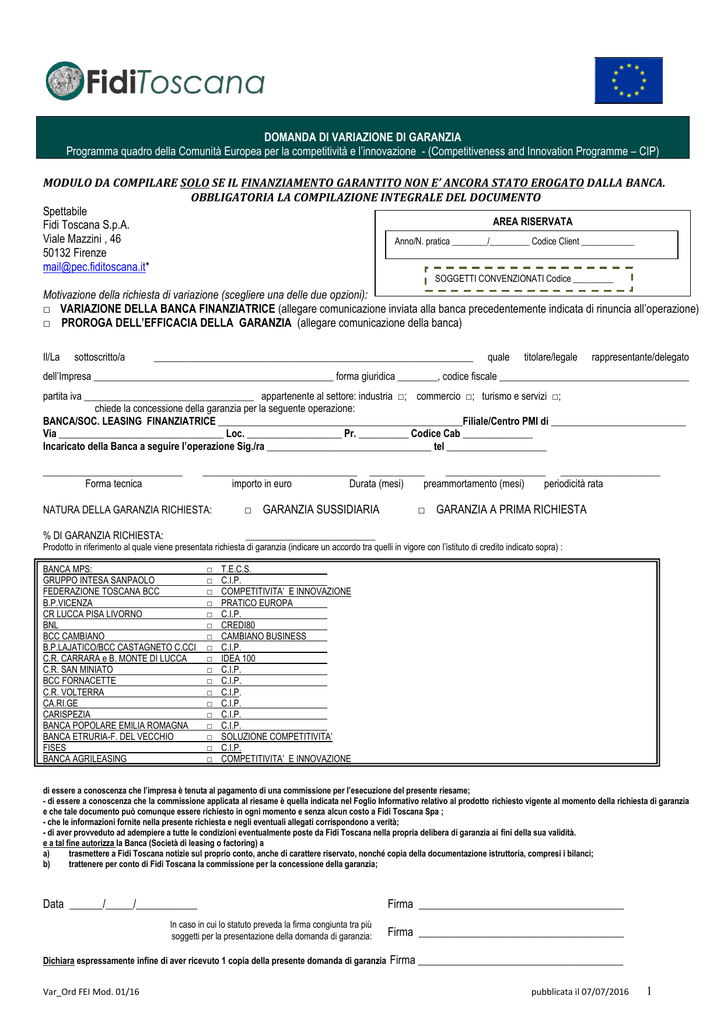DOMANDA DI VARIAZIONE DI GARANZIA Programma quadro della Comunità Europea per la competitività e l’innovazione - (Competitiveness and Innovation Programme – CIP) MODULO DA COMPILARE SOLO SE IL FINANZIAMENTO GARANTITO NON E’ ANCORA STATO EROGATO DALLA BANCA. OBBLIGATORIA LA COMPILAZIONE INTEGRALE DEL DOCUMENTO Spettabile AREA RISERVATA Fidi Toscana S.p.A. Viale Mazzini , 46 Anno/N. pratica ________/_________ Codice Client ____________ 50132 Firenze [email protected]* SOGGETTI CONVENZIONATI Codice _________ Motivazione della richiesta di variazione (scegliere una delle due opzioni): □ VARIAZIONE DELLA BANCA FINANZIATRICE (allegare comunicazione inviata alla banca precedentemente indicata di rinuncia all’operazione) □ PROROGA DELL’EFFICACIA DELLA GARANZIA (allegare comunicazione della banca) Il/La sottoscritto/a ________________________________________________________________ quale titolare/legale rappresentante/delegato dell’Impresa ________________________________________________ forma giuridica ________, codice fiscale ______________________________________ partita iva __________________________________ appartenente al settore: industria □; commercio □; turismo e servizi □; chiede la concessione della garanzia per la seguente operazione: BANCA/SOC. LEASING FINANZIATRICE _________________________________________________Filiale/Centro PMI di ___________________________ Via _________________________________ Loc. ___________________ Pr. __________ Codice Cab ______________ Incaricato della Banca a seguire l’operazione Sig./ra _________________________________ tel ____________________ ____________________________ Forma tecnica _______________________________ ___________ ____________________ ____________________ importo in euro Durata (mesi) preammortamento (mesi) periodicità rata NATURA DELLA GARANZIA RICHIESTA: □ GARANZIA SUSSIDIARIA % DI GARANZIA RICHIESTA: __________________________ □ GARANZIA A PRIMA RICHIESTA Prodotto in riferimento al quale viene presentata richiesta di garanzia (indicare un accordo tra quelli in vigore con l’istituto di credito indicato sopra) : BANCA MPS: GRUPPO INTESA SANPAOLO FEDERAZIONE TOSCANA BCC B.P.VICENZA CR LUCCA PISA LIVORNO BNL BCC CAMBIANO B.P.LAJATICO/BCC CASTAGNETO C.CCI C.R. CARRARA e B. MONTE DI LUCCA C.R. SAN MINIATO BCC FORNACETTE C.R. VOLTERRA CA.RI.GE CARISPEZIA BANCA POPOLARE EMILIA ROMAGNA BANCA ETRURIA-F. DEL VECCHIO FISES BANCA AGRILEASING □ □ □ □ □ □ □ □ □ □ □ □ □ □ □ □ □ □ T.E.C.S. C.I.P. COMPETITIVITA’ E INNOVAZIONE PRATICO EUROPA C.I.P. CREDI80 CAMBIANO BUSINESS C.I.P. IDEA 100 C.I.P. C.I.P. C.I.P. C.I.P. C.I.P. C.I.P. SOLUZIONE COMPETITIVITA’ C.I.P. COMPETITIVITA’ E INNOVAZIONE di essere a conoscenza che l’impresa è tenuta al pagamento di una commissione per l’esecuzione del presente riesame; - di essere a conoscenza che la commissione applicata al riesame è quella indicata nel Foglio Informativo relativo al prodotto richiesto vigente al momento della richiesta di garanzia e che tale documento può comunque essere richiesto in ogni momento e senza alcun costo a Fidi Toscana Spa ; - che le informazioni fornite nella presente richiesta e negli eventuali allegati corrispondono a verità; - di aver provveduto ad adempiere a tutte le condizioni eventualmente poste da Fidi Toscana nella propria delibera di garanzia ai fini della sua validità. e a tal fine autorizza la Banca (Società di leasing o factoring) a a) trasmettere a Fidi Toscana notizie sul proprio conto, anche di carattere riservato, nonché copia della documentazione istruttoria, compresi i bilanci; b) trattenere per conto di Fidi Toscana la commissione per la concessione della garanzia; Data ______/_____/___________ In caso in cui lo statuto preveda la firma congiunta tra più soggetti per la presentazione della domanda di garanzia: Dichiara espressamente infine di aver ricevuto 1 copia della presente domanda di garanzia Var_Ord FEI Mod. 01/16 Firma _____________________________________ Firma _____________________________________ Firma _____________________________________ pubblicata il 07/07/2016 1 * l’invio tramite pec ha lo stesso valore di una raccomandata AR; tale trasmissione è tuttavia sostitutiva dell’invio del documento firmato in originale solamente se il documento trasmesso tramite PEC è stato anche firmato digitalmente. Dichiarazione sostitutiva dell’atto di notorietà ai sensi dell’art. 47 D.P.R. 445/00, consapevole delle sanzioni penali previste dall’art. 76 del detto D.P.R. per le ipotesi di falsità in atti e dichiarazioni mendaci A - DATI DEL TITOLARE/LEGALE RAPPRESENTANTE/DELEGATO: Il/La sottoscritto/a _____________________________________________________________________ M□ F□ _______________________________________ Provincia _______ Nazione ___________________ il ___________ via/piazza_______________________ nel Comune di ____________________ Provincia_______ Nazione ___________________ ____________________________________nella sua qualità di (barrare una casella): legale rappresentante □ titolare □ in carica dal _____________________ nato a residente in codice fiscale B – DATI DEL SECONDO FIRMATARIO (DA COMPILARE SOLO IN CASO DI FIRMA CONGIUNTA): Il/La sottoscritto/a _____________________________________________________________________ M□ F□ _______________________________________ Provincia _______ Nazione ___________________ il ___________ via/piazza_______________________ nel Comune di ____________________ Provincia_______ Nazione ___________________ ____________________________________nella sua qualità di (barrare una casella): legale rappresentante □ in carica dal _____________________ nato a residente in codice fiscale C – DATI DELL’IMPRESA RICHIEDENTE: Impresa ________________________________________________ forma giuridica ________, codice fiscale ______________________________________ partita iva __________________________________ con sede l