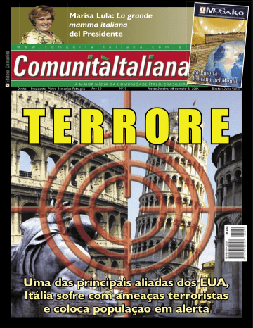 Marisa Lula: La grande mamma italiana del Presidente Diretor - Presidente: Pietro Domenico Petraglia Ano 10 Nº79 Rio de Janeiro, 28 de maio de 2004 Diretor: Julio Vanni ISSN 1676-3220 R$ 4,50 TERRORE Uma das principais aliadas dos EUA, Itália sofre com ameaças terroristas e coloca população em alerta 2 Rio de Janeiro, 28MAI2004 | Nº 79 Rio de Janeiro, 28MAI2004 | Nº 79 OPINIÃO | Serviço ao Leitor NOTÍCIAS | Comunidade e d i t o r i a l COSE NOSTRE Pietro Petraglia Entretenimento com cultura e informação Cúmplices da violência A s estarrecedoras fotos das torturas praticadas por soldados e oficiais americanos em prisioneiros iraquianos deflagraram não somente a prática desse crime hediondo, utilizado desde sempre pela CIA como método de interrogatório, mas principalmente a queda da moral do ocidente. A humilhação que o governo Bush impôs aos iraquianos faz com que seus aliados se tornem mais uma vez cúmplices da hipocrisia da guerra contra a ditadura de Saddam Hussein e suas armas de destruição em massa. Todos sabem que os EUA apóiam governos autocráticos no mundo árabe interessados no ouro negro e foram responsáveis pela aniquilação de regimes democráticos em diversos países. O que foi feito até agora para reverter o quadro de desigualdade, exclusão e fundamentalismo daquele país? Bush é o mais evidente produto do avanço do individualismo na sociedade em que prevalece o poder do dinheiro. Faltam projetos políticos que não sejam aqueles comprometidos com o capital financeiro. A política atual é o reflexo da decadência. É cada vez mais raro encontrarmos pessoas envergonhadas, como no passado, de mentir, trair, corromper, ofender ou tratar o próximo injustamente. O que está cada vez mais evidente é a falta de responsabilidade moral. O ocidente precisa reencontrar a sua força em suas mais profundas tradições. Faltam líderes que encarnem os princípios do Estado e dos deveres públicos e privados. A Itália, que é grande responsável pelos fundamentos culturais do ocidente, nos deu Dante, Giotto, S. Francesco, Lorenzo o Magnífico, Santo Agostinho, São Tommaso, entre outras centenas ou milhares de personagens imbuídas de moral forte, com conhecimentos diversos das artes, de armas, de diplomacia, de negócios, de elegância... Este país, sempre dividido entre Império e Igreja, com seus retalhos de principados, repúblicas, monarquias, impérios, apresentava modelos de virtude do homem culto, com inúmeros conhecimentos. Desde Tibério, Troiano, Adriano e Marco Aurélio, que governaram e defenderam o Império Romano por séculos, ou como primeira nação capitalista (os bancos surgiram na Itália em 1100) este país sempre influenciou o ocidente. Muitas famílias italianas observam em suas casas o exemplo da cultura desse povo, que passou por sofrimentos e constrangimentos vários, obrigados a deixarem seus lares em busca de novos horizontes, até chegar a atual posição no cenário mundial. Esta mesma Itália deveria atuar neste delicado cenário internacional. Deveria fazer aflorar seus vultos para que os líderes mundiais se espelhassem e buscassem fazer deste um mundo menos perigoso. A Espanha retirou seus 1.218 militares, admitindo que não pode cumprir com aquela missão de paz e temendo novos ataques terroristas em seu território. Enquanto isso, o povo italiano chora com a perda de vidas no Iraque e sofre com o perigo iminente do ódio inimigo. Se isso acontece é porque um simples homem, o primeiro-ministro, tomou a decisão, contra a vontade da população, de ter um inimigo. Imaginem o que um líder eleito pela grande maioria do eleitorado, com uma riqueza pessoal superior a qualquer outro político atual, líder de um partido fiel a ele e não a uma ideologia e controlador da maior rede de comunicações poderia fazer se seguisse a História que está sob seus pés? Sem dúvida o premiê Silvio Berlusconi poderia marcar uma virada importante nos rumos da atual política de autodestruição deste planeta. Depende de sua cultura, de sua moral! 3 Julio Vanni . [email protected] FUNDADO EM MARÇO DE 1994 DIRETOR-PRESIDENTE / EDITOR: Pietro Domenico Petraglia (RJ23820JP) DIRETOR: Julio Cezar Vanni VICE-DIRETOR EXECUTIVO: Adroaldo Garani PUBLICAÇÃO MENSAL E PRODUÇÃO: Editora Comunità Ltda. TIRAGEM: 30.000 exemplares ESTA EDIÇÃO FOI CONCLUÍDA EM: 21/05/2004 às 17:30h DISTRIBUIÇÃO: Rio de Janeiro, Espírito Santo, Rio Grande do Sul, Santa Catarina, Bahia, Minas Gerais, Amazonas, São Paulo REDAÇÃO E ADMINISTRAÇÃO: Rua Visconde de Uruguai, 98 Centro – Niterói – RJ – Brasil CEP: 24030-070 Tel/Fax: (21) 2722-0181 / (21) 2620-6680 E-MAIL: [email protected] REDAÇÃO: Rubiana Peixoto e Davi Raposo REVISÃO / TRADUÇÃO Cristiana Cocco DIAGRAMAÇÃO E ARTE: Alberto Carvalho COLABORADORES: Franco Vicenzotti – Braz Maiolino – Lan – Giuseppe D’Angelo (in memoriam) – Pietro Polizzo – Giovanni Crisafulli – Venceslao Soligo – Marco Lucchesi – Luca Martucci – Domenico De Masi – Nanci Bernardi Minuscoli – Vittorio Medioli – Franco Urani – Francesco Alberoni – Rafaella de Antonellis – Giovanni Meo Zilio Guido Sonino - Fernanda Maranesi CORRESPONDENTES: Ana Paula Torres (Roma) Matteo Spini (Bergamo) Guilherme Aquino (Milão) Comunità Italiana está aberto às contribuições e pesquisas de estudiosos brasileiros, italianos e estrangeiros. Os artigos assinados são de inteira responsabilidade de seus autores, sendo assim, não refletem, necessariamente, as opiniões e conceitos da Revista. La rivista Comunità Italiana è aperto ai contributi e alle ricerche di studiosi ed esperti brasiliani, italiani e estranieri. Il collaboratori esprimono, nella massima libertà, personali opinioni che non riflettono necessariamente il pensiero della direzione. ISSN 1676-3220 Filiato all’Associazione Stampa Italiana in Brasile Bellelli será o próximo cônsul geral no Rio de Janeiro Nascido em Zagabria (Iugos