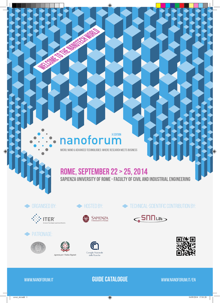 organised by: HOSTED BY: Technical-scientific contribution by: patronage: WWW.NANOFORUM.IT cover_ok.indd 1 GUIDE CATALOGUE WWW.NANOFORUM.IT/EN 16/09/2014 17.01.20 L’EVOLUZIONE L’EVOLUZIONE DELL’INNOVAZIONE DELL’INNOVAZIONE THE EVOLUTION OF INNOVATION The market is changing every day and the key of success is being always one step ahead. The The market market changing is changing every every day day and and thethe keykey of of success success being is being always always oneone step step Sinceis1989 we have been organising b2b events aboutis innovative topics ahead. ahead. Since Since 1989 1989 wewe have have been been organising organising b2b b2b events events about about innovative innovative topics topics such such as as such as electronic document management, front office, biotechnologies, nanotechnologies and 3D Printing. electronic electronic document document management, management, front front office, office, biotechnologies biotechnologies and and nanotechnologies. nanotechnologies. WeWe also also organize organize specialized specialized meetings, meetings, wewe publish publish professional professional magazines magazines and and develop develop We also organize specialized meetings, we publish professional magazines customised customised services services forfor public public bodies bodies and and private private corporations. corporations. and develop customised services for public bodies and private corporations. ITER: a point of reference for a world in evolution. Innovare: Innovare: Tecnologie, Tecnologie, Esperienze, Esperienze, Ricerche. Ricerche. www.iter.it/contatto www.iter.it/contatto www.iter.it/english/contact_us.htm www.iter.it/english/contact_us.htm ITER ITER S.r.l. S.r.l. - Via- Via Rovetta, Rovetta, 18 18 - 20127 - 20127 Milan Milan (MI)(MI) - ph. - ph. +39+39 02 02 2831161 2831161 - fax- fax +39+39 02 02 28311666 28311666 - www.iter.it - www.iter.it - [email protected] - [email protected] ITER S.r.l. - Via dei Valtorta 6 - 20127 Milano (MI) - tel. +39 02 2831161 - fax +39 02 28311666 - www.iter.it - [email protected] pubbli_iter.indd 1 10/09/2014 16.17.57 nanoforum thanks exhibitors & sponsors human technologies media partners nanoforum 2014 p 03 thanks.indd 1 16/09/2014 14.34.44 index 04 useful information 06 welcome by Domenico Piazza 08 honour committee 09 TECHNICAL SCIENTIFIC COMMITTEE 10 welcome info utili useful information Per poter apprezzare nel modo migliore il programma di nanoforum 2014 si suggerisce di partecipare ai tutorial, alle sessioni di conferenza di proprio interesse e di visitare l’expo. Infine, la preghiamo di riempire il modulo di valutazione: >> www.nanoforum.it In order to take all the best of nanoforum 2014 we suggest to participate to the conference sessions and to visit the Expo Area. Last but not least, fill in the evaluation form: >> www.nanoforum.it/en ORARI DI APERTURA TIME TABLE 22 23 24 25 22nd September: from 2.00 pm to 6.00 pm 23rd September: from 8.30 am to 6.00 pm 24th September: from 8.30 am to 6.00 pm 25th September: from 10.00 am to 1.00 pm settembre: settembre: settembre: settembre: 14.00 - 18.00 08.30 - 18.00 08.30 - 18.00 10.00 - 13.00 ISCRIZIONE SUBSCRIPTION Grazie al contributo di Partner, espositori e sponsor, la partecipazione a nanoforum è totalmente gratuita. È sufficiente compilare il modulo che si trova all’indirizzo www.nanoforum.it/iscrizione Thanks to the support of Institutions, Exhibitors and Sponsor, the participation in nanoforum is completely free, under subscription: www.nanoforum.it/registrationform COME ARRIVARE HOW TO REACH Nanoforum si tiene presso la Facoltà di Ingegneria civile e industriale - Sede di S. Pietro in Vincoli - dell’Università Sapienza di Roma, via Eudossiana 18, 00184 Roma. Nanoforum will take place at the Faculty of civil and industrial Engineering, St. Peter in Chains’ Campus at Sapienza University of Rome, Via Eudossiana 18, 00184 Rome, Italy AGGIORNAMENTI UPDATE by Sapienza University of Rome 12 meeting area, press, expo 13 exhibitors 26 conference plan 28 september 22 30 september 23 39 september 24 Le agende dei convegni, l’elenco delle azien- Conference plan, companies and institutions’ de / istituzioni coinvolte e tutte le iniziative list are available on the website connesse a nanoforum sono disponibili sul www.nanoforum.it/en sito www.nanoforum.it. ORGANIZZAZIONE STAFF Nanoforum è un progetto ideato e organizzato da ITER srl Via dei Valtorta, 6 - 20127 Milano tel. 02.2831.161 fax 02.2831.1666 All rights are reserved to: ITER S.r.l. Via dei Valtorta, 6 - 20127, Milano (MI) tel. +39 02.2831.161 fax +39 02.2831.1666 Numero unico, non destinato alla vendita. Distribuzione gratuita riservata ai Partecipanti a Nanoforum. Esente da documento accompagnatorio D.P.R. 627/78 art. 4. L’Organizzazione ha posto il massimo impegno per la realizzazione di questa guida riportando testi e immagini forniti dalle varie Organizzazioni ma non si assume alcuna responsabilità per eventuali errori od omissioni o per modifiche ai programmi. Unique number, not for sale. Free distribution reserved to Visitors of Nanoforum. Free from document D.P.R. 627/78 art. 4 The organisation has made great efforts to realize this guide but it doesn’t take the responsibility for any errors, omissions or changes on programmes. p 04 nanoforum 2014 indice.indd 1 18/09/2014 15.14.15 prograf.it CAMERE BIANCHE Ad ogni specifico problema di pulizia ambientale, Galvani risponde con soluzioni ad hoc, a misura del cliente. Galvani srl Via Monti Lessini, 8 - 37057 San Giovanni Lupatoto (VR) - Tel. +39 045 8774911 Fax +39 045 8774949 e-mail: [email protected] www.galvani.com galvani.indd 1 16/09/2014 14.37.57 benvenuto welcome Grazie a Lei, gentile Partecipante, per essere qui con Thank you, dear Participant, for being here with us and noi oggi e grazie al Comitato d’Onore che ha tracciato thanks to the Honour Committee that drew the guideli- le linee guida, al Comitato Tecnico-Scientifico 