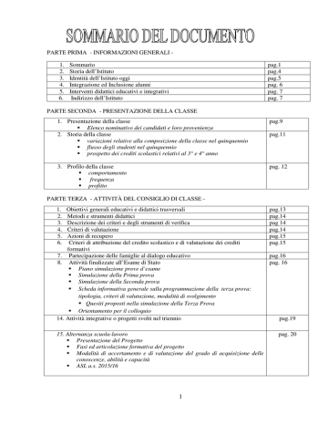 PARTE PRIMA - INFORMAZIONI GENERALI 1. 2. 3. 4. 5. 6. Sommario Storia dell’Istituto Identità dell’Istituto oggi Integrazione ed Inclusione alunni Interventi didattici educativi e integrativi Indirizzo dell’Istituto pag.1 pag.4 pag.5 pag. 6 pag. 7 pag. 7 PARTE SECONDA - PRESENTAZIONE DELLA CLASSE 1. Presentazione della classe Elenco nominativo dei candidati e loro provenienza 2. Storia della classe variazioni relative alla composizione della classe nel quinquennio flusso degli studenti nel quinquennio prospetto dei crediti scolastici relativi al 3° e 4° anno 3. Profilo della classe comportamento frequenza profitto pag.9 pag.11 pag. 12 PARTE TERZA - ATTIVITÀ DEL CONSIGLIO DI CLASSE 1. 2. 3. 4. 5. 6. Obiettivi generali educativi e didattici trasversali Metodi e strumenti didattici Descrizione dei criteri e degli strumenti di verifica Criteri di valutazione Azioni di recupero Criteri di attribuzione del credito scolastico e di valutazione dei crediti formativi 7. Partecipazione delle famiglie al dialogo educativo 8. Attività finalizzate all’Esame di Stato Piano simulazione prove d’esame Simulazione della Prima prova Simulazione della Seconda prova Scheda informativa generale sulla programmazione della terza prova: tipologia, criteri di valutazione, modalità di svolgimento Quesiti proposti nella simulazione della Terza Prova Orientamento per il colloquio 14. Attività integrative o progetti svolti nel triennio 15. Alternanza scuola-lavoro Presentazione del Progetto Fasi ed articolazione formativa del progetto Modalità di accertamento e di valutazione del grado di acquisizione delle conoscenze, abilità e capacità ASL a.s. 2015/16 1 pag.13 pag.14 pag 14 pag.14 pag.15 pag.15 pag.16 pag. 16 pag.19 pag. 20 ELENCO DEGLI ALLEGATI ALL.N° 1 2 DESCRIZIONE Schede informative analitiche relative alle discipline dell’ultimo anno di corso 1. ITALIANO 2. STORIA 3. MATEMATICA 4. INGLESE 5. VALORIZZAZIONE PRODUZIONI AGRICOLE E LEGISLAZIONE NAZIONALE E COMUNITARIE 6. ECONOMIA AGRARIA 7. ECONOMIA DEI MERCATI AGRICOLI 8. SOCIOLOGIA RURALE E STORIA DELL’AGRICOLTURA 9. AGRONOMIA TERRITORIALE E ECOSISTEMI FORESTALI 10. TECNICHE DI ALLEVAMENTO 11. EDUCAZIONE FISICA 12. RELIGIONE SIMULAZIONI PROVE D’ESAME SOMMINISTRATE IN CORSO D’ANNO 2.1 Testo simulazione prima prova scritta (solo in cartaceo) 2.1 Griglia di correzione e valutazione prima prova scritta 2.2 Testo simulazione seconda prova scritta 2.3 Griglia di correzione e valutazione seconda prova scritta 2.4 Testo simulazione terza prova scritta DOCUMENTI A DISPOSIZIONE DELLA COMMISSIONE • • • PIANO DELL’OFFERTA FORMATIVA RELAZIONI RELATIVE AGLI ALLIEVI CERTIFICATI PROGRAMMAZIONE DIDATTICO-EDUCATIVA DEL CONSIGLIO DI CLASSE 2 MATERIA DOCENTE Italiano Emanuela GRASSETTO Storia Emanuela GRASSETTO Inglese Eddi OSSO Matematica Beatrice PAVAN Educazione fisica Paola GUARISE Religione Beniamino CAODURO Valorizzazione attività produttive e legislazione nazionale e comunitaria Valorizzazione attività produttive e legislazione nazionale e comunitaria Agronomia territoriale ed ecosistemi forestali Agronomia territoriale ed ecosistemi forestali Economia agraria e dello sviluppo territoriale Economia dei mercati, marketing agroalimentare ed elementi di logistica Sociologia rurale e storia dell’agricoltura Claudia MAZZUCCATO Tecniche di allevamento Giacomo CORSO Tecniche di allevamento Gabriele BALDAN Sostegno Ester BRUN FRISANCHINA Sostegno Mario ZATTIN FIRMA Gabriele BALDAN Alberto BANZATO Gabriele BALDAN Alberto BANZATO Marianna BANDIERA Mario PAPINI Il Consiglio di Classe della 5aB dell’Istituto Professionale per l’Agricoltura e l’Ambiente “San Benedetto da Norcia” di Padova, nella seduta del 13 maggio 2016, formula e approva all'unanimità il presente Documento relativo all’azione educativa e didattica realizzata nell’ultimo anno di corso. Esso indica i contenuti, i metodi, gli spazi e i tempi del percorso formativo, i criteri, gli strumenti di valutazione adottati e gli obiettivi raggiunti per l’anno scolastico 2015 – 2016, nonché gli altri elementi ritenuti significativi dal Consiglio di Classe ai fini dello svolgimento degli esami. Come previsto dalla normativa per gli Istituti Professionali, il presente documento reca inoltre indicazioni sul profilo e sulle caratteristiche dell’attività svolta di Alternanza Scuola-Lavoro e sugli obiettivi raggiunti. IL DOCENTE COORDINATORE DI CLASSE (Prof.ssa Ester Brun Frisanchina) IL DIRIGENTE SCOLASTICO (Prof.ssa Anna Bottaro) 3 Parte prima STORIA DELL’ISTITUTO L’Istituto di Istruzione Professionale dei Servizi per l’Agricoltura e lo Sviluppo Rurale (già IPSAA – Istituto Professionale di Stato per l’Agricoltura e l’Ambiente) “San Benedetto da Norcia”di Padova, è stato istituito con DPR n°739 del 28.01.1953. Si tratta del primo Istituto italiano di questo genere riconosciuto e venne intitolato a San Benedetto da Norcia in omaggio al grande santo fondatore dell’ordine monastico che, prima di ogni altro, ebbe meriti nella bonifica e nella coltivazione della terra. In origine l’Istituto nacque con corsi biennali per formare delle maestranze qualificate nei settori tradizionali della realtà agricola limitrofa e della provincia. Dai primi anni ’70 al Biennio iniziale (Qualifica di Esperto Floricoltore e Giardiniere, Meccanico Operatore Agricolo, Esperto Agricolo, Esperto in Avicoltura e Avifauna) si è aggiunto il triennio finale di Agrotecnico (diploma di maturità), frequentato da quasi tutti i qualificati. L’introduzione del triennio per il completamento degli studi fino al diploma di maturità (Legge 27 ottobre 1969 n°754) ha permesso di qualificare ulteriormente tecnici e operatori chiamati a operare in contesti aziendali ed extra-aziendali sempre più complessi e competitivi per i progressi delle tecnologie e per l’introduzione delle politiche comunitarie. Il conseguimento del diploma di maturità professionale, inoltre, consentiva l’iscri