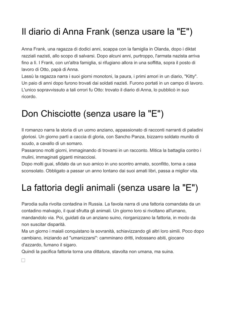 Il diario di Anna Frank (senza usare la "E") Anna Frank, una ragazza di dodici anni, scappa con la famiglia in Olanda, dopo i diktat razziali nazisti, allo scopo di salvarsi. Dopo alcuni anni, purtroppo, l'armata nazista arriva fino a lì. I Frank, con un'altra famiglia, si rifugiano allora in una soffitta, sopra il posto di lavoro di Otto, papà di Anna. Lassù la ragazza narra i suoi giorni monotoni, la paura, i primi amori in un diario, "Kitty". Un paio di anni dopo furono trovati dai soldati nazisti. Furono portati in un campo di lavoro. L'unico sopravvissuto a tali orrori fu Otto: trovato il diario di Anna, lo pubblicò in suo ricordo. Don Chisciotte (senza usare la "E") Il romanzo narra la storia di un uomo anziano, appassionato di racconti narranti di paladini gloriosi. Un giorno partì a caccia di gloria, con Sancho Panza, bizzarro soldato munito di scudo, a cavallo di un somaro. Passarono molti giorni, immaginando di trovarsi in un racconto. Mitica la battaglia contro i mulini, immaginati giganti minacciosi. Dopo molti guai, sfidato da un suo amico in uno scontro armato, sconfitto, torna a casa sconsolato. Obbligato a passar un anno lontano dai suoi amati libri, passa a miglior vita. La fattoria degli animali (senza usare la "E") Parodia sulla rivolta contadina in Russia. La favola narra di una fattoria comandata da un contadino malvagio, il qual sfrutta gli animali. Un giorno loro si rivoltano all'umano, mandandolo via. Poi, guidati da un anziano suino, riorganizzano la fattoria, in modo da non suscitar disparità. Ma un giorno i maiali conquistano la sovranità, schiavizzando gli altri loro simili. Poco dopo cambiano, iniziando ad "umanizzarsi": camminano dritti, indossano abiti, giocano d'azzardo, fumano il sigaro. Quindi la pacifica fattoria torna una dittatura, stavolta non umana, ma suina. "Harry Potter e la pietra filosofale" (senza usare la "E") Harry, il più famoso mago di tutto il mondo, ha trascorso quasi tutta la sua vita lottando contro "Tu sai chi", il mago oscuro, l'assassino di tutta la sua famiglia. Vissuto dai suoi zii fino ad undici anni, un giorno li abbandona, andando con Hagrid, il guardiacaccia, ad Hogwarts, la scuola di maghi. Qui incontra Ron, un simpatico ragazzo dalla chioma rossa. In sua compagnia incontra anche una colta, astuta ragazza. Con loro Harry affronta tanti guai, ma va avanti con coraggio... "Storia di una ladra di libri" (senza usare la "E") Sono orfana, non conosco i libri, non scrivo. Il mondo ingiusto mi colpì: solitudini, divisioni, troppo odio contro l'umanità. Io, L.M., sono stata adottata da una famiglia altruista. Ospitando Max, ragazzo braccato dai nazisti, ho trovato uno strano amico. Il bullismo causato dalla mia ignoranza mi toccò, ma il papà mi aiutò. Ora conosco vocali, consonanti, frasi, libri. Purtroppo mamma, papà, tutti gli amici sono morti: i nazisti hanno sganciato una bomba. Ma contro gli orrori di un conflitto, i libri mi hanno salvata. Novecento (senza usare la "E") La storia narra di Danny Boodman, un bambino trovato da un fuochista, abbandonato in una cassa di limoni, sopra un piano, sul piroscafo "Virginian". L'uomo cura il bimbo, gli fa da papà. Dopo alcuni anni il fuochista passa a miglior vita, purtroppo. Da adulto Danny fa il pianista sul piroscafo, da cui non sbarca mai, non trova il coraggio: il suo mondo sta solo sul Virginian. Qui incontra un altro musicista, Tim. Così inizia un'amicizia accompagnata da fantastici brani musicali. L'uomo, non lasciando mai il piroscafo, proprio a causa di una sua paura di un mondo tanto lontano dal suo, salta in aria con lui, quando il Virgnian, ormai malandato, sarà distrutto. Il nome della rosa (senza usare la lettera "E") 1327, un monaco va in un'abbazia, chiamato a causa di strani omicidi. Indaga su molti morti, tutti con la lingua scura. Il monaco trova un indizio associato ad un manoscritto, custodito laggiù, tra molti altri antichi volumi classici. Qui trova quindi l'assassino, un anziano monaco. Lui ha bagnato con una sostanza tossica i bordi di un libro sul riso (guai a chi rida! Dà scandalo!). Quando lo scoprono, lui ingoia alcuni fogli intossicati. Prima di suicidarsi appicca un fuoco, bruciando l'abbazia, purtroppo con tutti i libri. Il nome della rosa (senza usare la "E") Inizi 1300: a causa di un ritrovo di inquisitori, un arguto monaco va in un'abbazia italiana, trovandoci molti uomini assassinati. Lui individua quasi subito la causa di tali crimini: chi sfoglia un antico manoscritto sulla gioia, passa a miglior vita. Tal manoscritto, custodito in una stanza con molti libri, ha i bordi bagnati con una sostanza tossica: bagnando con la saliva il dito ci si intossica, passando a miglior vita. L'assassino, un anziano monaco, quando fu "sgamato" (si scusi il vocabolo non antico!), ingoiò alcuni fogli. Prima di intossicarsi, appiccò un fuoco molto grosso, bruciando l'abbazia. Novecento (senza usare la "E") Il monologo di Baricco narra di Danny, nato sul piroscafo chiamato "Virginian". Lui, abbandonato dai suoi su un piano, sarà affascinato dal suono di tali tasti, iniziando a suonarli, mai lasciando il piroscafo. Gli anni passano, il Virginian, malandato, sarà fatto saltar in aria, ma Danny non lo abbandona, passando a miglior vita con lui, impaurito dalla vita al di fuori di un mondo fatto di musica, viaggi, amici occasionali. La fattoria degli animali (senza usare la "E") Satira sulla rivolta russa. Gli animali di una fattoria sono maltrattati, sfruttati, affamati. Si rivoltano, cacciando il contadino malvagio. Collaborando tra di loro, fanno invidia agli umani. Ma i maiali, soprattutto i capi, parodia di Stalin con Trotsky, si impongono in modo tirannico sugli altri animali, assomigliando agli umani. Stalin in forma suina si circonda di un branco di cani, con i quali prima scaccia, poi fa assassinare il suo antagonista. Quindi i maiali stringono un patto con gli umani, cambiando la scritta simbolo di tutti i loro sforzi di rivolta, da "Tutti gli