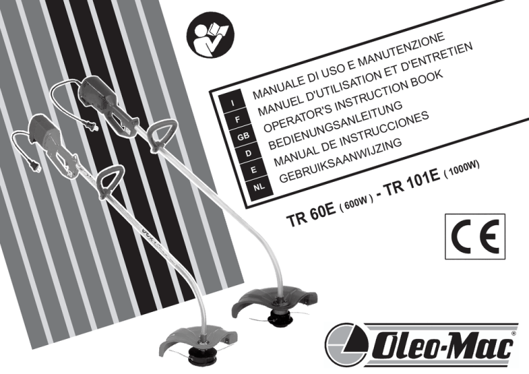 NE O I Z EN IEN T T E U TR N MAN E ' E SO ET D U I N OK D IO O E T B L A N IS UA L O I I N T T A M D'U RUC L T I E S U NG S IN ' U MAN R T I O E T ES L F A N N R A O CI GS OPE C N U U GB STR IEN N D I E E B NG I D Z L J D WI UA N N A A M W) KSA 0 I 0 E U 0 R (1 E GEB 1 0 NL E 0 6 TR W ( 600 1 R T )- I INTRODUZIONE Per un corretto impiego del decespugliatore e per evitare incidenti, non iniziate il lavoro senza aver letto questo manuale con la massima attenzione. Troverete su questo manuale le spiegazioni di funzionamento dei vari componenti e le istruzioni per i necessari controlli e per la manutenzione. N.B. Le descrizioni e le illustrazioni contenute nel presente manuale si intendono non rigorosamente impegnative. La Ditta si riserva il diritto di apportare eventuali modifiche senza impegnarsi ad aggiornare di volta in volta questo manuale. GB INTRODUCTION To correctly use the brush cutter and prevent accidents, do not start work without having first carefully read this manual. You will find explanations concerning the operation of the various parts plus instructions for necessary checks and relative maintenance. Note: Illustrations and specifications in this manual may vary according to Country requirements and are subject to change without notice by the manufacturer. F INTRODUCTION Pour un emploi correct de la débroussailleuse et pour éviter les accidents, ne pas commencer le travail sans avoir d'abord lu attentivement le manuel. Vous trouverez les descriptions du fonctionnement des divers composants et les instructions pour les contrôles nécessaires et pour l'entretien. N.B. Les descriptions et les illustrations contenues dans ce manuel n'engagent pas rigoureusement le constructeur. La société se réserve le droit d'apporter d'éventuelles modifications sans devoir mettre à jour à chaque fois le manuel. D ENLEITUNG Um richtig mit der Motorsense umgehen zu können und Unfälle zu vermeiden, lesen Sie diese Bröschure vor Aufnahme der Arbeit gründlich durch. Im Suchverzeichnis finden Sie die Angabe, auf welchen Seiten die Hinweise zur Arbeitsweise der unterschiedlichen Teile und Erklärungen zu den anfallenden Wartungs- und Kontrollarbeiten zu finden sind. N.B.: Die in dieser Bröschure enthaltenen Beschreibungen und Abbildungen verstehen sich unverbindlich. Der Hersteller behält sich das Recht vor, die Einzel - und Zubehörteile dieses Modells aus technischen oder absatz-bedingten Gründen zu ändern , ohne die Angaben dieser Bröschure jedesmal zu berichtigen. E F D TECHNISCHE ANGABEN TECHNICAL DATA E DATOS TECNICOS NL DONNEES TECHNIQUES TECHNISCHE GEGEVENS TR101E TR60E Motore elettrico monofase - Single-phase motor - Moteur eléctrique monophase - Motor einphasiger - Motor elétrico monofásico EMAK Tensione - Voltage - Tension - Spannung - Tensión Spanning 230V 230 V Intensità nominale - Current Input - Intensité nominale Leistungsaufnahme - Intensidad nominal - Nominale intensiteit 2.9 A 6.2 A Frequenza - Frequency - Fréquence - Frequenz Frecuencia - Frequentie 50 Hz 50 Hz Potenza - Power - Puissance - Leistung - Potencia Vermogen 600 W 1000 W Peso - Weight - Poids - Gewicht - Peso - Gewicht 3.4 Kg 4.5 Kg PRESSIONE ACUSTICA PRESSURE LEVEL PRESSION ACOUSTIQUE SCHALLDRUCK PRESIÓN ACUSTICA GELUIDSDRUCK LIVELLO POTENZA ACUSTICA GARANTITO GUARANTEED SOUND POWER LEVEL NIVEAU PUISSANCE ACOUSTIQUE ASSURÉ GARANTIERTER AKUSTISCHER SCHALLEISTUNGSPEGEL NIVEL POTENCIA ACÚSTICA GARANTIZADO GARANDEERD ACOUSTISCH VERMOGENSNIVEAU ZARUâENÁ HLADINA AKUSTICKÉHO V¯KONU LIVELLO DI VIBRAZIONE VIBRATION LEVEL NIVEAU DE VIBRATION VIBRATIONSPEGEL NIVEL DE VIBRACION DE TRILLINGSINTENSITEIT Lpa EN 786/A1 2000/14/EC LwA EN ISO 3744 - ISO 11094 EN 786/A1 TR60E 86 dB(A) 96 dB(A) 3.0/4.0 m/s2 TR101E 88 dB(A) 96 dB(A) 3.5/4.0 m/s2 MODELLO MODEL MODELE MODELE INLEIDING Lees eerst deze gebuiksaanwijzing grondig door alvorens met de bosmaaier te gaan werken. Dit teneinde de bosmaaier op juiste wijze te gebruiken en ongelukken te voorkomen. De inhoudsopgave laat zien waar u uitleg over de verschillende instructies omtrent de afzondelijke delen en noodzakelijke controles en onderhoudsvoorschriften kunt vinden. PS Illustratles en specificaties in deze gebruiksaanwijzing kunnen varlëren van land tot and en kunnen worden gewijzigd, zonder bericht van de fabrikant. 2 GB DATI TECNICI INTRODUCCION Para una correcta utilizaciòn de la desbrozadora y para evitar incidentes, no empiece a trabajar sin haber leido atentamente este manual. Ud. encontrarà las explicaciones de funcionamiento de los diferentes componentes y las instrucciones para el control y mantenimiento de la desbrozadora. P.D. Las descripciones contenidas en el presente manual no se consideran rigurosamente obligatorias. La empresa se reserva el derecho de aportar eventuales modificaciones sin obligarse a poner al dìa este manual. NL I COMPONENTI DEL DECESPUGLIATORE I 1 2 3 4 5 6 7 8 9 10 11 - GB 1 2 3 4 5 6 7 8 9 10 11 - Pulsante termico (1000 W) Impugnatura Tubo di trasmissione Testina di nylon Protezione testina Attacco cinghiaggio Interruttore di funzionamento Interruttore di sicurezza Spina di corrente Motore elettrico Lama tagliafilo BRUSH CUTTER COMPONENTS Thermal switch (1000 W) Handle Shaft arm Nylon head Head guard Harness attachment On/Off switch Safety switch Power plug Electric motor Blade F 1 2 3 4 5 6 7 8 9 10 11 - D 1 2 3 4 5 6 7 8 9 10 11 - COMPOSANTS DE LA DEBROUSSAILLEUSE Bouton thermique (1000 W) Poignée Tuyau de transmission Tête fil nylon Protection Attache pour courroie Interrupteur de fonctionnement Interrupteur de sécurité Prise de courant Moteur électrique Lame coupe-fil BAUTEILE DER MOTORSENSE Motorschutzschalter (1000 W) Griff Schaft Nylonfaden Schneidschutzvorrichtung Einhängevorrichtung für Einzeloder Schultergurt Ein/Ausschalter Sichereitsschalter Stecker Elektromotor Faden-Schneidklinge E 12345678910 11 NL 12345678910 11 - COMPONENTES DE LA DESBROZADORA Pulsante térmico (1000 W) Empuñadura Tubo de