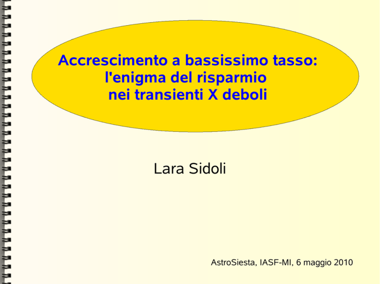Accrescimento a bassissimo tasso: l'enigma del risparmio nei transienti X deboli Lara Sidoli AstroSiesta, IASF-MI, 6 maggio 2010 Transienti X deboli (Very Faint X-ray Transients, VFXTs) Outburst luminosity ~ 1E34-1E36 erg/s 2-4 orders of magnitude fainter than “typical” X-ray binaries in outburst Transienti X deboli (Very Faint X-ray Transients, VFXTs) 1)- Lx implies NS or BH in binaries 2)- Low duty cycles together with low average accretion rates imply extremely low accretion rates: Mdot ~ 1E-13 solar masses/yr 3)- The nature of several VFXTs is unknown: probably a not homogeneous class of sources 4)- Duty cycle ? RXTE, ASCA, Chandra, XMM-Newton their catalogs contain faint or very faint X-ray transients located in the GC region (assumed distance ~ 8 kpc) with faint outbursts, the nature of which is still completely unknown N ~ 30 sources XMMU J174716.1-281048 Sidoli & Mereghetti 2003, Atel 147 2000 2003 Del Santo, Sidoli, Mereghetti et al. 2007 XMMU J174716.1-281048 Outburst Luminosity Lx ~ 5E34 erg/s XMMU J174716.1-281048 type I burst = IGRJ17464-2811 XMMU J174716.1-281048 XMMU J174716.1-281048 Del Santo, Sidoli, Mereghetti et al. 2007 XMMU J174716.1-281048: a “quasi-persistent” transient ? Del Santo, Sidoli, Mereghetti et al. 2007 XMMU J174716.1-281048: a “quasi-persistent” transient ? Type I X-ray burst XMMU J174716.1-281048: a “quasi-persistent” transient ? Type I X-ray burst XMMU J174716.1-281048: a “quasi-persistent” transient ? Type I X-ray burst XMMU J174716.1-281048: a “quasi-persistent” transient ? Type I X-ray burst The two observations in 2003 and in 2005 very likely caught the SAME outburst XMMU J174716.1-281048: a “quasi persistent” transient ! The first quasi-persistent Very Faint X-ray Transient ! BeppoSAX WFC image of the Galactic Center region (40 deg x 40 deg) 5.4 - 11.3 keV from http://www.asdc.asi.it/bepposax BeppoSAX WFC ??? “Burst-only sources” X-ray sources which displayed only type I X-ray bursts (no persistent emission was detected -> Lx < 1E36 erg/s) SAX J1753.5-2349 First persistent broad spectrum from a “burst-only” source INTEGRAL Key Programme data GC region Del Santo, Sidoli, et al. 2010 SAX J1753.5-2349 First persistent broad spectrum from a “burst-only” source XRT ISGRI Del Santo, Sidoli, et al. 2010 VFXTs display very peculiar behaviours: an example Degenaar & Wijnands 2009 VFXTs: high concentration in the Galactic Center region Degenaar & Wijnands 2009 VFXTs: not only bursters (1/3 VFXTs are bursters) !!! but also unidentified sources ... VFXTs: a few open issues ... low average accretion rates a) - wind-fed systems to get arbitrarily faint outbursts.. BUT 1)- optical observations of VFXTs exclude massive companions 2)- 1/3 VFXTs are bursters (LMXBs) (King 2000 King & Wijnands 2006) VFXTs: a few open issues ... low average accretion rates b) – Roche lobe overflow in a LMXB..? BUT 1)- the mass tranfer rate should drop to values < 1E-13 solar masses/yr within a Hubble time... some problems for the evolution of a typical LMXB (King 2000 King & Wijnands 2006) VFXTs: a few open issues ... low average accretion rates imply low current companion masses m2 m2 < 0.014 m1 ^ (-1/7) (hydrogen rich donor) or m2 < 0.0068 m1 ^(-1/7) (hydrogen poor) (King & Wijnands 2006) Possibilities: 1)- VFXTs are born with very low companions 2)- VFXTs evolve more rapidly than what previously thought 3)- True source duty cycles are larger 4)- Larger accretor masses: intermediate mass BHs? BUT 1/3 are bursters! They are not BH (King 2000 King & Wijnands 2006) Larger accretor masses (m1) ? intermediate mass BHs? (King & Wijnands 2006) Larger accretor masses (m1) ? intermediate mass BHs? (King & Wijnands 2006) GRAZIE !!!