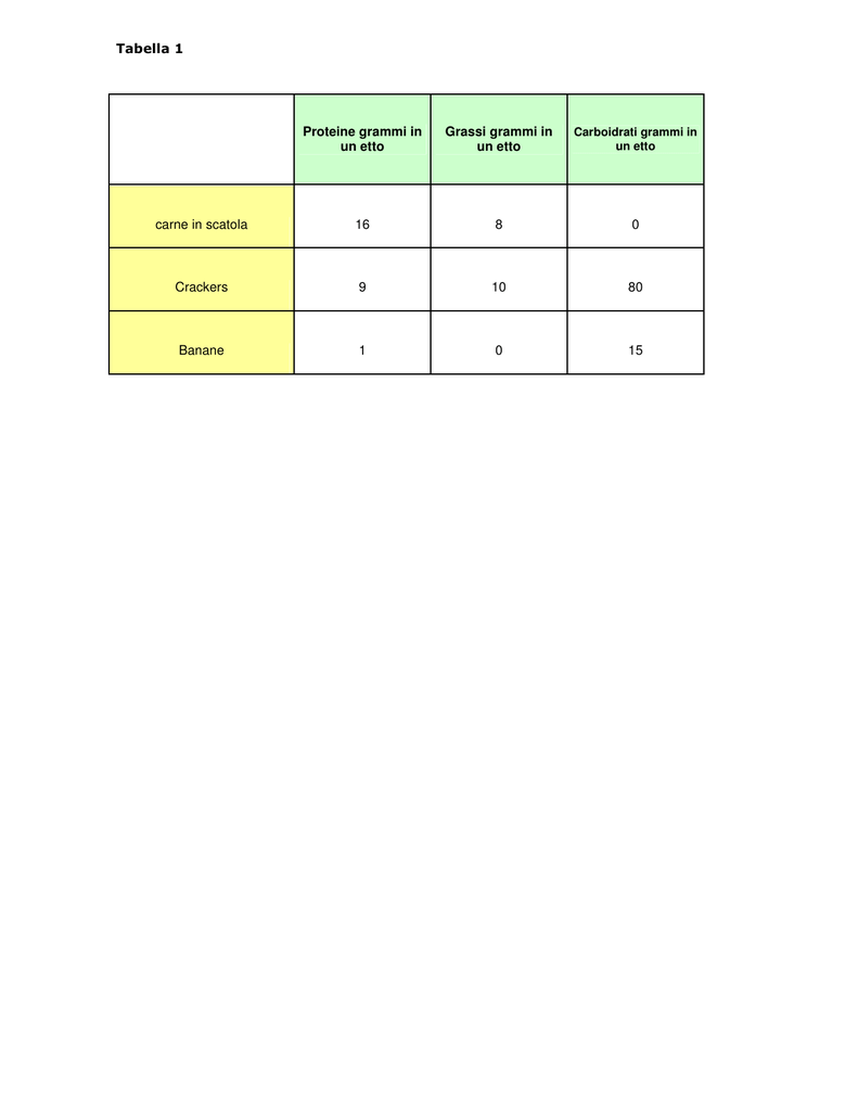 Tabella 1 Proteine grammi in un etto Grassi grammi in un etto Carboidrati grammi in un etto carne in scatola 16 8 0 Crackers 9 10 80 Banane 1 0 15
