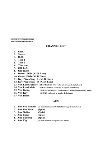 http://www.redmoonstar.it cell 338/4153775 Christian mail: [email protected] CHANNEL LIST 1. Kick 2. Snare 3. H.H. 4. Tom 1 5. Tom 2 6. Timpano 7. OH Left 8. OH Right 9. Basso POD (XLR Line) 10. Guitar POD (XLR Line) 11. Key/Piano/Seq L (XLR Line) 12. Key/Piano/Seq R (XLR Line) 13. Vox Lead Female (SENNHEISER e965 radio mic al seguito della band) 14. Vox Lead Male (SHURE Beta 58 radio mic al seguito della band) 15. Vox Guitar (NEUMAN KSM105 “condensatore” a filo al seguito della band) 16. Vox Key (SHURE radio mic al seguito della band) 17. Vox Basso AUX 1. 2. 3. 4. 5. 6. Aux Vox Female Aux Vox Male Aux Guitar Aux Basso Aux Batteria Aux Key (In-Ear Monitor SENNHEISER al seguito della band) (Spia) (Spia) (Spia) (Spia) (In-Ear Monitor al seguito della band)