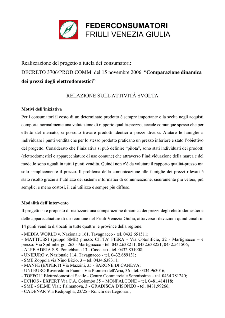 FEDERCONSUMATORI FRIULI VENEZIA GIULIA Realizzazione del progetto a tutela dei consumatori: DECRETO 3706/PROD.COMM. del 15 novembre 2006 “Comparazione dinamica dei prezzi degli elettrodomestici” RELAZIONE SULL'ATTIVITÁ SVOLTA Motivi dell’iniziativa Per i consumatori il costo di un determinato prodotto è sempre importante e la scelta negli acquisti comporta normalmente una valutazione di rapporto qualità-prezzo, accade comunque spesso che per effetto del mercato, si possono trovare prodotti identici a prezzi diversi. Aiutare le famiglie a individuare i punti vendita che per lo stesso prodotto praticano un prezzo inferiore e stato l’obiettivo del progetto. Considerato che l’iniziativa si può definire “pilota”, sono stati individuati dei prodotti (elettrodomestici e apparecchiature di uso comune) che attraverso l’individuazione della marca e del modello sono uguali in tutti i punti vendita. Quindi non c’è da valutare il rapporto qualità-prezzo ma solo semplicemente il prezzo. Il problema della comunicazione alle famiglie dei prezzi rilevati è stato risolto grazie all’utilizzo dei sistemi informatici di comunicazione, sicuramente più veloci, più semplici e meno costosi, il cui utilizzo è sempre più diffuso. Modalità dell’intervento Il progetto si è proposto di realizzare una comparazione dinamica dei prezzi degli elettrodomestici e delle apparecchiature di uso comune nel Friuli Venezia Giulia, attraverso rilevazioni quindicinali in 14 punti vendita dislocati in tutte quattro le province della regione: - MEDIA WORLD v. Nazionale 161, Tavagnacco - tel. 0432.651511; - MATTIUSSI (gruppo SME) presso: CITTA' FIERA - Via Cotonificio, 22 - Martignacco – e presso: Via Spilimbergo, 263 - Martignacco - tel. 0432.638211, 0432.638251, 0432.541506; - ALPE ADRIA S.S. Pontebbana 13 - Cassacco - tel. 0432.851908; - UNIEURO v. Nazionale 114, Tavagnacco - tel. 0432.689131; - SME Zoppola via Nino Bixio, 3 – tel. 0434.638311; - MANFÈ (EXPERT) Via Mazzini, 35 - SARONE DI CANEVA; - UNI EURO Roveredo in Piano - Via Pionieri dell'Aria, 36 - tel. 0434.963016; - TOFFOLI Elettrodomestici Sacile - Centro Commerciale Serenissima – tel. 0434.781240; - ECHOS - EXPERT Via C.A. Colombo 35 – MONFALCONE – tel. 0481.414118; - SME - SILME Viale Palmanova, 3 - GRADISCA D'ISONZO - tel. 0481.99266; - CADENAR Via Redipuglia, 23/25 - Ronchi dei Legionari; - MEDIA WORLD (MEDIA MARKET S.p.A.) Centro Commerciale TORRI d’EUROPA – Via d’Alviano 23 – TRIESTE – tel. 040.637448; - UNIEURO S.p.A. Strada Provinciale Farnei 40/a – MUGGIA (Trieste) – tel. 040.9235150 – 040.9236476; - EURONICS c/o CENTRO COMMERCIALE “Il Giulia” – Via Giulia 75/3 – tel. 040.578401; sulle seguenti 8 tipologie di elettrodomestici e apparecchiature e 34 diversi modelli: - Aspirapolvere - HOOVER TS2277; - MIELE S4211; - ROWENTA RVR01433IA; - Cellulari - ERICSSON P9901; - LG KG 810; - MOTOROLA Z3; - NOKIA N73; - SAMSUNGSSSGHX650LIG - Forno Microonde - AEG MCD 246; - INOX LG MH65848BL; - PANASONIC NNL564WBE; - SAMSUNG CE282DN; - WHIRLPOOL JT359 IX - Frigoriferi - ARISTON MTM1522V;;- BOSCH KDV24NOO; - REX RC2233PXX - Lavasiugatrici - ARISTON AML 129 EU; - BOSCH BSW VT1260 IT; - MIELE SOFT. T4463C - Lavastoviglie - AEG FAVORIT 50660; - ARISTON LL43S; - BOSCH SGS47M7211; - CANDYCDF325P; - MIELE G1230SCW - Lavatrici - ARISTON AVL 89; - BOSCH WOT20320; - CANDY GO 106; - MIELEW4166WPS; - REX R17000 - Televisori - LG 26LC2R; - PANASONIC TX26LE60; - PHILIPS 37PF9731D; - SAMSUNG LE27S71B; - SONY KDL26S2030E e la loro pubblicazione immediata con la relativa data di rilevazione sul nostro sito www.federconsumatori-fvg.it, dove i vari prezzi sono stati comparati tra loro per modello, evidenziando il prezzo più basso e il relativo punto vendita, attraverso un programma informatico realizzato appositamente. Le pagine dedicate del sito internet sono state identificate dal logo appositamente creato con la scritta Comparazione Prezzi Elettrodomestici. I rilevatori (8 persone) erano riconoscibili da un opportuno cartellino di identificazione con foto e si sono presentati e rapportati con il personale dei vari negozi per chiarimenti e informazioni, in tutti i casi c’è stata collaborazione. Complessivamente in 7 mesi sono state effettuate n. 5.236 rilevazioni. La pubblicità dell’iniziativa è stata effettuata attraverso tutti i mezzi di comunicazione generalista otre che attraverso internet, con apposito cartoncino informativo e attraverso il nostro periodico regionale “Cittadino Consumatore”. Le pagine del sito contenevano anche alcune avvertenze per indirizzare meglio il consumatore. Risultati dell’iniziativa: Senza voler enfatizzare eccessivamente il risultato, comunque possiamo dire che l’iniziativa è stato un successo, sia dal punto di vista dei riconoscimenti venuti da molte parti, anche fuori regione, sia dal numero di famiglie che si sono collegate alle pagine del sito per utilizzare le informazioni (diverse migliaia), e molte sono state le E-mail ricevute tutte con richieste di ulteriori informazioni o per complimentarsi. Oltre al servizio reso alla cittadinanza l’intervento è servito anche per valutare le dinamiche del mercato nel settore degli elettrodomestici: si sono confermate alcune supposizioni iniziali per le quali si è realizzato il progetto e cioè che per lo stesso tipo di prodotto nei vari negozi ci siano prezzi diversi, a volte trascurabili ma spesso di un certo peso economico e in qualche caso veramente esorbitanti; ma sono stati rilevati anche alcuni dati inattesi come ad esempio i prezzi che nello stesso negozio e per lo stesso modello a volte hanno avuto un andamento altalenante nel tempo, ossia sono calati in un periodo e successivamente aumentati, per poi discendere nuovamente. Il caso più eclatante riguarda il prezzo del televisore PHILIPS 37PF9731D che nel mese di febbraio 07 variava da un minimo di € 2.990.00 a un massimo di € 2.999.00, nel mese di luglio 07 invece 