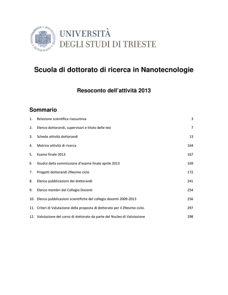 Scuola di dottorato di ricerca in Nanotecnologie Resoconto dell’attività 2013 Sommario 1. Relazione scientifica riassuntiva 3 2. Elenco dottorandi, supervisori e titolo delle tesi 7 3. Schede attività dottorandi 13 4. Matrice attività di ricerca 164 5. Esame finale 2013 167 6 Giudizi della commissione d’esame finale aprile 2013 169 7. Progetti dottorandi 29esimo ciclo 172 8. Elenco pubblicazioni dei dottorandi 241 9. Elenco membri del Collegio Docenti 254 10. Elenco pubblicazioni scientifiche del collegio docenti 2009-2013 256 11. Criteri di Valutazione della proposta di dottorato per il 29esimo ciclo. 297 12. Valutazione del corso di dottorato da parte del Nucleo di Valutazione 298 Attività della scuola: situazione ad aprile 2014 In questa relazione sono riportate le attività didattico-scientifica della scuola di dottorato in nanotecnologie svolte durante l’anno 2013 fino ad aprile 2014. Il documento si compone delle seguente sezioni: 1. Relazione scientifica riassuntiva. 2. Elenco dei dottorandi con i corrispondenti supervisori e titolo della tesi/progetto di ricerca. 3. Schede di attività dei dottorandi che hanno svolto attività continuativa nell’anno 2013. Questa attività è stata presentata nel congresso di gennaio 2014. ed è riassunto per ogni dottorando nelle schede riportate di seguito. Le schede si riferiscono ai dottorandi in corso dei cicli 26, 27 e 28, non esssendoci dottorandi in proroga da cicli precedenti. 4. Matrice dell’attività di ricerca degli studenti di dottorato dei cicli 26, 27 e 28. 5. Elenco degli studenti del 25esimo ciclo che hanno sostenuto l’esame finale ad aprile 2013, titolo della tesi e nomi dei reviewers esterni. 6. Giudizi della commissione d’esame finale tenutesi il 9 aprile 2013. 7. Progetti dei dottorandi nuovi entrati nella scuola (29 ciclo). Questa attività non è stata presentata in gennaio 2014 poiché non ancora terminati le assegnazioni delle borse. 8. Lista delle Pubblicazioni dei dottorandi. 9. Elenco dei componenti del collegio docenti. 10. Lista delle pubblicazioni dei componenti il collegio docenti negli ultimi 5 anni, 2009-2013. 11. Criteri di Valutazione della proposta di attivazione di corsi di dottorato per il 29esimo ciclo. 12. Valutazione del corso di dottorato da parte del Nucleo di Valutazione. 13. Allegato. Giudizi dei reviewer per i dottorandi ammessi all’esame finale. Scuola di dottorato di ricerca in Nanotecnologie: attività 2013 2 1. Relazione scientifica riassuntiva Unica in Italia per il suo carattere multidisciplinare, la scuola di dottorato in Nanotecnologie dell’Università degli Studi di Trieste ha come missione il miglioramento delle conoscenze e l’educazione degli studenti nel campo delle nanotecnologie al fine di formare scienziati e tecnici per il 21° secolo. La caratteristica della Scuola è l’interdisciplinarità: sugli argomenti di ricerca attivi lavorano in sinergia fisici, chimici, biologi, ingegneri, medici, farmacologi, odontoiatri, biotecnologi, mantenendo e rafforzando la specificità della cultura di provenienza ed acquisendo nel contempo la capacità di sviluppare la propria ricerca in un quadro più ampio. caratterizzare materiali nanostrutturati, strumenti e dispositivi nanotecnologici in grado di rispondere alle alle crescenti e diversificate esigenze Chimica, Biologia, Biotecnologie, Medicina, Odontoiatria, Farmacia, Farmacologia che intendano acquisire una preparazione interdisciplinare di alto livello frequentando corsi e seminari in aree anche diverse da quelle di estrazione e dedicandosi alla ricerca nell'ambito delle collaborazioni con Enti di Ricerca ed Industrie (inter)nazionali stabilite dai Docenti e Tutori della Scuola. L'allievo “dottorato” di questa Scuola sarà un professionista della ricerca e dello sviluppo tecnologico che saprà applicare le proprie conoscenze, con capacità di valutazione critica, allo sviluppo di metodi di progettazione, produzione e valutazione di nuovi materiali e al miglioramento di quelli esistenti. Questo anche mirato ad una produzione industriale più efficace, economica e sostenibile dal punto di vista delle risorse e dell'ambiente. Il corso è una trasformazione della Scuola che è stata fondata nel 2006 a partire da un dottorato in nanotecnologie che ha avuto inizio nel 2003. Gli obiettivi g • • • • • • • i: Sviluppo di nuove tecniche per lo studio, la manipolazione e la visualizzazione su scala nanometrica di Materiali NanoStrutturati (MNS). Sviluppo di tecniche spettroscopiche di rivelazione di singola molecola su substrati nanostrutturati. Sintesi di nanostrutture. Applicazioni di nanotecniche e nanostrutture a ricerche di interesse biomedico ed energetico. Modellizzazione molecolare multiscala di MNS e di fenomeni di interesse con tecniche di simulazione computazionale. Applicazione delle nanotecnologie nei settori medico, farmacologico, biomedico ed agro alimentare. Questi obiettivi sono perseguiti avvalendosi delle attrezzature d'avanguardia disponibili nei laboratori dell'Università di Trieste e degli Enti di ricerca pubblici e privati convenzionati con l’Università di Trieste, elencati nella seguente tabella: n. Tipologia del soggetto Pubblico/Privato 1. Istituto/Ente di Ricerca non accademici (compreso IRCCS) PUBBLICO Elettra Sincrotrone Trieste S.C.p.A. 2. Istituto/Ente di Ricerca non accademici PUBBLICO Laboratorio Nazionale TASC-IOM CNR Scuola di dottorato di ricerca in Nanotecnologie: attività 2013 Denominazione del soggetto 3 (compreso IRCCS) 3. Istituto/Ente di Ricerca non accademici (compreso IRCCS) PUBBLICO CNR – Istituto di Chimica dei Composti Organometallici 4. Istituto/Ente di Ricerca non accademici (compreso IRCCS) PUBBLICO IRCSS Burlo Garofolo - Trieste 5. Istituto/Ente di Ricerca non accademici (compreso IRCCS) PUBBLICO CRO Aviano 6. Istituto/Ente di Ricerca non accademici (compreso IRCCS) PUBBLICO Istituto Nazionale dei tumori di Milano Fondazione IRCSS 7. Privato non di ricer