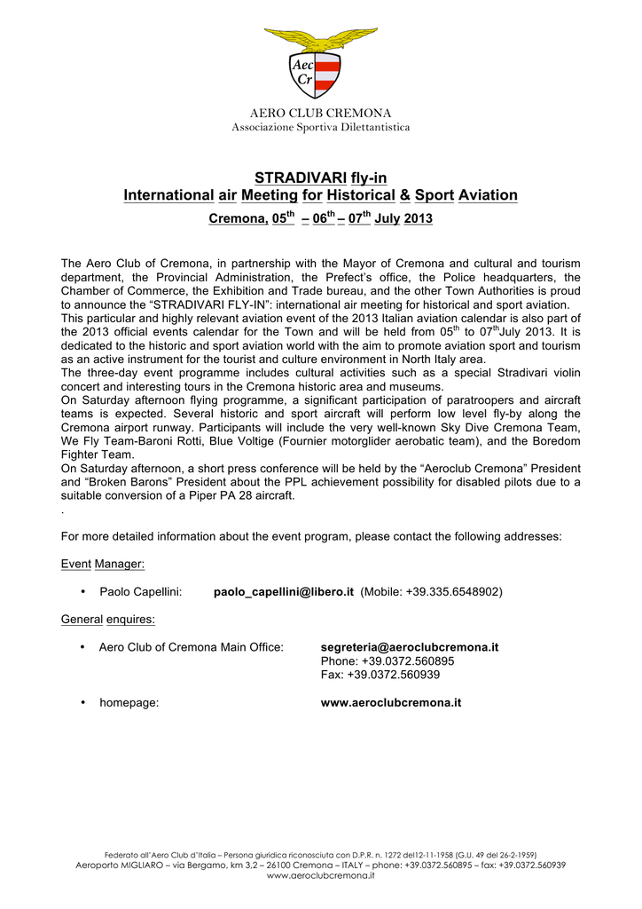 AERO CLUB CREMONA Associazione Sportiva Dilettantistica STRADIVARI fly-in International air Meeting for Historical & Sport Aviation Cremona, 05th – 06th – 07th July 2013 The Aero Club of Cremona, in partnership with the Mayor of Cremona and cultural and tourism department, the Provincial Administration, the Prefect’s office, the Police headquarters, the Chamber of Commerce, the Exhibition and Trade bureau, and the other Town Authorities is proud to announce the “STRADIVARI FLY-IN”: international air meeting for historical and sport aviation. This particular and highly relevant aviation event of the 2013 Italian aviation calendar is also part of the 2013 official events calendar for the Town and will be held from 05th to 07thJuly 2013. It is dedicated to the historic and sport aviation world with the aim to promote aviation sport and tourism as an active instrument for the tourist and culture environment in North Italy area. The three-day event programme includes cultural activities such as a special Stradivari violin concert and interesting tours in the Cremona historic area and museums. On Saturday afternoon flying programme, a significant participation of paratroopers and aircraft teams is expected. Several historic and sport aircraft will perform low level fly-by along the Cremona airport runway. Participants will include the very well-known Sky Dive Cremona Team, We Fly Team-Baroni Rotti, Blue Voltige (Fournier motorglider aerobatic team), and the Boredom Fighter Team. On Saturday afternoon, a short press conference will be held by the “Aeroclub Cremona” President and “Broken Barons” President about the PPL achievement possibility for disabled pilots due to a suitable conversion of a Piper PA 28 aircraft. . For more detailed information about the event program, please contact the following addresses: Event Manager: • Paolo Capellini: [email protected] (Mobile: +39.335.6548902) General enquires: • Aero Club of Cremona Main Office: [email protected] Phone: +39.0372.560895 Fax: +39.0372.560939 • homepage: www.aeroclubcremona.it Federato all’Aero Club d’Italia – Persona giuridica riconosciuta con D.P.R. n. 1272 del12-11-1958 (G.U. 49 del 26-2-1959) Aeroporto MIGLIARO – via Bergamo, km 3,2 – 26100 Cremona – ITALY – phone: +39.0372.560895 – fax: +39.0372.560939 www.aeroclubcremona.it AERO CLUB CREMONA Associazione Sportiva Dilettantistica STRADIVARI fly-in International air meeting for historical & sport aviation Cremona, 05th – 06th – 07th July 2013 Event programme Friday, 05th July 2013 • • • from 15:00 = > Aircraft arrival and crew registration (*) 20:00 => Happy hour with dinner and musical concert inside Cremona town museum 23:00 => Hotel transfer (*) All fly-in registered participants will be allowed to camp at the airport with their own equipment, if desired Saturday, 06th July 2013 Morning: • • • • 10:00 11:00 12:00 13:00 => Cremona Mayor welcome and concert of Stradivari violin at the Civic Museum => Visit to picture gallery and Stradivarian Museum of Cremona => Short tour around the centre of the town => Lunch at Airfield Restaurant “Al Volo” Afternoon: • • • • • • • 15:00 => Optional bike ride along the Naviglio small river (near the airport) 16:30 => Sky Team Parachute competiton ending. 17:00 => Official launch of “Broken Barons” PPL licence achievement by Aeroclub Cremona flying school. 17:30 => We Fly Team – Blue Voltige – Boredom Fighter air display. 18:30 => Endurance competition starting of VFR Meeting aircraft participants. 19:00 => Transfer by bus or fly to dinner and evening entertainment at Cà del Conte airstrip (50 Km away on the Appenins, by route, from Cremona) 23:30 => Hotel transfer to Cremona or Camping at Cà del Conte airfield. Federato all’Aero Club d’Italia – Persona giuridica riconosciuta con D.P.R. n. 1272 del12-11-1958 (G.U. 49 del 26-2-1959) Aeroporto MIGLIARO – via Bergamo, km 3,2 – 26100 Cremona – ITALY – phone: +39.0372.560895 – fax: +39.0372.560939 www.aeroclubcremona.it AERO CLUB CREMONA Associazione Sportiva Dilettantistica Sunday, 07th July 2013 Morning: • 10:00 => Aircraft departures. Programme could change depending on weather condition and aircraft availability For more detailed information about the event programme, please contact the following addresses: Event Manager: • Paolo Capellini: [email protected] (Mobile: +39.335.6548902) General enquires: • Aero Club of Cremona Main Office: [email protected] Phone: +39.0372.560895 Fax: +39.0372.560939 • homepage: www.aeroclubcremona.it Federato all’Aero Club d’Italia – Persona giuridica riconosciuta con D.P.R. n. 1272 del12-11-1958 (G.U. 49 del 26-2-1959) Aeroporto MIGLIARO – via Bergamo, km 3,2 – 26100 Cremona – ITALY – phone: +39.0372.560895 – fax: +39.0372.560939 www.aeroclubcremona.it