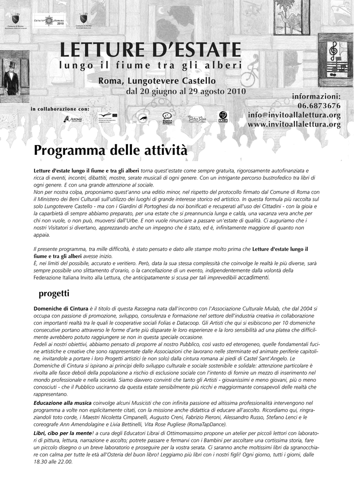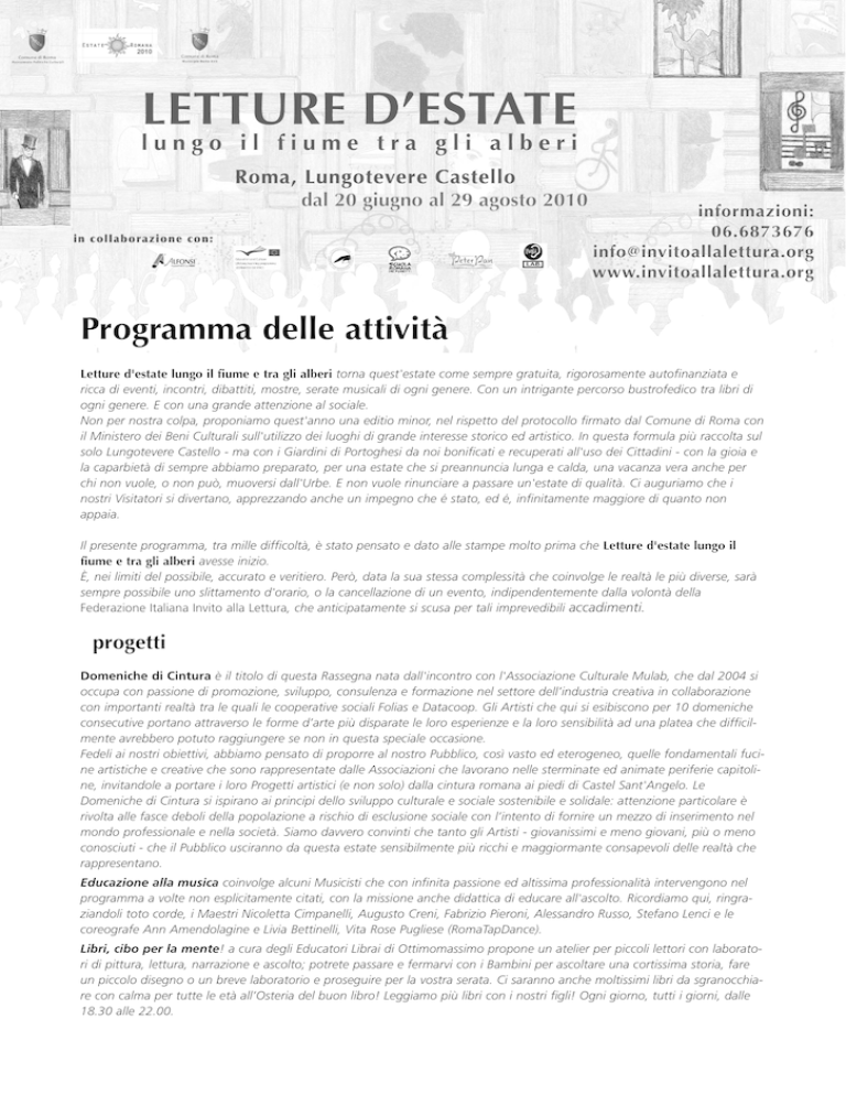 Programma delle attività Letture d'estate lungo il fiume e tra gli alberi torna quest'estate come sempre gratuita, rigorosamente autofinanziata e ricca di eventi, incontri, dibattiti, mostre, serate musicali di ogni genere. Con un intrigante percorso bustrofedico tra libri di ogni genere. E con una grande attenzione al sociale. Non per nostra colpa, proponiamo quest'anno una editio minor, nel rispetto del protocollo firmato dal Comune di Roma con il Ministero dei Beni Culturali sull'utilizzo dei luoghi di grande interesse storico ed artistico. In questa formula più raccolta sul solo Lungotevere Castello - ma con i Giardini di Portoghesi da noi bonificati e recuperati all'uso dei Cittadini - con la gioia e la caparbietà di sempre abbiamo preparato, per una estate che si preannuncia lunga e calda, una vacanza vera anche per chi non vuole, o non può, muoversi dall'Urbe. E non vuole rinunciare a passare un'estate di qualità. Ci auguriamo che i nostri Visitatori si divertano, apprezzando anche un impegno che é stato, ed é, infinitamente maggiore di quanto non appaia. Il presente programma, tra mille difficoltà, è stato pensato e dato alle stampe molto prima che Letture d'estate lungo il fiume e tra gli alberi avesse inizio. È, nei limiti del possibile, accurato e veritiero. Però, data la sua stessa complessità che coinvolge le realtà le più diverse, sarà sempre possibile uno slittamento d'orario, o la cancellazione di un evento, indipendentemente dalla volontà della Federazione Italiana Invito alla Lettura, che anticipatamente si scusa per tali imprevedibili accadimenti. progetti Domeniche di Cintura è il titolo di questa Rassegna nata dall'incontro con l'Associazione Culturale Mulab, che dal 2004 si occupa con passione di promozione, sviluppo, consulenza e formazione nel settore dell’industria creativa in collaborazione con importanti realtà tra le quali le cooperative sociali Folias e Datacoop. Gli Artisti che qui si esibiscono per 10 domeniche consecutive portano attraverso le forme d’arte più disparate le loro esperienze e la loro sensibilità ad una platea che difficilmente avrebbero potuto raggiungere se non in questa speciale occasione. Fedeli ai nostri obiettivi, abbiamo pensato di proporre al nostro Pubblico, così vasto ed eterogeneo, quelle fondamentali fucine artistiche e creative che sono rappresentate dalle Associazioni che lavorano nelle sterminate ed animate periferie capitoline, invitandole a portare i loro Progetti artistici (e non solo) dalla cintura romana ai piedi di Castel Sant'Angelo. Le Domeniche di Cintura si ispirano ai principi dello sviluppo culturale e sociale sostenibile e solidale: attenzione particolare è rivolta alle fasce deboli della popolazione a rischio di esclusione sociale con l’intento di fornire un mezzo di inserimento nel mondo professionale e nella società. Siamo davvero convinti che tanto gli Artisti - giovanissimi e meno giovani, più o meno conosciuti - che il Pubblico usciranno da questa estate sensibilmente più ricchi e maggiormante consapevoli delle realtà che rappresentano. Educazione alla musica coinvolge alcuni Musicisti che con infinita passione ed altissima professionalità intervengono nel programma a volte non esplicitamente citati, con la missione anche didattica di educare all'ascolto. Ricordiamo qui, ringraziandoli toto corde, i Maestri Nicoletta Cimpanelli, Augusto Creni, Fabrizio Pieroni, Alessandro Russo, Stefano Lenci e le coreografe Ann Amendolagine e Livia Bettinelli, Vita Rose Pugliese (RomaTapDance). Libri, cibo per la mente! a cura degli Educatori Librai di Ottimomassimo propone un atelier per piccoli lettori con laboratori di pittura, lettura, narrazione e ascolto; potrete passare e fermarvi con i Bambini per ascoltare una cortissima storia, fare un piccolo disegno o un breve laboratorio e proseguire per la vostra serata. Ci saranno anche moltissimi libri da sgranocchiare con calma per tutte le età all’Osteria del buon libro! Leggiamo più libri con i nostri figli! Ogni giorno, tutti i giorni, dalle 18.30 alle 22.00. Sabato 19 giugno ) 19.00 Ø 19.00 ) 22.00 Marchitelli e Augusto Creni (chitarra), Lucio Villani (contrabbasso e voce). Recital di poesia e musica con Nicoletta Cimpanelli. La Mississipi Jazz School presenta Saggio di Fine Anno di tutti gli Allievi in Concerto. Oggi: gli Allievi dai 7 ai 14 anni. Segue la Piccola Orchestra d'Archi. Mercoledì 23 ) 18.30 Allenamento per la gara di Acrobatica Verbale. Stage a cura di Patrizia La Fonte. 21.30 Conversazione con il giocologo e matematico Ennio Peres sul tema Matematica ed illusioni. Nel corso della serata si parlerà anche di Win for life. La tassa sulla speranza, scritto con Riccardo Bersani ed edito da Iacobelli. 23.00 Fantasia Musicale con il maestro Stefano Lenci al pianoforte. Fantasia Musicale con il maestro Fabrizio Pieroni al pianoforte. Domenica 20 ) 21.30 Ø 19.00 Please...! me racconti l'America, di e con Marco Rea, accompagnato al pianoforte da Edoardo Simeone. Il monologo di tremarella è di Gianfranco Vergoni, le coreografie di Tip Tap sono di Giorgio de Bortoli. La Mississipi Jazz School presenta Saggio di Fine Anno di tutti gli Allievi in Concerto. Oggi: gli Allievi più grandi con i Laboratori di Musica d'insieme. Segue la l'Orchestra d'Archi ed il Coro, con un vasto repertorio classico, jazz, rock, gospel. d 21.00 Ø 21.00 ) ) Ø 21.00 Ø 21.30 La Scuola Romana dei Fumetti presenta Fumetti in Italia: i Classici. Incontro con gli autori che pubblicano per case editrici italiane, nomi storici del fumetto bonelliano (Brendon, Julia, Martin Mystère e altri ancora), performance di disegno dal vivo. Buscaja in Concerto, con Federico Scribani (voce), Alessandro Tomei (sassofono), Mario Caporilli (tromba), Emilio Merone (pianoforte), Francesco R. De Campos (contrabbasso), Alfredo Agli. Omaggio (ir)riverente a Fred Buscaglione. ) 18.30 Allenamento per la gara di Acrobatica Verbale. Stage a cura di Patrizia La Fonte. 21.00 Dedi
