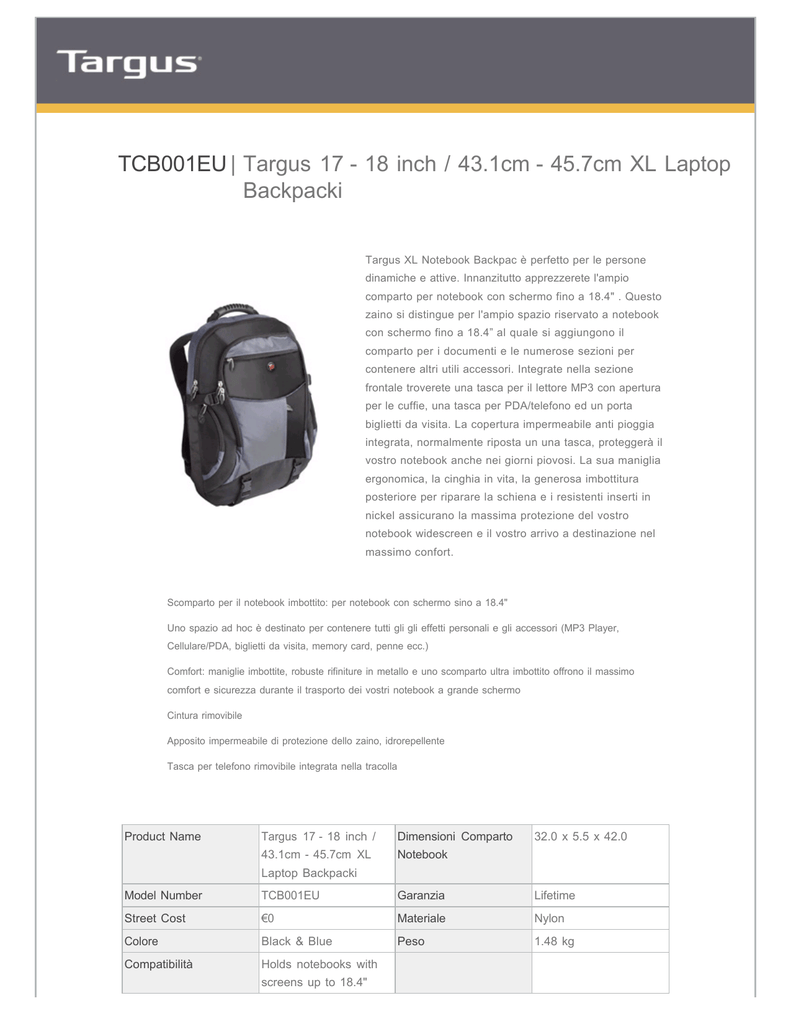 TCB001EU | Targus 17 - 18 inch / 43.1cm - 45.7cm XL Laptop Backpacki Targus XL Notebook Backpac è perfetto per le persone dinamiche e attive. Innanzitutto apprezzerete l'ampio comparto per notebook con schermo fino a 18.4" . Questo zaino si distingue per l'ampio spazio riservato a notebook con schermo fino a 18.4” al quale si aggiungono il comparto per i documenti e le numerose sezioni per contenere altri utili accessori. Integrate nella sezione frontale troverete una tasca per il lettore MP3 con apertura per le cuffie, una tasca per PDA/telefono ed un porta biglietti da visita. La copertura impermeabile anti pioggia integrata, normalmente riposta un una tasca, proteggerà il vostro notebook anche nei giorni piovosi. La sua maniglia ergonomica, la cinghia in vita, la generosa imbottitura posteriore per riparare la schiena e i resistenti inserti in nickel assicurano la massima protezione del vostro notebook widescreen e il vostro arrivo a destinazione nel massimo confort. Scomparto per il notebook imbottito: per notebook con schermo sino a 18.4" Uno spazio ad hoc è destinato per contenere tutti gli gli effetti personali e gli accessori (MP3 Player, Cellulare/PDA, biglietti da visita, memory card, penne ecc.) Comfort: maniglie imbottite, robuste rifiniture in metallo e uno scomparto ultra imbottito offrono il massimo comfort e sicurezza durante il trasporto dei vostri notebook a grande schermo Cintura rimovibile Apposito impermeabile di protezione dello zaino, idrorepellente Tasca per telefono rimovibile integrata nella tracolla Product Name Targus 17 - 18 inch / Dimensioni Comparto 43.1cm - 45.7cm XL Notebook 32.0 x 5.5 x 42.0 Laptop Backpacki Model Number TCB001EU Garanzia Lifetime Street Cost €0 Materiale Nylon Colore Black & Blue Peso 1.48 kg Compatibilità Holds notebooks with screens up to 18.4" Features, specifications and price are subject to change without notification.