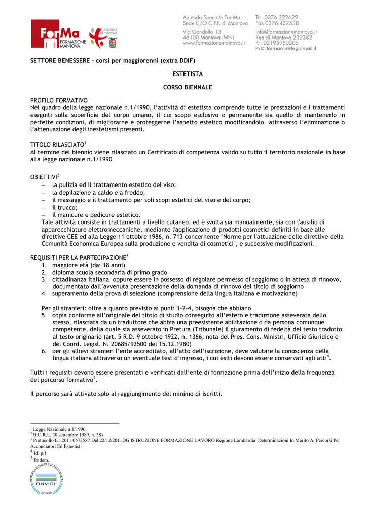 SETTORE BENESSERE - corsi per maggiorenni (extra DDIF) ESTETISTA CORSO BIENNALE PROFILO FORMATIVO Nel quadro della legge nazionale n.1/1990, l’attività di estetista comprende tutte le prestazioni e i trattamenti eseguiti sulla superficie del corpo umano, il cui scopo esclusivo o permanente sia quello di mantenerlo in perfette condizioni, di migliorarne e proteggerne l’aspetto estetico modificandolo attraverso l’eliminazione o l’attenuazione degli inestetismi presenti. TITOLO RILASCIATO1 Al termine del biennio viene rilasciato un Certificato di competenza valido su tutto il territorio nazionale in base alla legge nazionale n.1/1990 OBIETTIVI2 la pulizia ed il trattamento estetico del viso; la depilazione a caldo e a freddo; il massaggio e il trattamento per soli scopi estetici del viso e del corpo; il trucco; il manicure e pedicure estetico. Tale attività consiste in trattamenti a livello cutaneo, ed è svolta sia manualmente, sia con l'ausilio di apparecchiature elettromeccaniche, mediante l'applicazione di prodotti cosmetici definiti in base alle direttive CEE ed alla Legge 11 ottobre 1986, n. 713 concernente "Norme per l'attuazione delle direttive della Comunità Economica Europea sulla produzione e vendita di cosmetici", e successive modificazioni. REQUISITI PER LA PARTECIPAZIONE3 1. maggiore età (dai 18 anni) 2. diploma scuola secondaria di primo grado 3. cittadinanza italiana oppure essere in possesso di regolare permesso di soggiorno o in attesa di rinnovo, documentato dall’avvenuta presentazione della domanda di rinnovo del titolo di soggiorno 4. superamento della prova di selezione (comprensione della lingua italiana e motivazione) Per gli stranieri: oltre a quanto previsto ai punti 1-2-4, bisogna che abbiano 5. copia conforme all’originale del titolo di studio conseguito all’estero e traduzione asseverata dello stesso, rilasciata da un traduttore che abbia una preesistente abilitazione o da persona comunque competente, della quale sia asseverato in Pretura (Tribunale) il giuramento di fedeltà del testo tradotto al testo originario (art. 5 R.D. 9 ottobre 1922, n. 1366; nota del Pres. Cons. Ministri, Ufficio Giuridico e del Coord. Legisl. N. 20685/92500 del 15.12.1980) 6. per gli allievi stranieri l’ente accreditato, all’atto dell’iscrizione, deve valutare la conoscenza della lingua italiana attraverso un eventuale test d’ingresso, i cui esiti devono essere conservati agli atti4. Tutti i requisiti devono essere presentati e verificati dall’ente di formazione prima dell’inizio della frequenza del percorso formativo5. Il percorso sarà attivato solo al raggiungimento del minimo di iscritti. 1 Legge Nazionale n.1/1990 B.U.R.L. 20 settembre 1989, n. 38) 3 Protocollo E1.2011.0573587 Del 22/12/2011DG ISTRUZIONE FORMAZIONE LAVORO Regione Lombardia Determinazioni In Merito Ai Percorsi Per Acconciatori Ed Estestisti 4 Id. p.1 5 Ibidem. 2 DURATA DEL PERCORSO6 Primo anno: 900 ore (600 ore di teoria/pratica + 300 ore di stage) Secondo anno: 900 ore (600 ore di teoria/pratica + 300 ore di stage) La frequenza è obbligatoria al 75% per ogni annualità: assenze superiori al 25% nel primo anno escluderanno il candidato dal passaggio ad anno successivo, assenze superiori al 25% nel secondo anno precludono all’esame finale con la Commissione esterna. Se l’allievo è al contempo dipendente di un’azienda del settore, il tirocinio deve essere svolto al di fuori delle ore di lavoro e in una sede diversa) L’istituzione formativa potrà definire dei piani di studio personalizzati che tengano conto delle competenze, abilità e conoscenze possedute dall’allievo al momento dell’iscrizione al percorso formativo. Al termine del percorso formativo gli allievi risultati frequentanti dovranno sostenere l’esame finale sulle competenze complessive previste dallo standard formativo della figura di estetista parimenti agli allievi frequentanti il percorso di qualifica ordinario. ORARIO Da lunedì al giovedì 17.30-22.30 e alcuni sabati stabiliti preventivamente (durata stimata del percorso teorico in aula: 8/10 mesi+ esame finale). Gli orari e le modalità dello stage verranno definiti in base alle possibilità delle aziende ospitanti. Possono essere programmate alcune visite e partecipazioni ad eventi di settore (es.Cosmoprof, visite aree termali, aziende specializzate). Tali iniziative sono parte integrante del percorso formativo. PROGRAMMA DEL CORSO7 Materie fondamentali di insegnamento teorico-pratico: A) FORMAZIONE AL RUOLO a. psicologia e cultura generale b. etica professionale, sicurezza del lavoro e nozioni di diritto sulle materie contrattuali e del lavoro c. nozioni di organizzazione aziendale e di disciplina di settore per l’esercizio dell’attività d. lingua straniera (INGLESE) B) FORMAZIONE ALLA PROFESSIONALITÀ a. nozioni di chimica con riferimento alla chimica cosmetologica b. nozioni di fisiologia, anatomia, dermatologia c. nozioni di igiene e alimentazione d. tecnica professionale e fisica applicata e. laboratorio, con particolare riferimento al massaggio estetico del corpo, estetica, trucco e visagismo Professionalità coinvolte: Coordinatore del corso: esperienza almeno triennale nella pratica professionale o didattica nell’attività di acconciatore; Docenti: esperienza comprovata nella pratica professionale o didattica nella materia di riferimento 8 ESAME FINALE L’esame viene assolto al termine del percorso organizzato dall’Ente di formazione, dinanzi a una commissione di esame designata dall’esterno. 6 Protocollo E1.2011.0573587 Del 22/12/2011DG ISTRUZIONE FORMAZIONE LAVORO Regione Lombardia Determinazioni In Merito Ai Percorsi Per Acconciatori Ed Estetisti 7 D.M. 21/03/199 N.352 regolamento recante i contenuti tecnico-culturali dei programmi, dei corsi e delle prove di esame al fine del prosdeguimento della qualifica professionale di estetista 8 D.d.g. 13 novembre 2012 - n. 10187 - rif. Requisiti e procedure per l’iscrizione all’Albo R