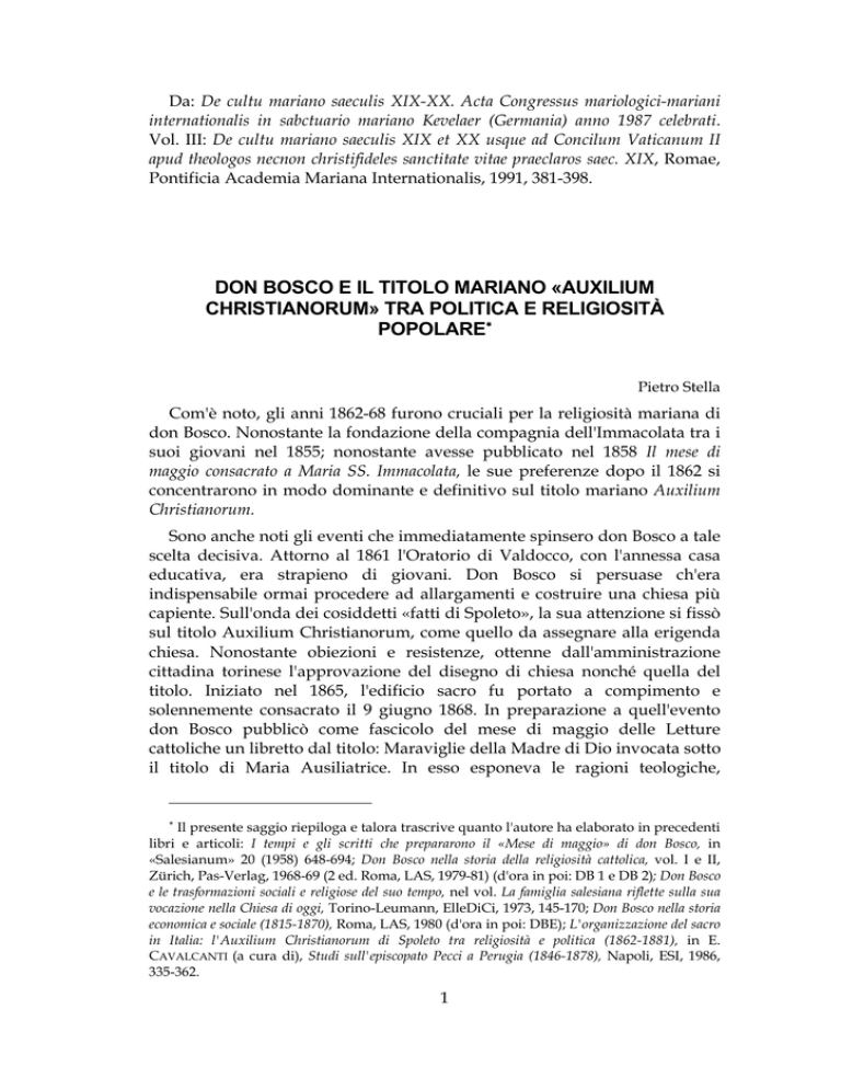 Da: De cultu mariano saeculis XIX-XX. Acta Congressus mariologici-mariani internationalis in sabctuario mariano Kevelaer (Germania) anno 1987 celebrati. Vol. III: De cultu mariano saeculis XIX et XX usque ad Concilum Vaticanum II apud theologos necnon christifideles sanctitate vitae praeclaros saec. XIX, Romae, Pontificia Academia Mariana Internationalis, 1991, 381-398. DON BOSCO E IL TITOLO MARIANO «AUXILIUM CHRISTIANORUM» TRA POLITICA E RELIGIOSITÀ POPOLARE∗ Pietro Stella Com'è noto, gli anni 1862-68 furono cruciali per la religiosità mariana di don Bosco. Nonostante la fondazione della compagnia dell'Immacolata tra i suoi giovani nel 1855; nonostante avesse pubblicato nel 1858 Il mese di maggio consacrato a Maria SS. Immacolata, le sue preferenze dopo il 1862 si concentrarono in modo dominante e definitivo sul titolo mariano Auxilium Christianorum. Sono anche noti gli eventi che immediatamente spinsero don Bosco a tale scelta decisiva. Attorno al 1861 l'Oratorio di Valdocco, con l'annessa casa educativa, era strapieno di giovani. Don Bosco si persuase ch'era indispensabile ormai procedere ad allargamenti e costruire una chiesa più capiente. Sull'onda dei cosiddetti «fatti di Spoleto», la sua attenzione si fissò sul titolo Auxilium Christianorum, come quello da assegnare alla erigenda chiesa. Nonostante obiezioni e resistenze, ottenne dall'amministrazione cittadina torinese l'approvazione del disegno di chiesa nonché quella del titolo. Iniziato nel 1865, l'edificio sacro fu portato a compimento e solennemente consacrato il 9 giugno 1868. In preparazione a quell'evento don Bosco pubblicò come fascicolo del mese di maggio delle Letture cattoliche un libretto dal titolo: Maraviglie della Madre di Dio invocata sotto il titolo di Maria Ausiliatrice. In esso esponeva le ragioni teologiche, ∗ Il presente saggio riepiloga e talora trascrive quanto l'autore ha elaborato in precedenti libri e articoli: I tempi e gli scritti che prepararono il «Mese di maggio» di don Bosco, in «Salesianum» 20 (1958) 648-694; Don Bosco nella storia della religiosità cattolica, vol. I e II, Zürich, Pas-Verlag, 1968-69 (2 ed. Roma, LAS, 1979-81) (d'ora in poi: DB 1 e DB 2); Don Bosco e le trasformazioni sociali e religiose del suo tempo, nel vol. La famiglia salesiana riflette sulla sua vocazione nella Chiesa di oggi, Torino-Leumann, ElleDiCi, 1973, 145-170; Don Bosco nella storia economica e sociale (1815-1870), Roma, LAS, 1980 (d'ora in poi: DBE); L'organizzazione del sacro in Italia: l'Auxilium Christianorum di Spoleto tra religiosità e politica (1862-1881), in E. CAVALCANTI (a cura di), Studi sull'episcopato Pecci a Perugia (1846-1878), Napoli, ESI, 1986, 335-362. 1 scritturistiche, storiche e contingenti che motivavano la scelta di quel titolo.1 Le argomentazioni erano compendiate nelle pagine introduttive. Attingendo all'apologista francese Auguste Nicolas e citando espressamente l'autorità di Mons. Parisis, arcivescovo di Parigi, don Bosco asseriva che era ormai la Chiesa stessa a volere «negli ultimi tempi segnalare il titolo di Auxilium Christianorum»; si era infatti epoca di «crisi straordinarie»: «Il bisogno oggi universalmente sentito di invocare Maria non è particolare, ma generale; non sono più tiepidi da infervorare, peccatori da convertire, innocenti da conservare [...]. Ma è la stessa Chiesa Cattolica che è assalita. È assalita nelle sue funzioni, nelle sacre sue istituzioni, nel suo capo, nella sua dottrina, nella sua disciplina; è assalita come Chiesa Cattolica, come centro della verità, come maestra di tutti i fedeli». Appunto per questo, aggiungeva don Bosco, «per meritarsi una speciale protezione del Cielo [...] si ricorre a Maria, come madre comune, come speciale ausiliatrice dei re e dei popoli, come cattolici di tutto il mondo».2 Le argomentazioni di DB sono esposte sinteticamente da P. BROCARDO, San Giovanni Bosco apostolo del titolo «Auxilium christianorum», nel volume collettaneo L'Ausiliatrice nel domma e nel culto. Relazioni presentate al Congresso Mariologico internazionale (Roma l950), (Biblioteca del «Salesianum», 13), Torino, SEI, 1950, 35-90; e riassunte dallo stesso P. Brocardo nel breve saggio: Don Bosco teologo popolare dell'Ausiliatrice, in Accademia Mariana Salesiana, L'Ausiliatrice della Chiesa e del papa. Relazioni commemorative per il cinquantenario dell'incoronazione di Maria «Auxilium christianorum» nella sua basilica in Torino 1903-17 maggio 1953, Torino, SEI, 1953, 157-167. 1 BOSCO, Maraviglie della Madre di Dio invocata sotto il titolo di Maria Ausiliatrice..., Torino, tip. dell'Oratorio di S. Francesco di Sales, 1868, 6s. La citazione «(Nicolas, pagina 121)» è da completare così: NICOLAS A., La Vergine Maria vivente nella chiesa. Nuovi studi-filosofici sul cristianesimo, pt. I, lib. I, cap. 5, § 2; ed. Torino, Biblioteca ecclesiastica editrice, 1863. Auguste Nicolas polemizza in questa parte contro l'accusa di «Marianismo» della Chiesa cattolica, formulata dopo la definizione dogmatica dell'Immacolata Concezione da JeanBaptiste Bordas-Demoulin (1798-1859), un filosofo ideologo tardo fautore del giansenismo portorealista. I libri terzo e quarto del Nicolas contengono una «esposizione storica» e una «esposizione sociale» del culto della Vergine. Ma per l'elaborazione di Maraviglie don Bosco, come ho avuto modo di notare (cf DB 1, 239; 2, 150) si giovò di altre fonti e affidò il lavoro compilativo a don Giulio Barberis e ad altri chierici. I primi capitoli (Maria riconosciuta con simboli aiuto del genere umano; Maria dimostrata aiuto dei cristiani dall'arcangelo Gabriele, ecc.) attingono, senza citare, a JOSÉ DE SAN MIGUEL Y BARCO, domenicano, Biblia mariana ex pluribus divinarum scrìpturarum commentariìs excerpta..., Genuae, ex typ. Lertiana, 1749; i capitoli V-VII (divozione de' cristiani primitivi alla Santa Vergine Maria, ecc.), sono tratti dall'opera del domenicano polacco JUSTINUS MIECHOVIENSIS, Discursus 