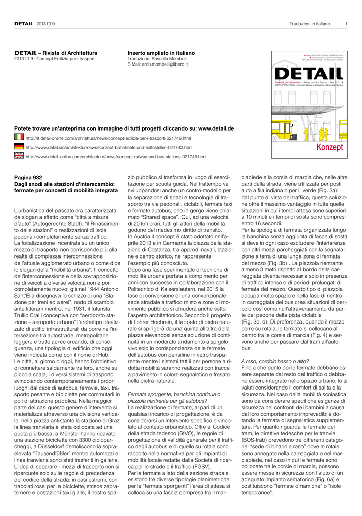 ∂ 2013 ¥ 9 ∂ – Rivista di Architettura 2013 ¥ 9 · Concept Edilizia per i trasporti Traduzioni in italiano1 Inserto ampliato in italiano Traduzione: Rossella Mombelli E-Mail: [email protected] ‡ Verkehrsbauten für integrierte Mobilitätskonzepte ‡ Trambahnstation, U-Bahnhof, Busterminal ‡ Hauptbahnhof Salzburg – Synthese aus Alt und Neu Bahnhöfe und Haltestellen · Railway and Bus Stations · Serie 2013 · 9 Zeitschrift für Architektur + Konzept · Review of Architecture · Revue d’Architecture Potete trovare un’anteprima con immagine di tutti progetti cliccando su: www.detail.de http://it.detail-online.com/architettura/news/concept-edilizia-per-i-trasporti-021746.html http://www.detail.de/architektur/news/konzept-bahnhoefe-und-haltestellen-021742.html Konzept http://www.detail-online.com/architecture/news/concept-railway-and-bus-stations-021745.html Pagina 932 Dagli snodi alle stazioni d’interscambio: fermate per concetti di mobilità integrata L’urbanistica del passato era caratterizzata da slogan a effetto come “città a misura d’auto” (Autogerechte Stadt), “il Rinascimento delle stazioni” o realizzazioni di isole pedonali completamente senza traffico. La focalizzazione incentrata su un unico mezzo di trasporto non corrisponde più alla realtà di complessa interconnessione dell’attuale agglomerato urbano o come dice lo slogan della “mobilità urbana”. Il concetto dell’interconnessione e della sovrapposizione di veicoli a diverse velocità non è poi completamente nuovo: già nel 1944 Antonio Sant’Elia disegnava lo schizzo di una “Stazione per treni ed aerei”, nodo di scambio ante litteram mentre, nel 1931, il futurista Trullio Cralli concepiva con “aeroporto stazione – aeroporto urbano” l’archetipo idealizzato di edifici infrastrutturali da porre nell’intersezione tra autostrade, metropolitane leggere e tratte aeree creando, di conseguenza, una tipologia di edificio che oggi viene indicata come con il nome di Hub. Le città, al giorno d’oggi, hanno l’obbiettivo di connettere saldamente tra loro, anche su piccola scala, i diversi sistemi di trasporto svincolando contemporaneamente i propri luoghi dal caos di autobus, ferrovie, taxi, trasporto pesante e biciclette per commutarli in poli di attrazione pubblica. Nella maggior parte dei casi questo genere d’intervento si materializza attraverso una divisione verticale: nella piazza antistante la stazione di Graz la linea tranviaria è stata collocata ad una quota più bassa, a Münster hanno ricavato una stazione biciclette con 3300 cicloparcheggi, a Düsseldorf demoliscono la sopraelevata “Tausendfüßler” mentre automezzi e linea tranviaria sono stati trasferiti in galleria. L’idea di separare i mezzi di trasporto non si ripercuote solo sulle regole di precedenza del codice della strada: in casi estremi, con tracciati rossi per le biciclette, strisce zebrate nere e postazioni taxi gialle, il nostro spa- zio pubblico si trasforma in luogo di esercitazione per scuola guida. Nel frattempo va sviluppandosi anche un contro-modello per la separazione di spazi e tecnologie di trasporto tra vie pedonali, ciclabili, fermate taxi e fermate autobus, che in gergo viene chiamato “Shared space”. Qui, ad una velocità di 20 km orari, tutti gli attori della mobilità godono del medesimo diritto di transito. In Austria il concept è stato adottato nell’aprile 2013 e in Germania la piazza della stazione di Costanza, tra approdi navali, stazione e centro storico, ne rappresenta l’esempio più conosciuto. Dopo una fase sperimentale di tecniche di mobilità urbana portata a compimento per anni con successo in collaborazione con il Politecnico di Kaiserslautern, nel 2015 la fase di conversione di una convenzionale sede stradale a traffico misto e zone di movimento pubblico si chiuderà anche sotto l’aspetto architettonico. Secondo il progetto di Lohrer Hochrein, il tappeto di pietra naturale si spingerà da una quinta all’altra della piazza elevandosi senza soluzione di continuità in un moderato andamento a spigolo vivo solo in corrispondenza delle fermate dell’autobus con pensiline in vetro trasparente mentre i sistemi tattili per persone a ridotta mobilità saranno realizzati con tracce a pavimento in colore segnaletico e fresate nella pietra naturale. Fermata sporgente, banchina continua o piazzola rientrante per gli autobus? La realizzazione di fermate, al pari di un qualsiasi incarico di progettazione, è da considerarsi un intervento specifico e vincolato al contesto urbanistico. Oltre al Codice della strada tedesco (StVO), le regole di progettazione di validità generale per il traffico degli autobus e di quello su rotaia sono raccolte nella normativa per gli impianti di mobilità locale redatte dalla Società di ricerca per le strade e il traffico (FGSV). Per le fermate a lato della sezione stradale esistono tre diverse tipologie planimetriche: per le “fermate sporgenti” l’area di attesa si colloca su una fascia compresa tra il mar- ciapiede e la corsia di marcia che, nelle altre parti della strada, viene utilizzata per posti auto a fila indiana o per il verde (Fig. 3a): dal punto di vista del traffico, questa soluzione offre il massimo vantaggio in tutte quelle situazioni in cui i tempi attesa sono superiori a 10 minuti e i tempi di sosta sono compresi entro 16 secondi. Per la tipologia di fermata organizzata lungo la banchina senza aggiunta di fasce di sosta si deve in ogni caso escludere l’interferenza con altri mezzi parcheggiati con la segnalazione a terra di una lunga zona di fermata del mezzo (Fig. 3b) . La piazzola rientrante almeno 3 metri rispetto al bordo della carreggiata diventa necessaria solo in presenza di traffico intenso o di periodi prolungati di fermata del mezzo. Questo tipo di piazzola occupa molto spazio e nella fase di rientro in carreggiata del bus crea situazioni di pericolo così come nell’attraversamento da parte del pedone de